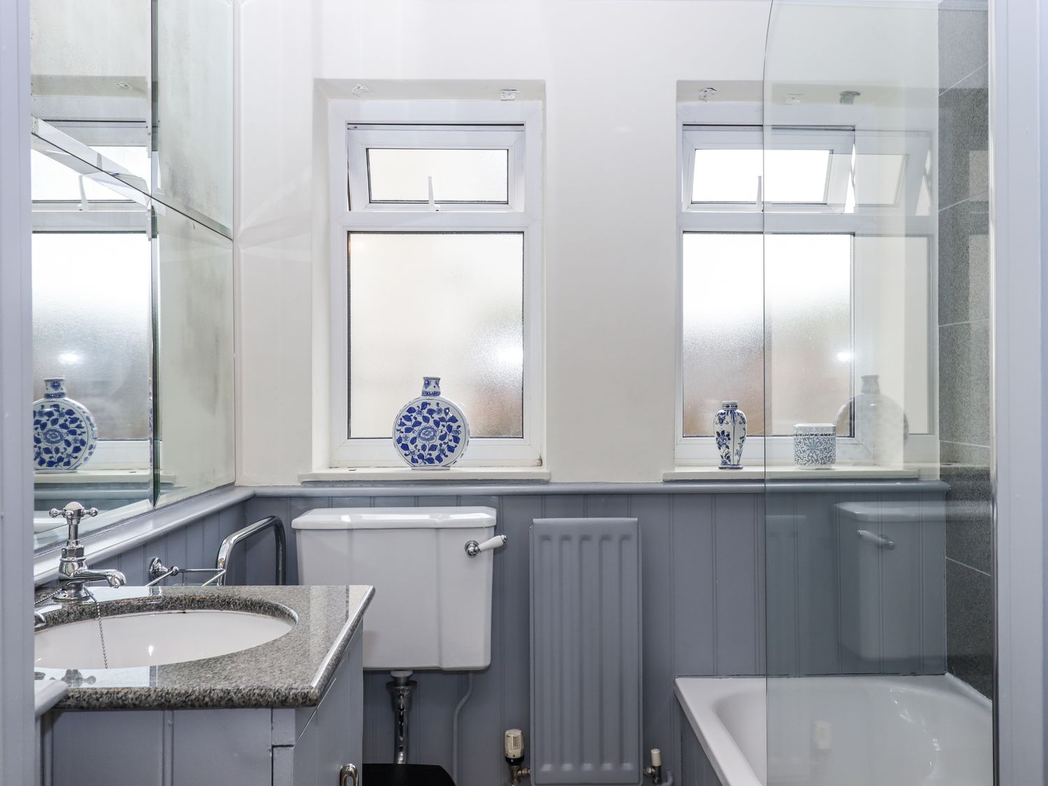 "Two bedrooms: 1 x super-king-size with TV, 1 x ground-floor single. Bathroom with bath, shower over, basin and WC. Cloakroom with basin and WC. Kitchen/diner. Sitting room with woodburner "