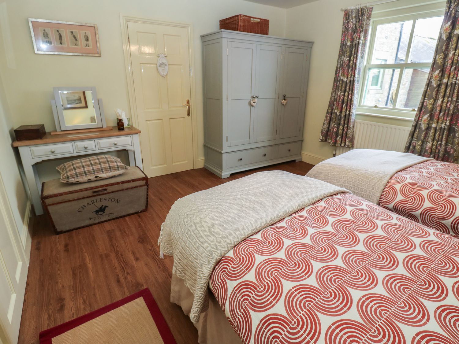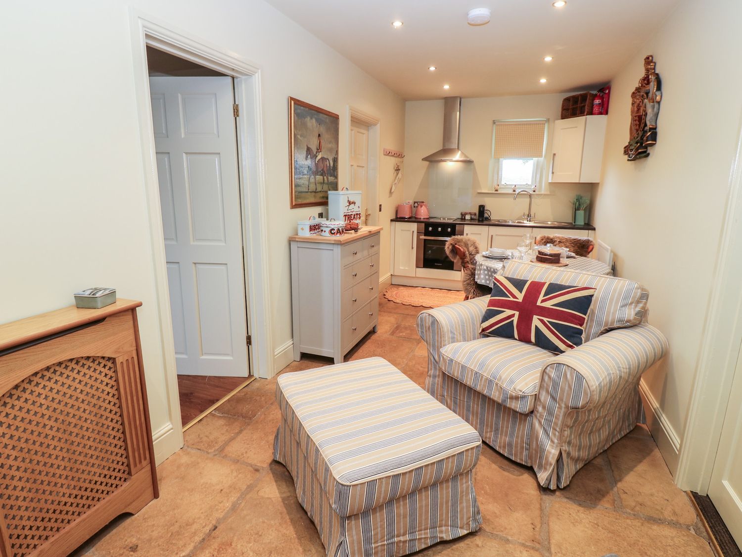 "Single-storey. One twin bedroom (zip/link, can be super-king-size on request). Bathroom with bath, handheld shower, basin and WC. Open-plan living space with kitchen, dining and sitting area"