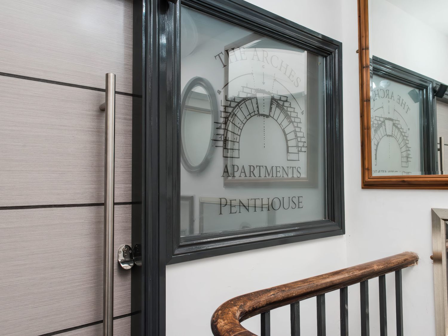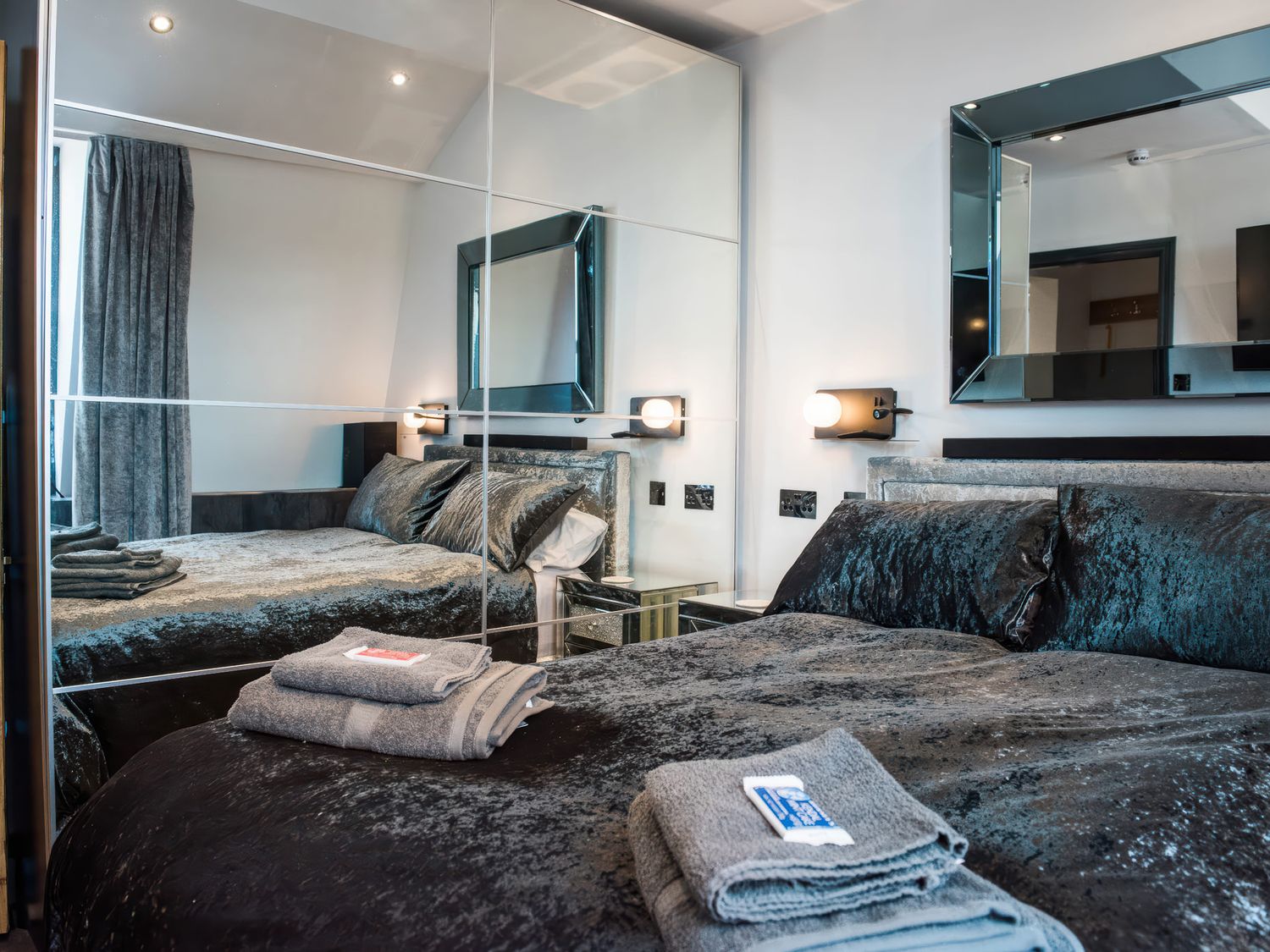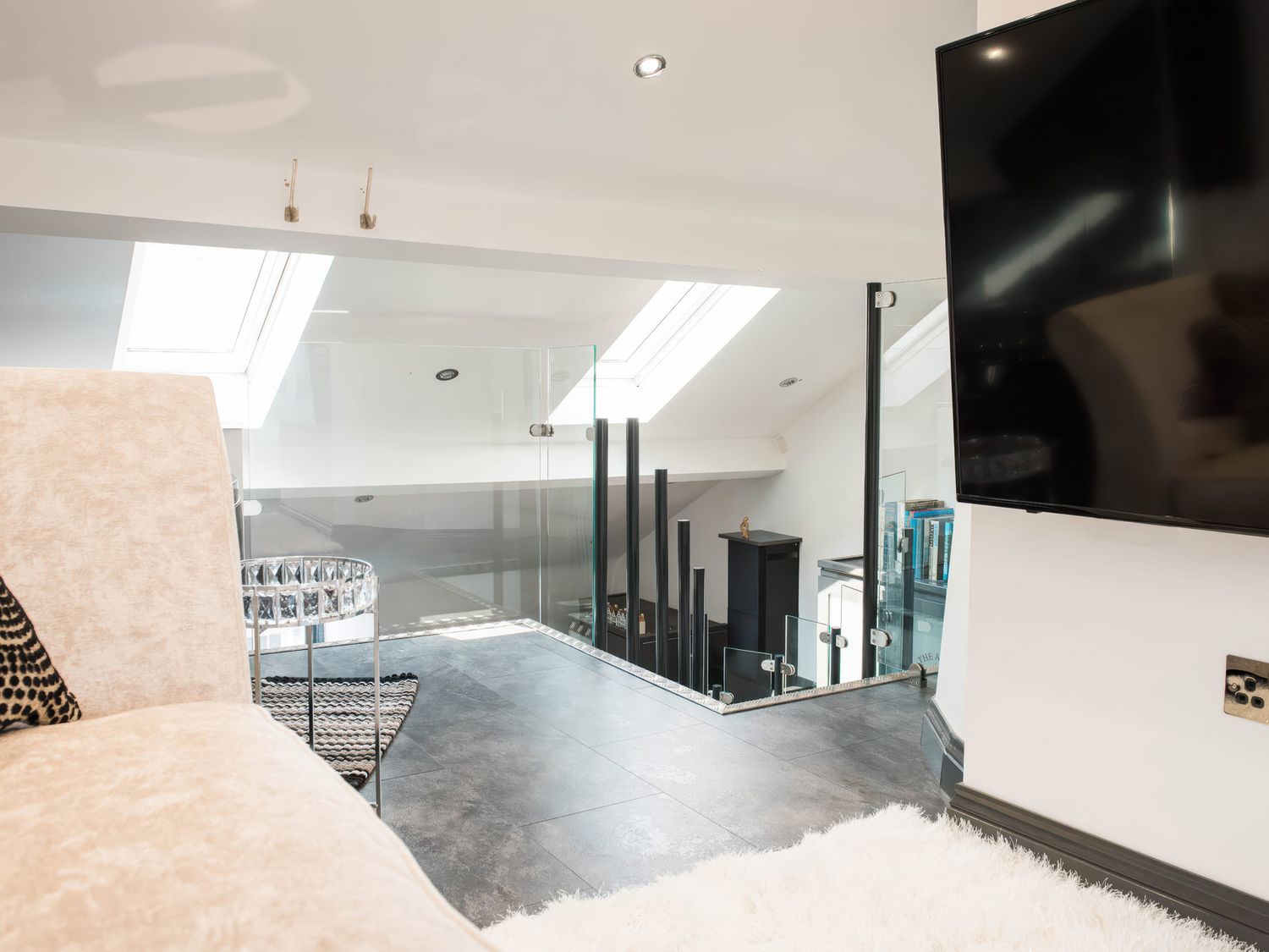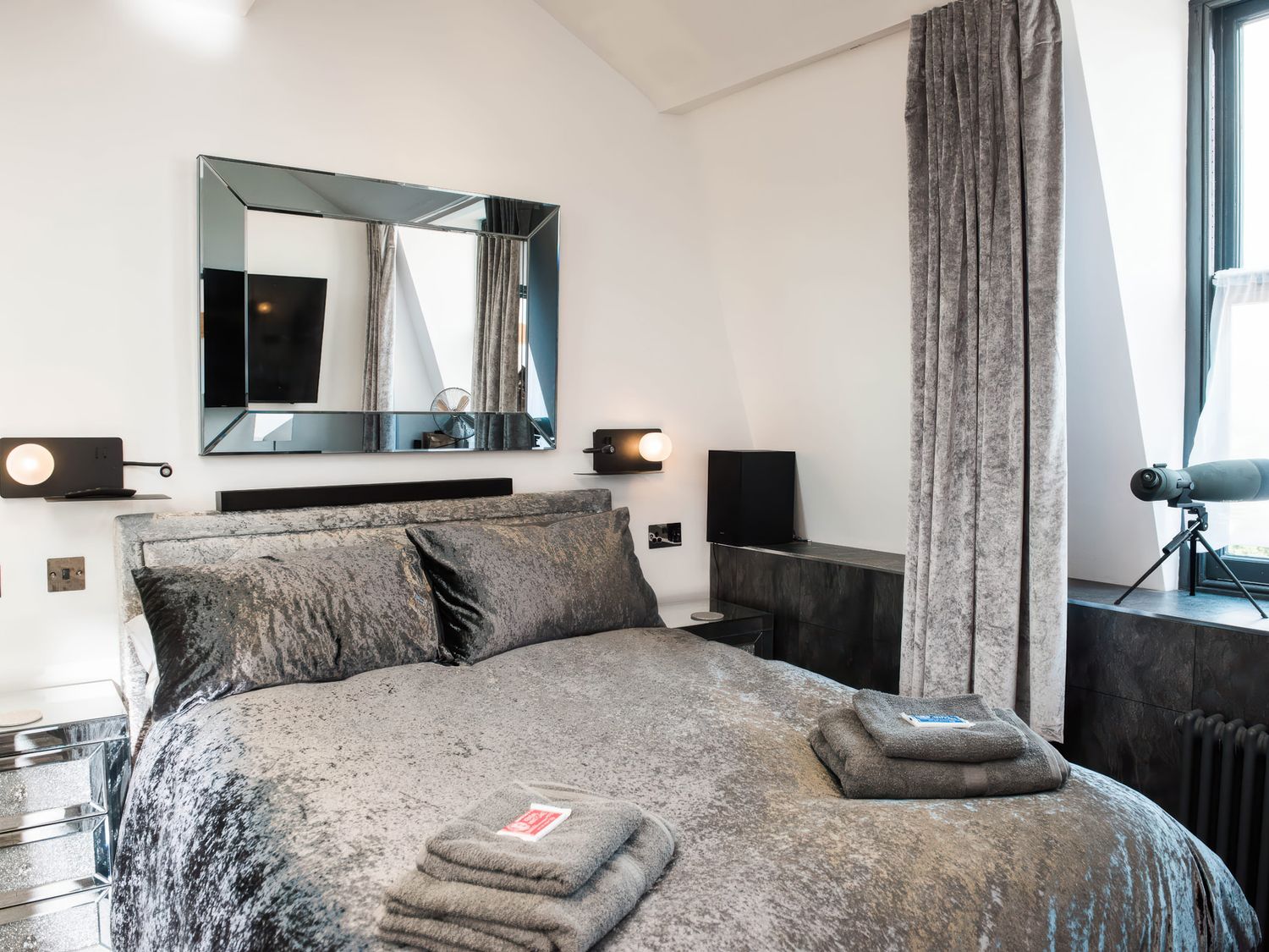 "Top-floor, two-storey apartment. Two ground-floor double bedrooms with Smart TVs. Ground-floor shower room with with twin rainfall walk-in shower, basin, WC. First-floor sitting room with jacuzzi bath. Open-plan living space with kitchen, dining area, and sitting area"