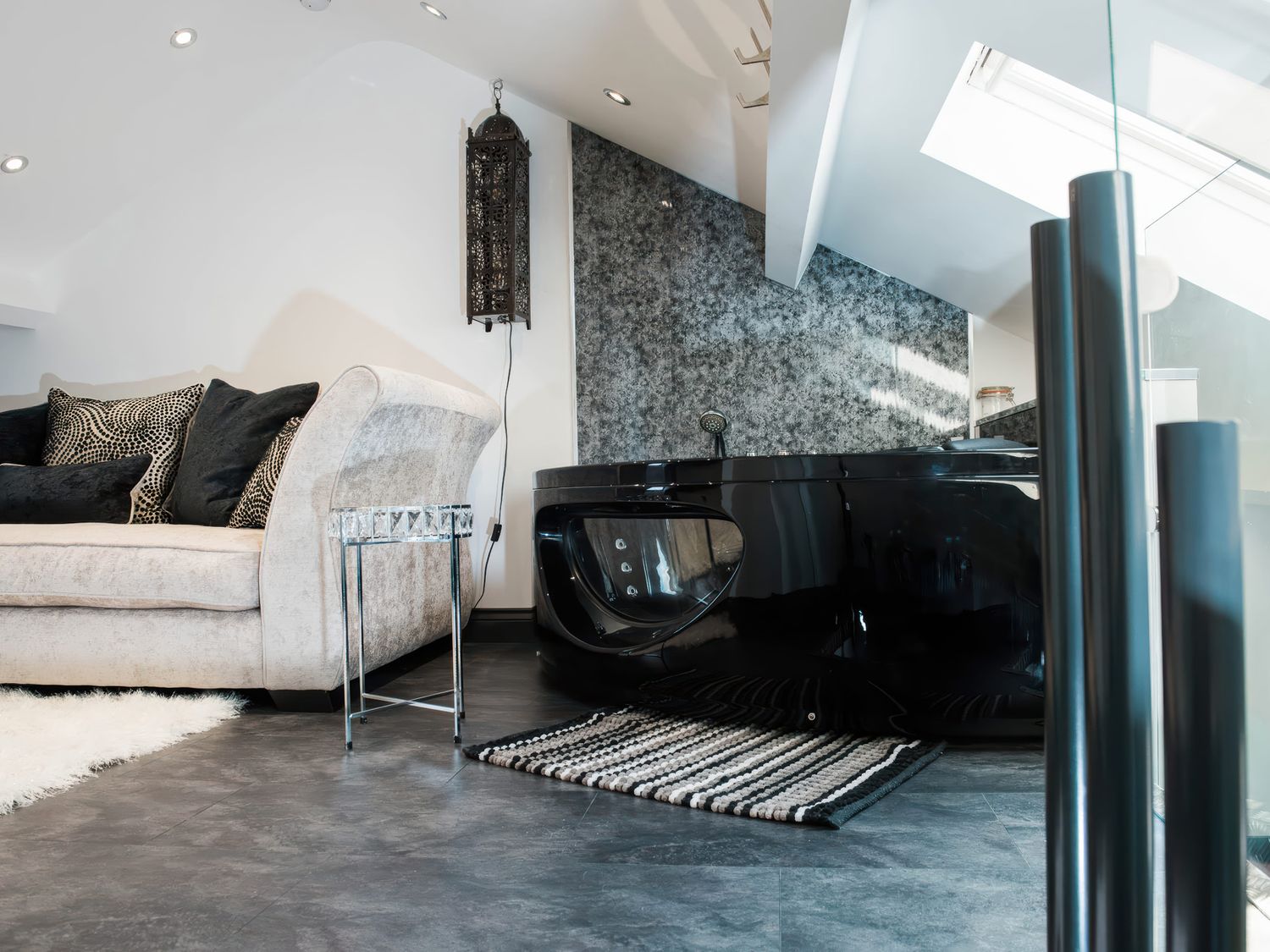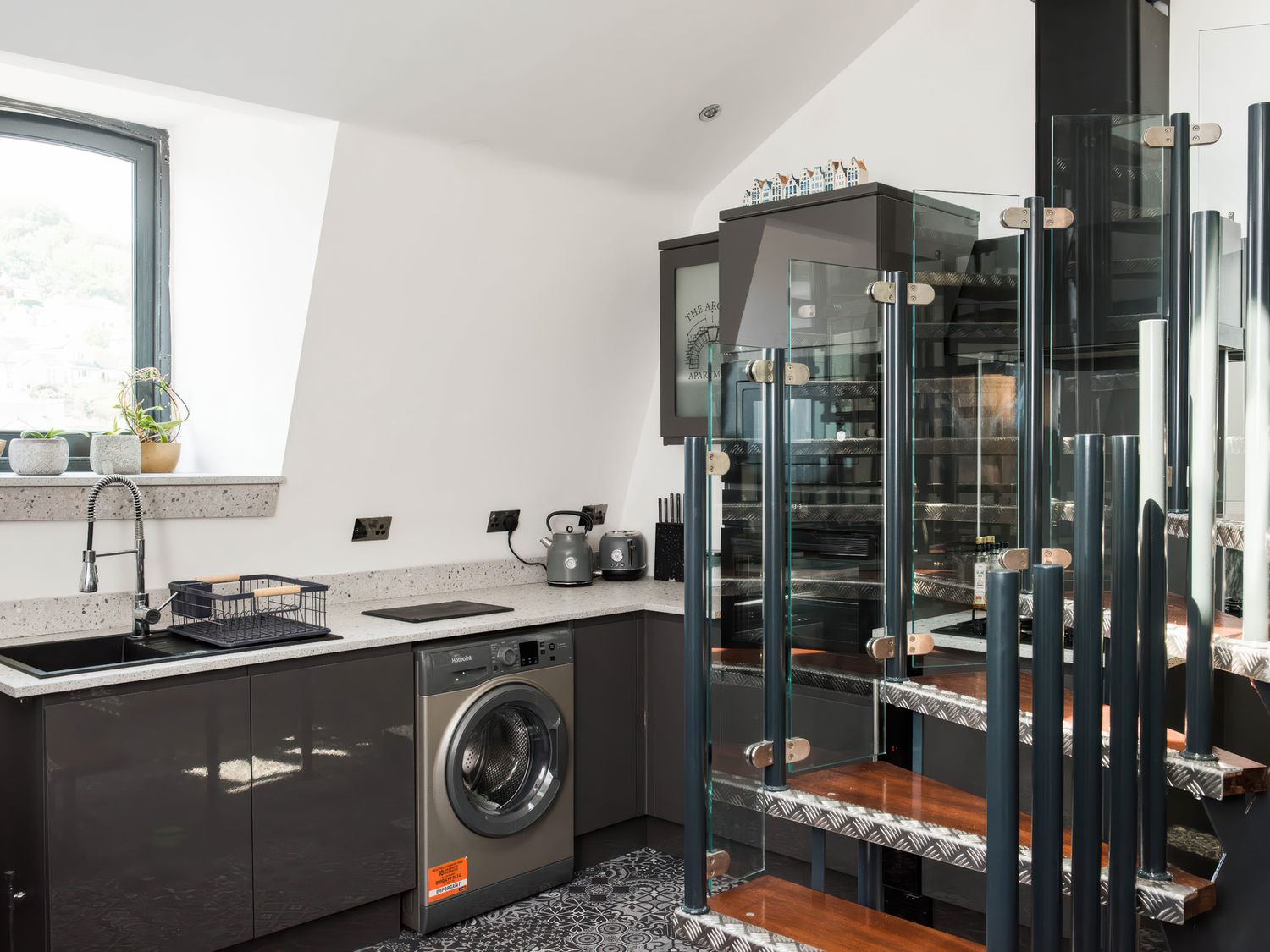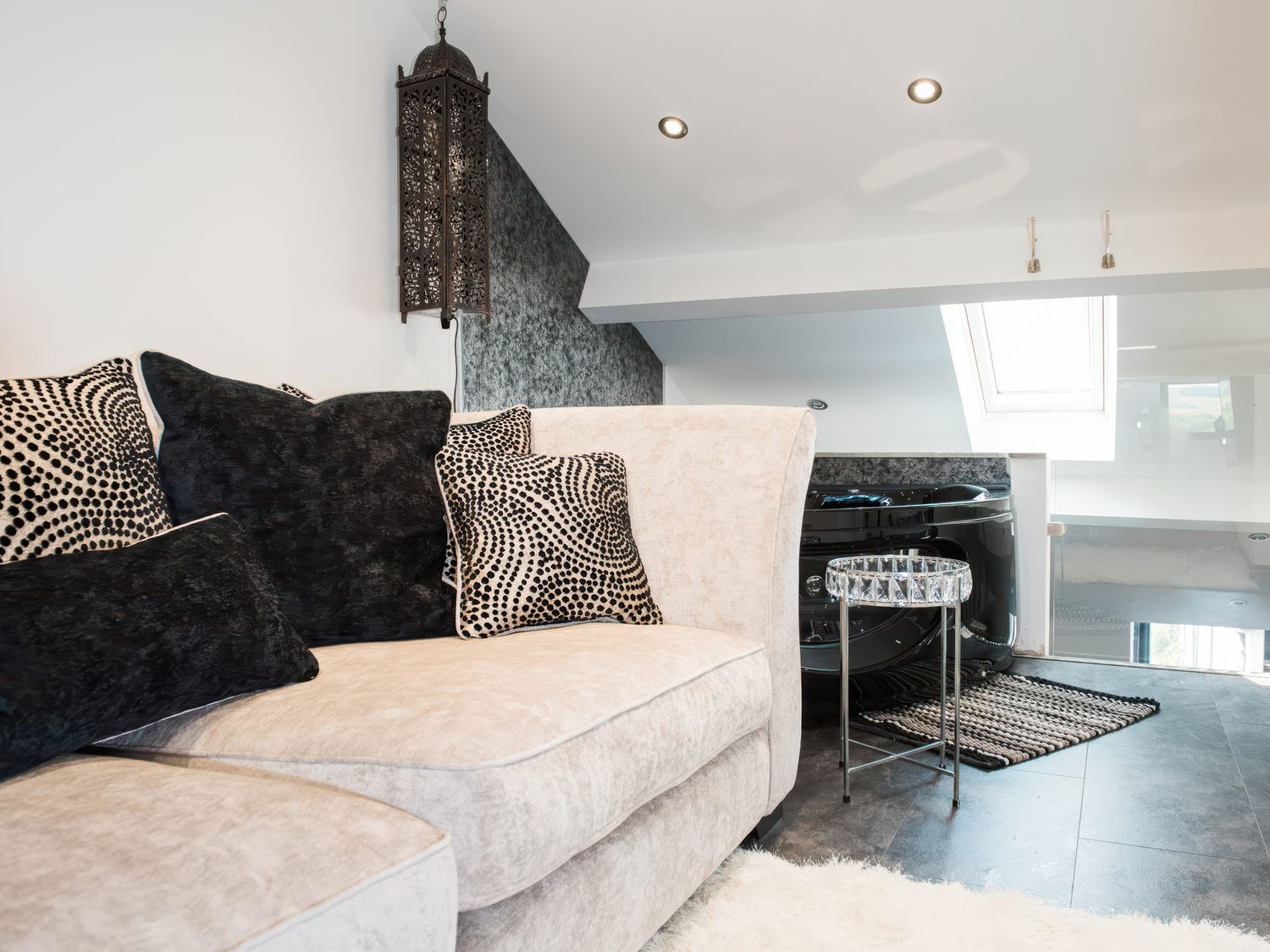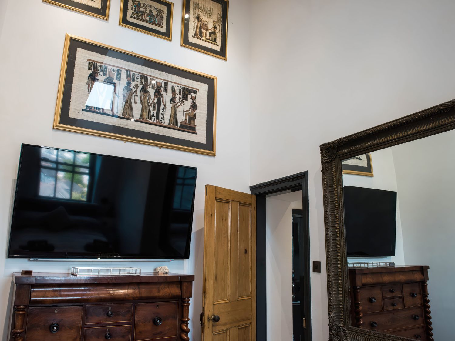 "Top-floor, two-storey apartment. Two ground-floor double bedrooms with Smart TVs. Ground-floor shower room with with twin rainfall walk-in shower, basin, WC. First-floor sitting room with jacuzzi bath. Open-plan living space with kitchen, dining area, and sitting area"