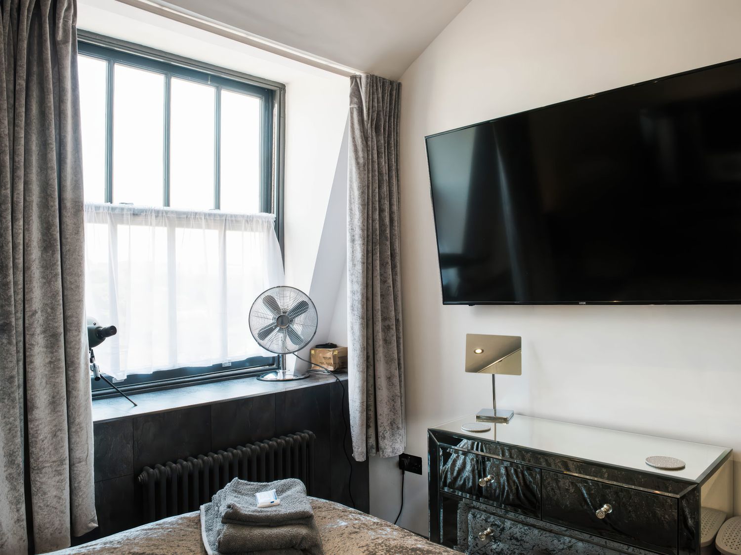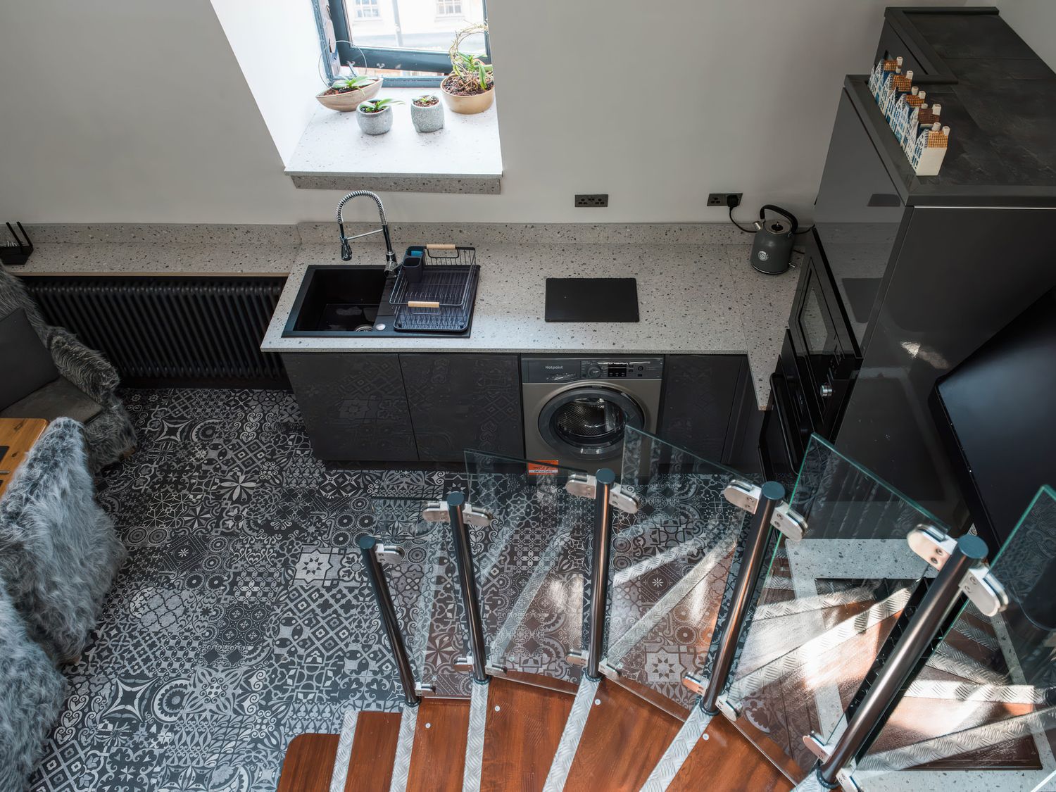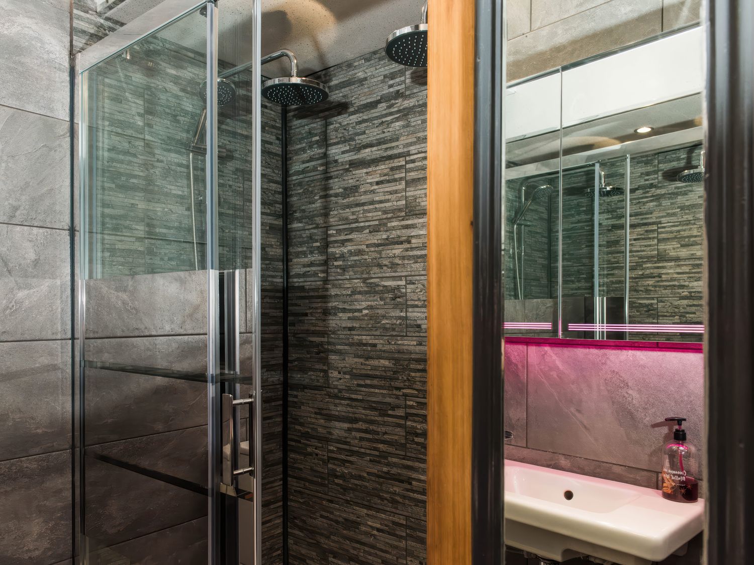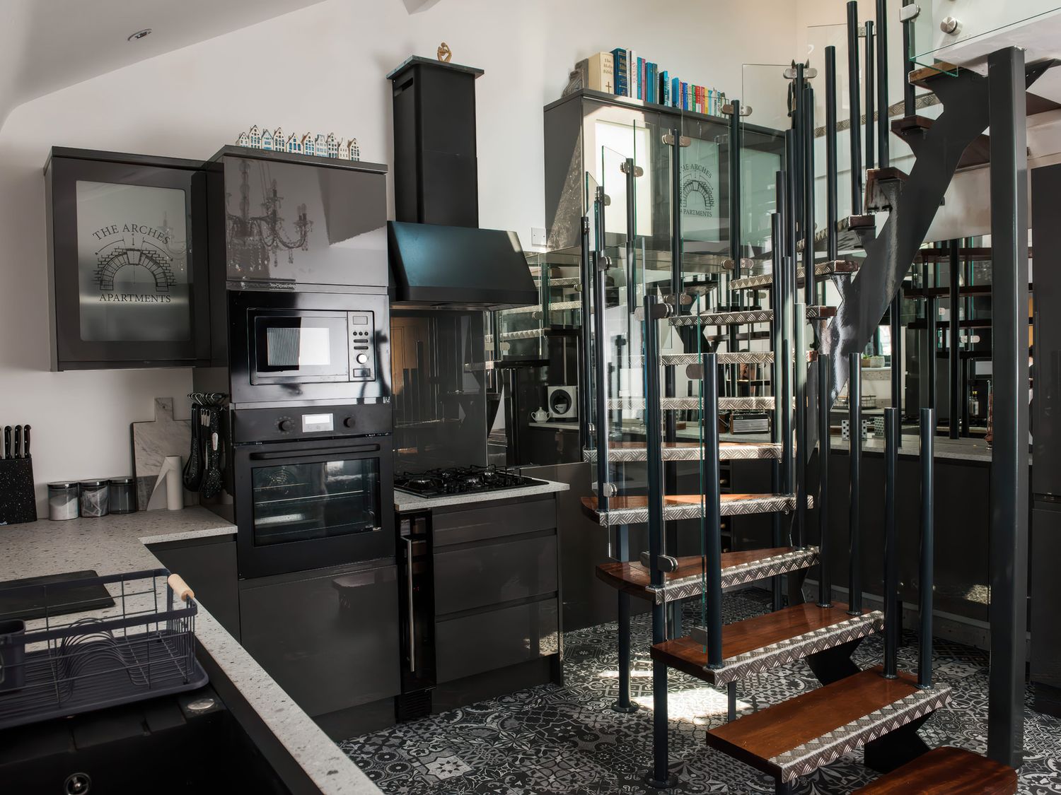 "Top-floor, two-storey apartment. Two ground-floor double bedrooms with Smart TVs. Ground-floor shower room with with twin rainfall walk-in shower, basin, WC. First-floor sitting room with jacuzzi bath. Open-plan living space with kitchen, dining area, and sitting area"