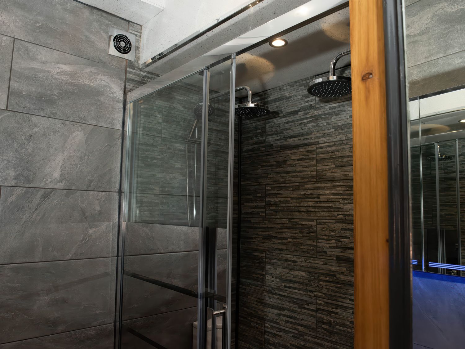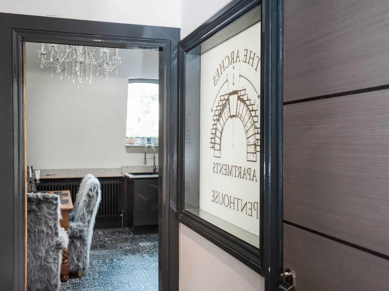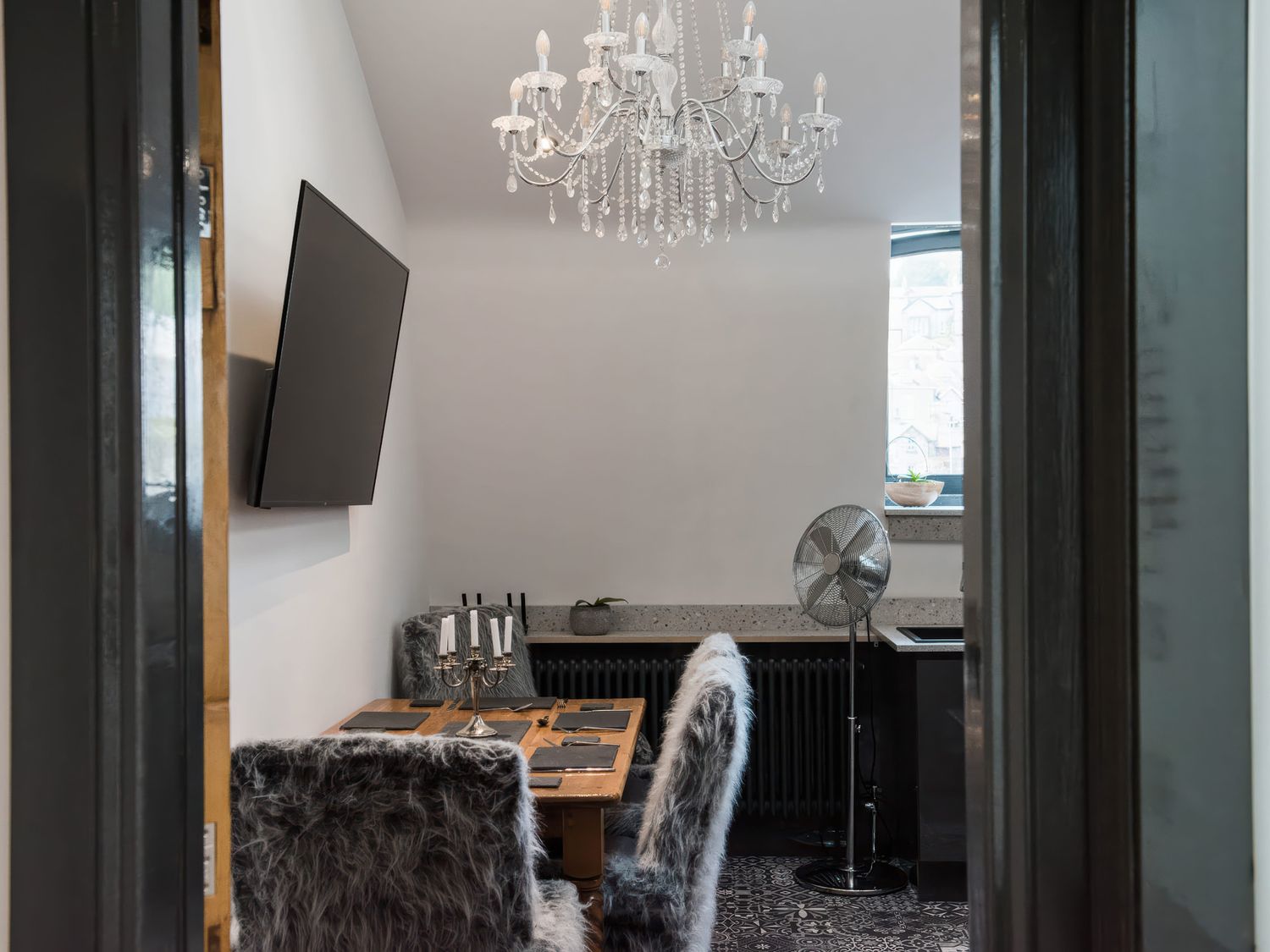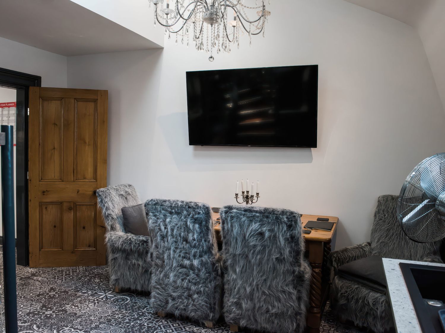 "Top-floor, two-storey apartment. Two ground-floor double bedrooms with Smart TVs. Ground-floor shower room with with twin rainfall walk-in shower, basin, WC. First-floor sitting room with jacuzzi bath. Open-plan living space with kitchen, dining area, and sitting area"