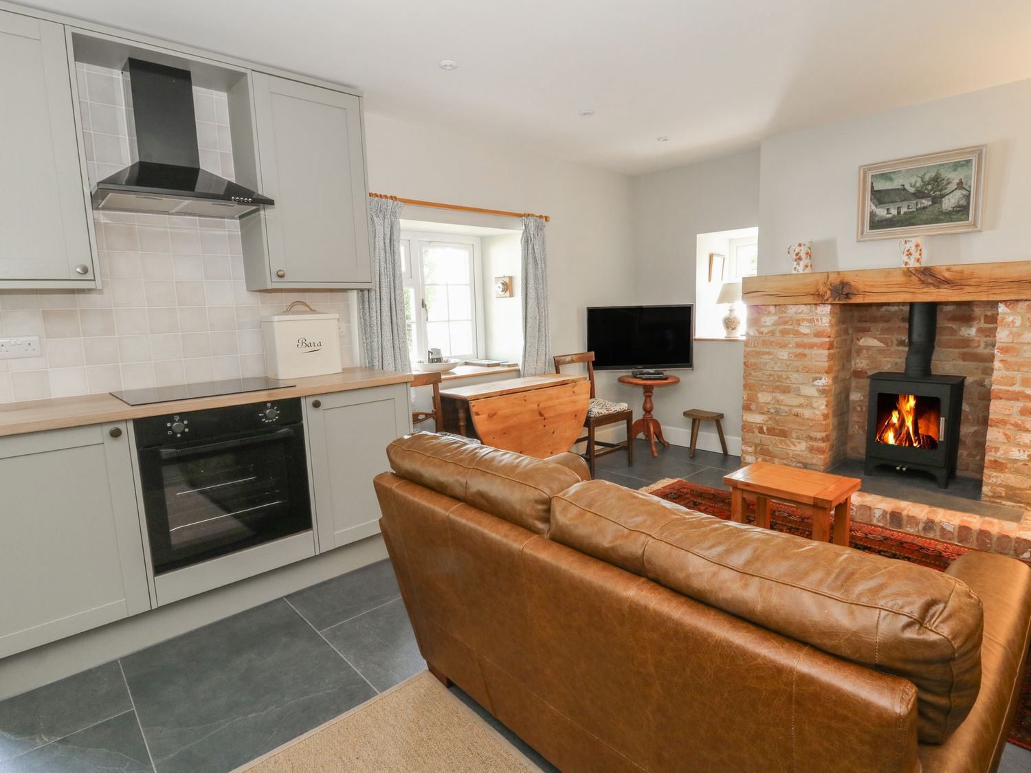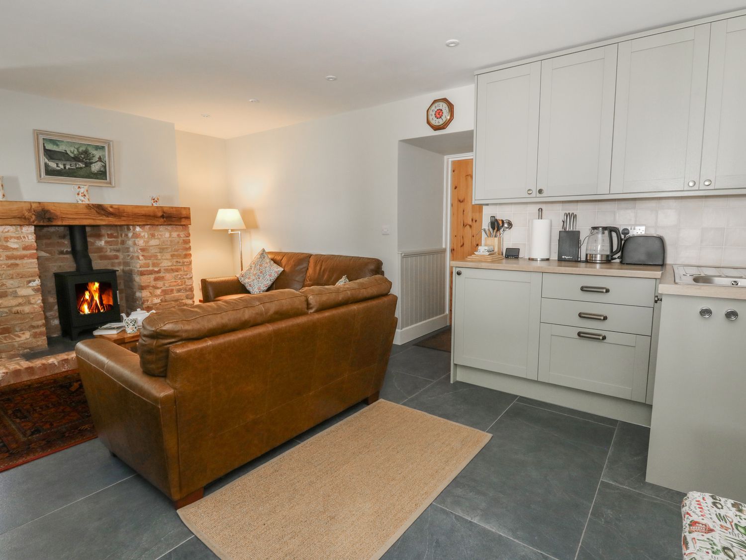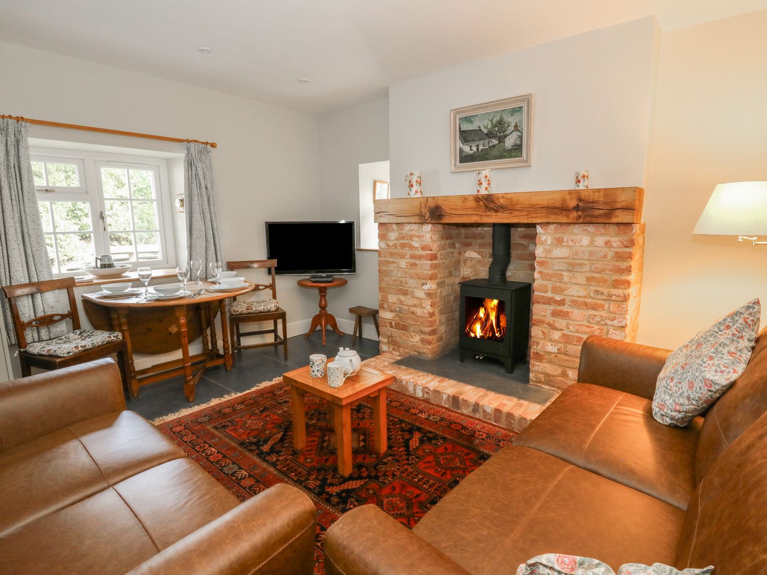 "Single-storey. Two bedrooms: 1 x double, 1 x twin. Shower room with walk-in shower, basin and WC. Open-plan living space with kitchen, dining area and sitting area with woodburning stove