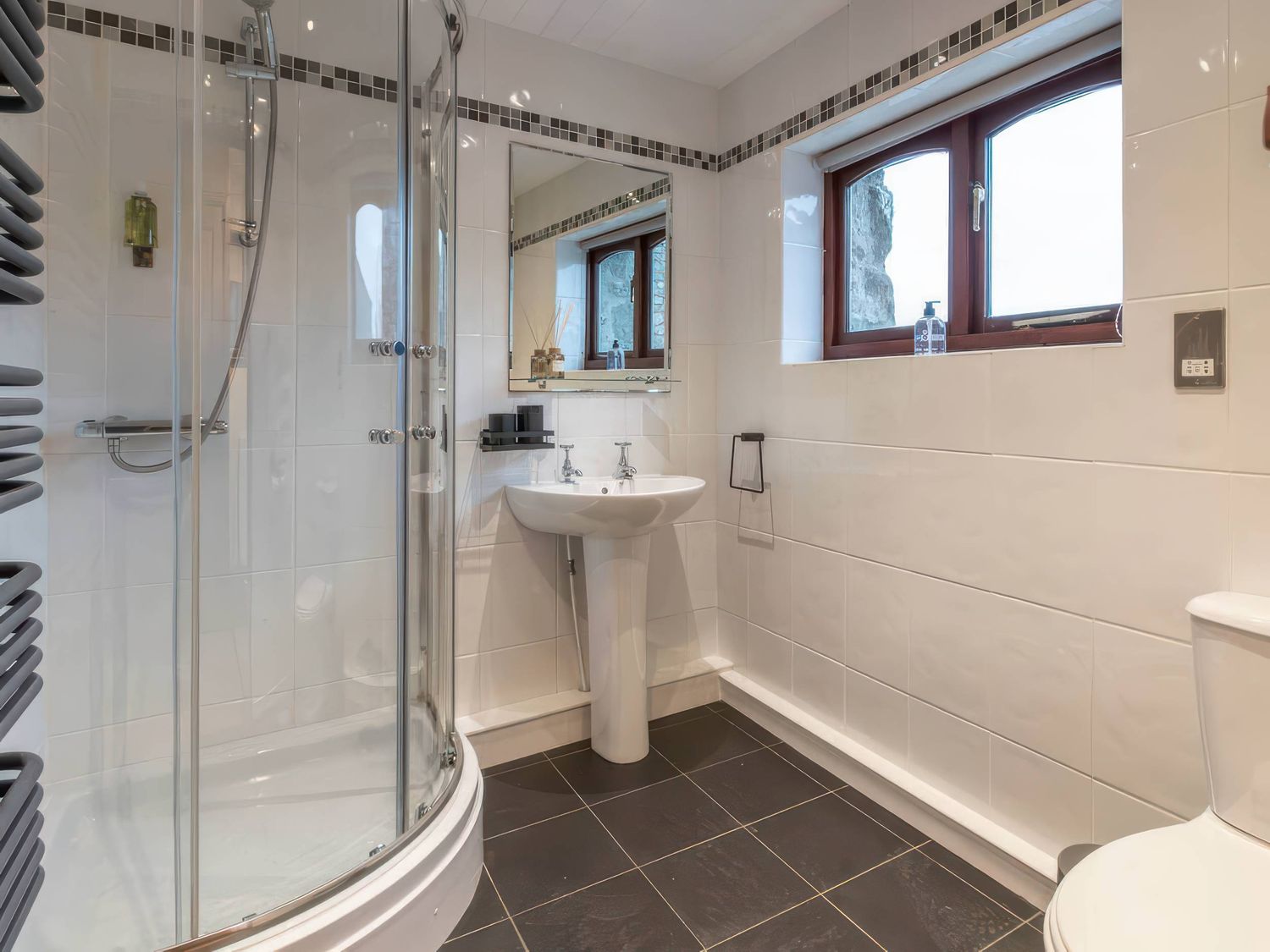 "Single-storey. Two bedrooms: 1 x double, 1 x bunk. Shower room with walk-in shower, basin, heated towel rail and WC. Open-plan living space with kitchen, dining area and sitting area"