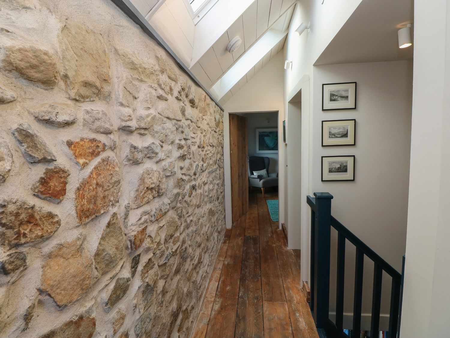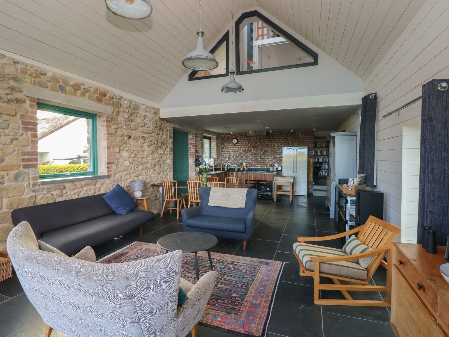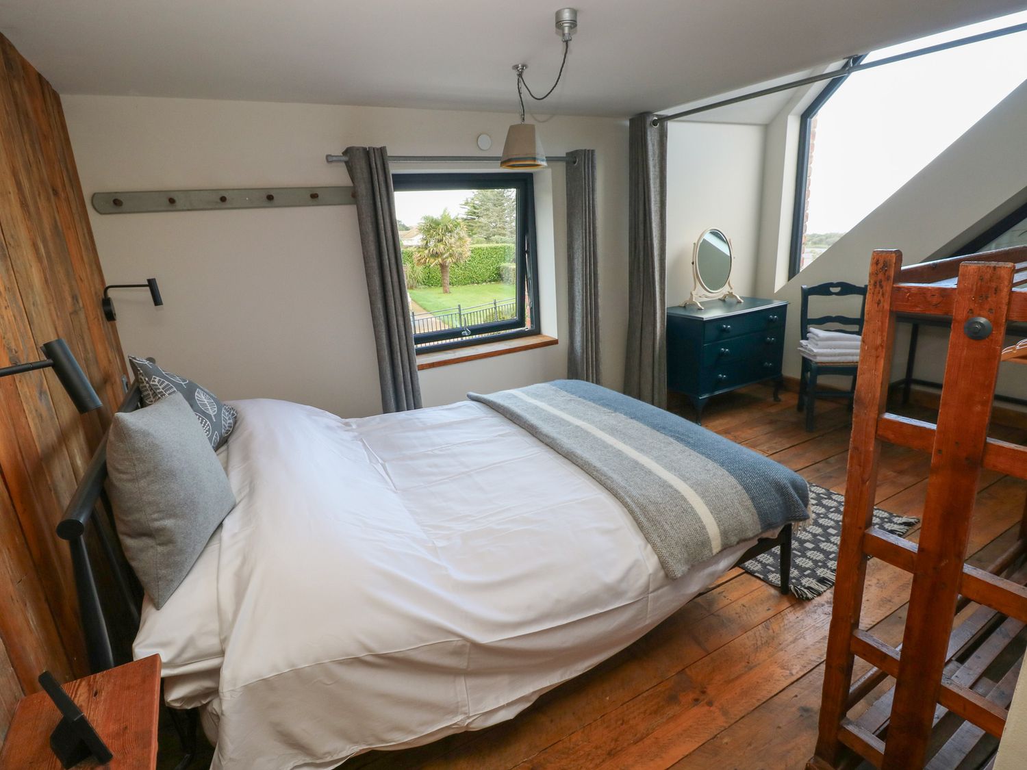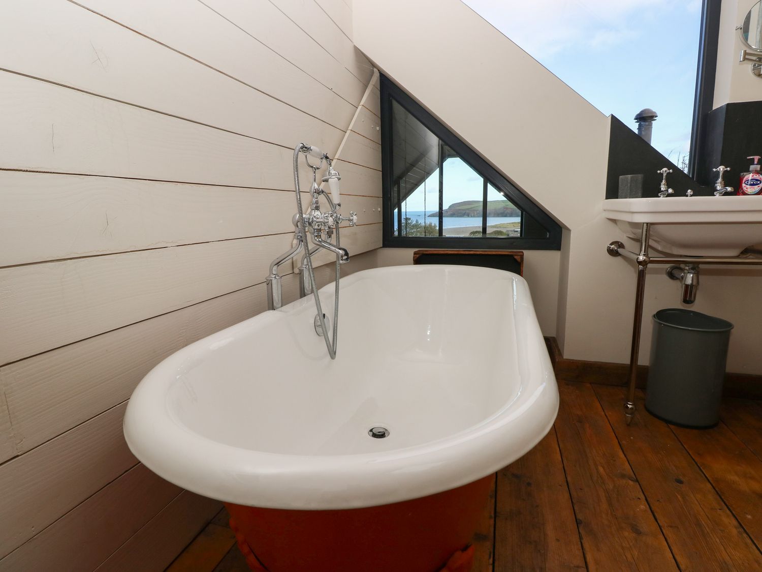 "The Barn, a house over two floors, consists of a kitchen/diner with electric oven, gas hob, microwave, kettle, toaster, washing machine, dishwasher, dining table for six and breakfast bar for two, a utility, a sitting room with woodburning stove, three sofas, armchair, smart TV, patio doors out onto decking and exposed stonework. Also a reading room with an extensive library with sofa and armchair. The bedrooms consist of a first-floor king-size double, a first-floor double and a first-floor adult bunk bed. There is also a first-floor bathroom with freestanding bath, basin and WC. Large windows and wet room with walk-in shower, basin, and WC. WiFi, fuel, power, bed linen, and towels included in the rent. Outside, there is an enclosed decking area with furniture and barbecue, sea views. Front enclosed patio area with furniture and off-road parking for three cars. Two well-behaved dogs welcome. Sorry, no smoking. Uncover the best of Pembrokeshire and its surrounding areas with a holiday at The Barn. Note: Please take care on the steps leading down the side of the house. Note: No access to third floor of the property. Note: This property requires a Good Housekeeping Bond of 250 GBP."