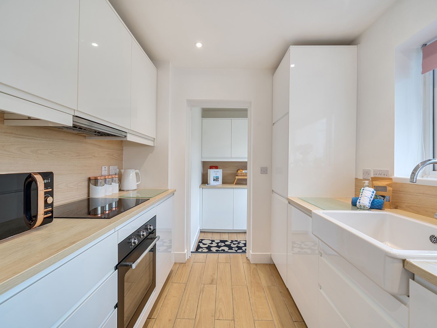 "All ground floor. Two bedrooms: 1 x super king-size (zip/link beds, can be made into twins upon request),1 x double bed . Bathroom, with bath, hand-held shower, hand basin and WC. Kitchen. Utility. Sitting room/diner with woodburning stove. Snug/sun room. Games room. "