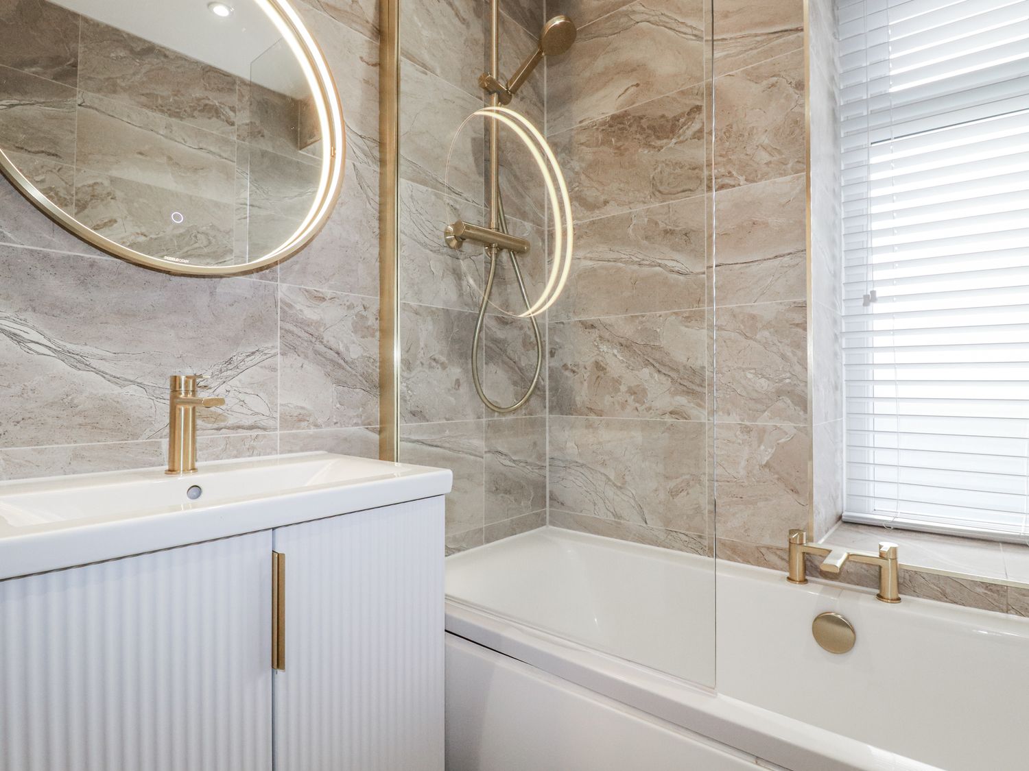 "Three bedrooms: 1 x super-king-size, 1 x twin (zip/link can be super-king-size on request), 1 x twin (zip/link can be king-size on request). Bathroom with bath, handheld shower, free shower, basin, heated towel rail and WC. Kitchen. Living/dining room"