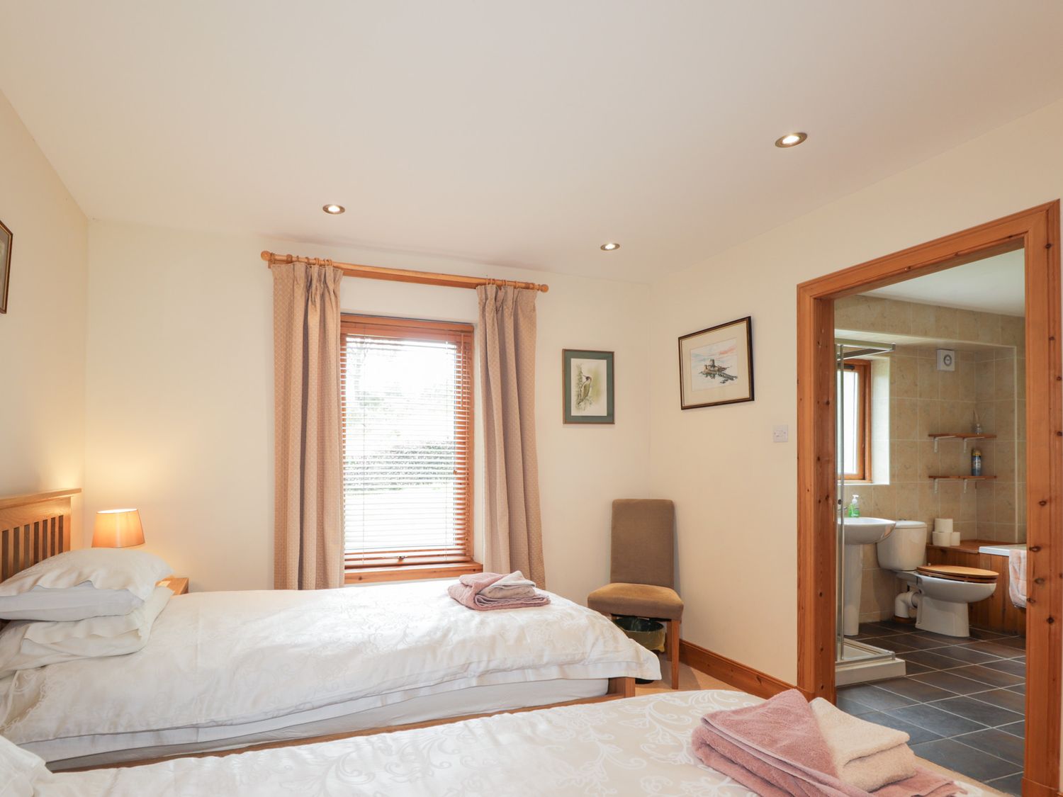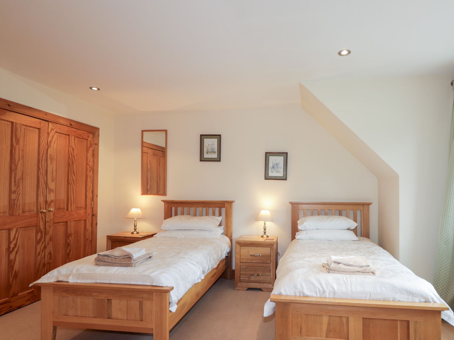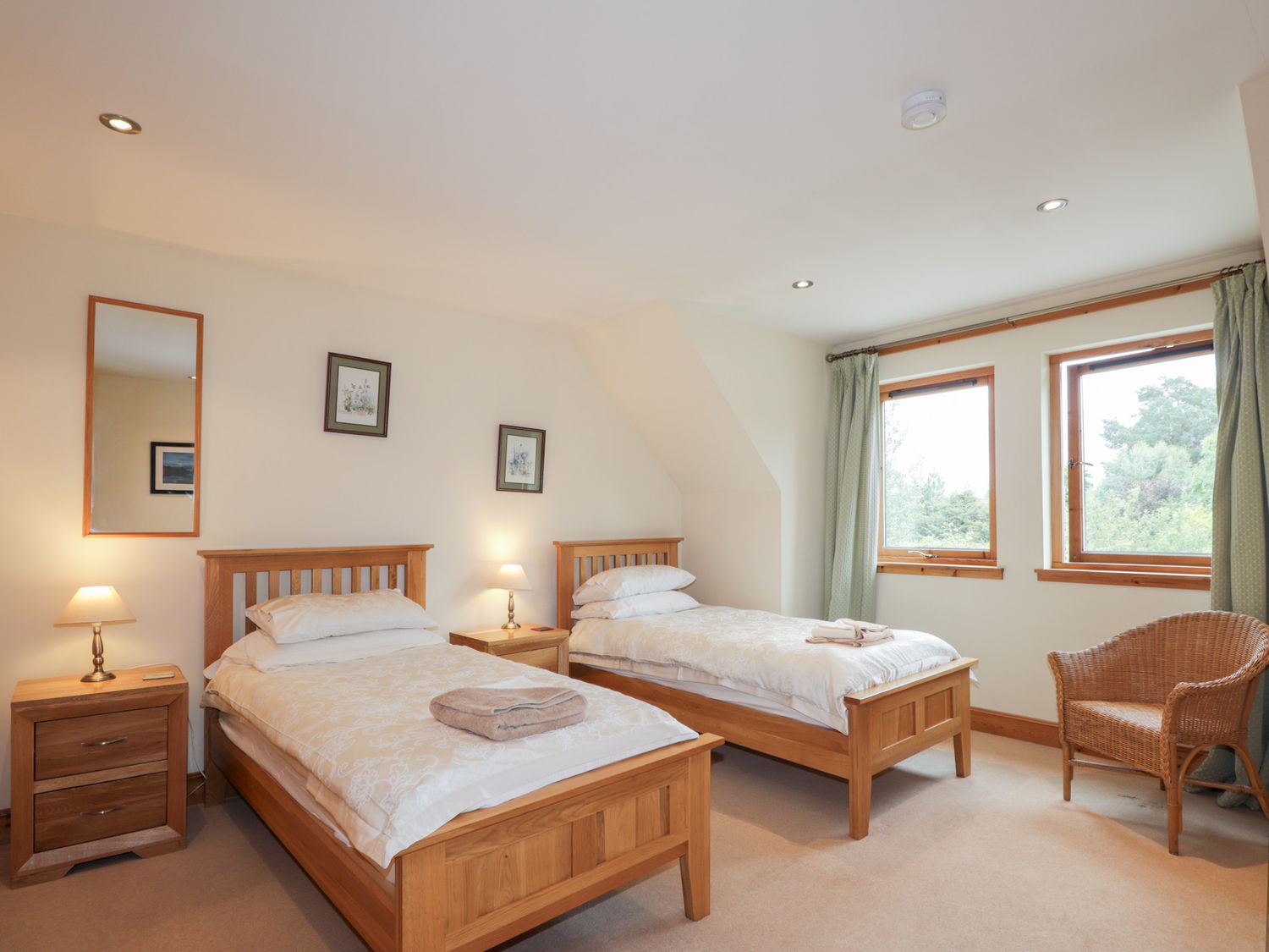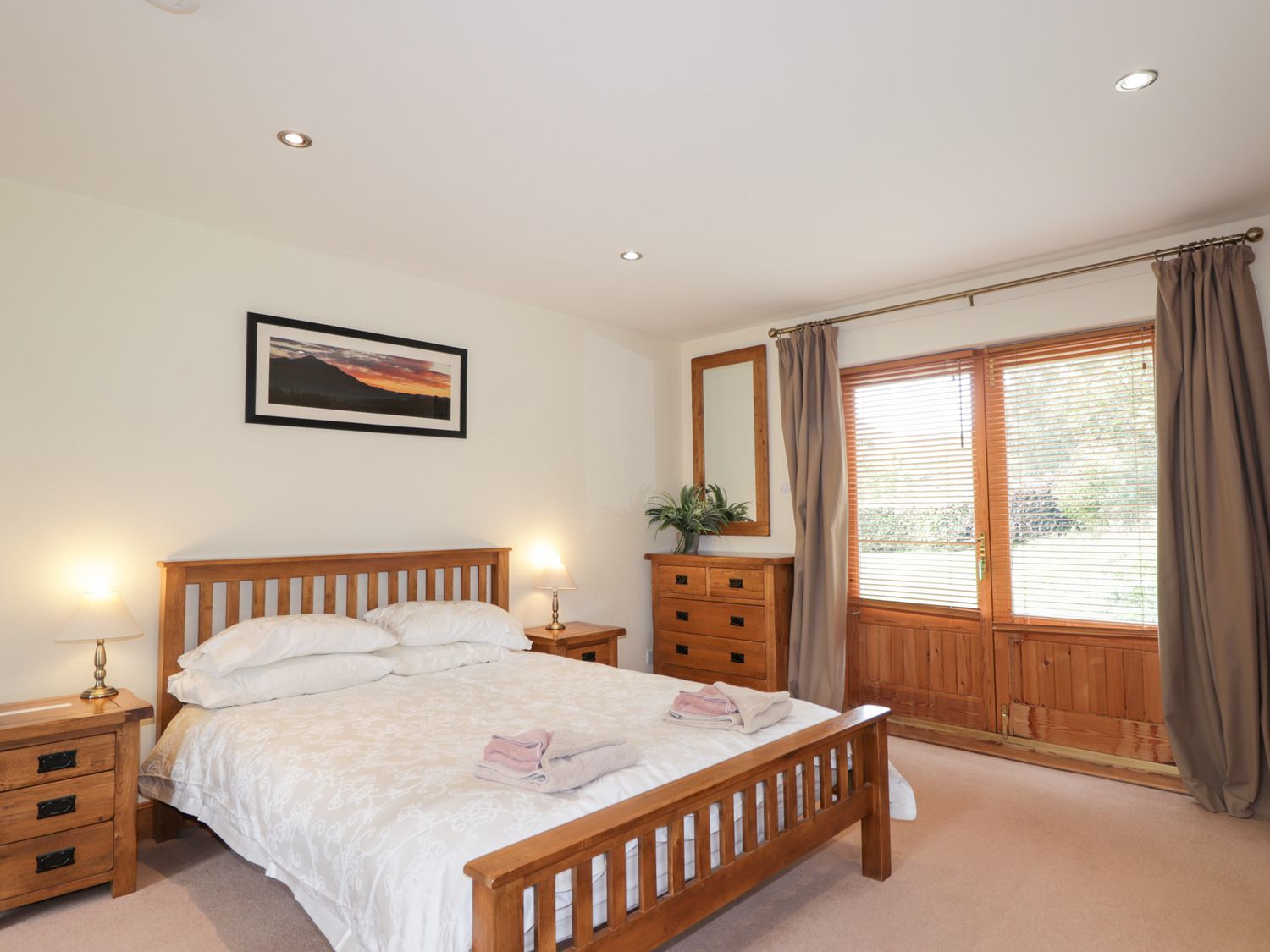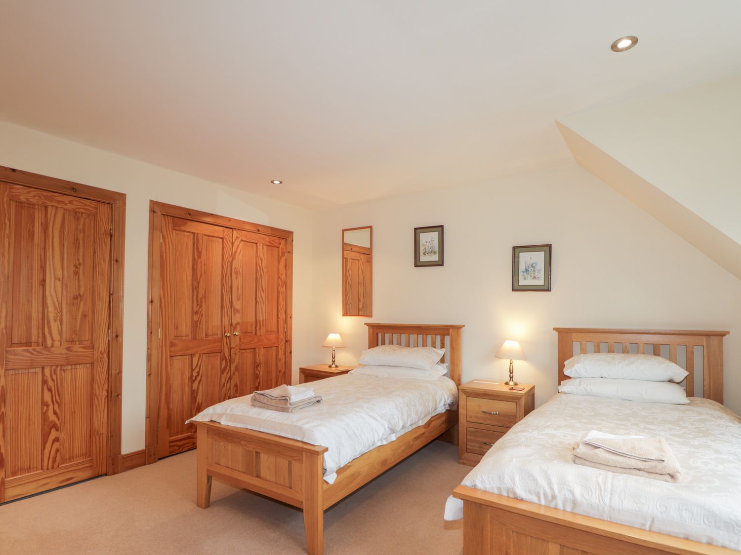 "Five bedrooms: 1 x super king-size double with dressing room and en-suite bath, shower over, basin and WC, 1 x king-size double, 1 x twin, 1 x ground floor twin with Jack-and-Jill access to bathroom, 1 x ground floor family room with 1 king-size double and 1 single with pull-out stacker bed. Bathroom with bath, shower over, basin and WC. Ground floor bathroom with bath, separate shower, basin and WC. Kitchen with dining area. Utility. Dining room (seats 10). First floor sitting room."