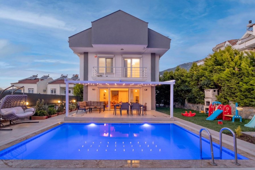 Villa Dilekli is a modern design villa with 3 bedrooms and a capacity of 6 people, located in Fethiye / Ovacik. In our stylish villa, which has an open kitchen, living room designed with modern accessories and materials, everything has been thought for our guests and is in the villa ready to use. It is located only 900 meters from Hisarönü, which is an entertainment center, and 4 km from Ölüdeniz beach, 7 km from Kayaköy and 12 km from Fethiye center. General Features of Villa Modern Design and Concept Private pool and large well-kept garden. 3 Bedrooms and Living Room 3 En-suit Bathrooms Number of people that can stay: 6 people Interior features of our villa; Living Room: There are living room materials suitable for architecture and sitting group, air conditioner, LCD TV, internet, air conditioner, modern accessories and exit to the pool area. Kitchen: Open-plan kitchen area; There are dining tables and chairs,Dishwasher, Oven, Hob, Microwave, Fridge/freezer, Toaster, Kettle,Washing Machine, Radio, and A/C Unit. Terrace: In the terrace section, there is a useful sitting group and materials with enough tables and chairs for 6 people. Shared Bathroom: Upstairs shared bathroom with a shower, toilet, single washbasin. Features of Bedrooms; 1. Bedroom: Master suite bedroom; There is 1 double bed,air conditioning,Lcd Tv,en-suite bathroom,wardrobe. 2. Bedroom: There are 2 single beds,air conditioning,Lcd Tv and wardrobe. 3. Bedroom: There is 1 double bed,en-suite bathroom,air conditioning,Lcd Tv,wardrobe. External Features;g There is a BBQ Area, Sunbeds/Umbrellas,Garden Furniture,Garden swing,Terrace,Private Swimming Pool and Private Car Parking Area. Damage Deposit: A damage deposit of £100 is taken during check-in. During your reservation, any broken, dumped etc. If not, the damage deposit will be returned to you. Note: In all our villas, which are intertwined with nature, spraying is done regularly. However, pests etc. in the environment. is likely to be found.The photos of the villas on our site are taken with a 'Wide Angle Lens' to fit the image to the screen. For this reason, the objects in the pictures may appear larger or smaller than their actual size. Note: Internet usage is limited to e-mails, social media sites, news sites, etc. due to the infrastructure of the region. It is sufficient for the subjects, but not sufficient for the usages such as watching movies and videos. DISTANCES Airport Dalaman Airport, 60 km; It is located within a 50-minute drive. Nearest Beach Oludeniz beach is located 3 km (5 minutes by car or 10 minutes by public transport). Nearest Center Center (Restaurants, Bars, Cafes, Shops, Amusement Park and All Facilities) The center of Hisaronu is 900 m (5 minutes by walk). Nearest Markets Supermarkets are located 600 meters (5 minutes by walk) from the villa. Fethiye Fethiye center is located 12 km (7-8 minutes by car and 10-15 minutes by public transport). Public transport Minibuses (Dolmus) pass in all directions from the main road, which is 100 meters from the villas.