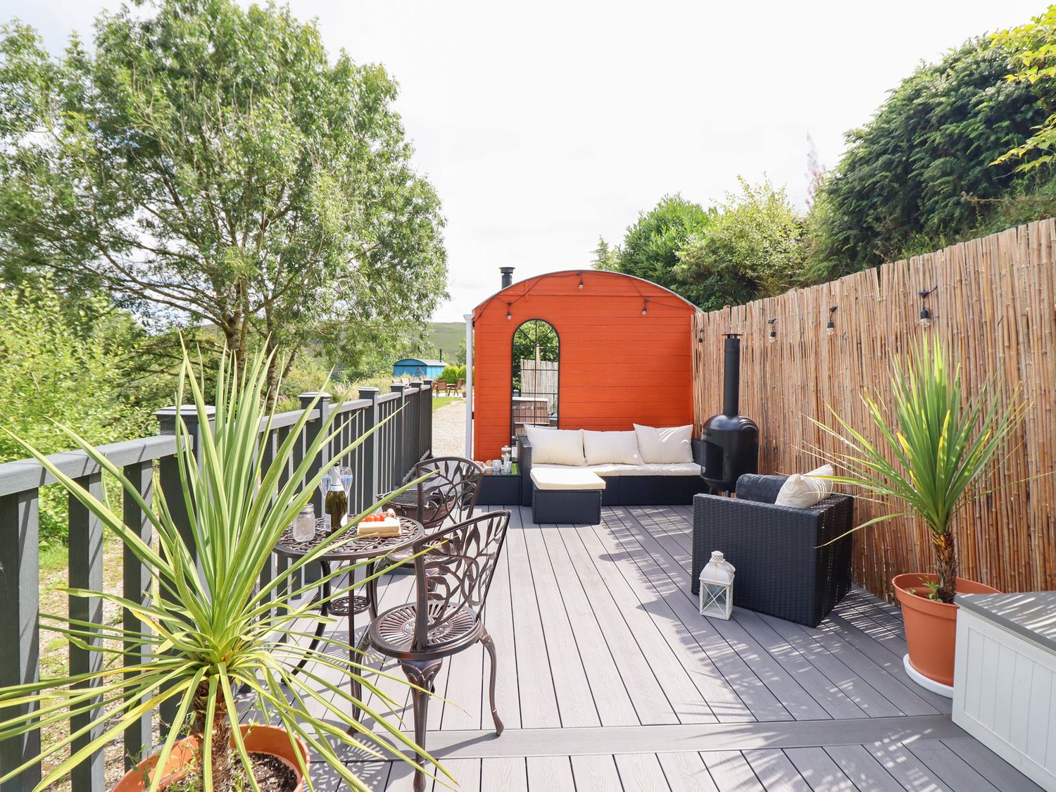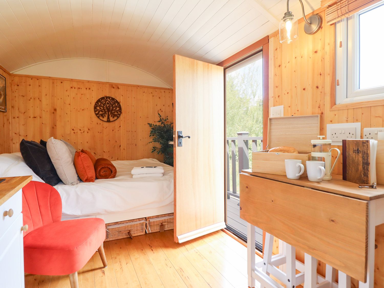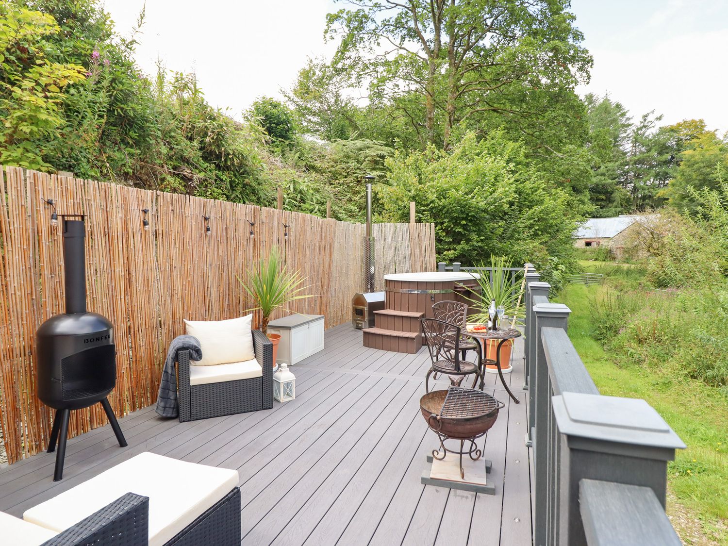 "Studio-style layout with double bed, kitchen and dining area with woodburning stove. Enclosed veranda with furniture, fire pit and wood fired hot tub. Shower room with walk-in shower, basin and WC"