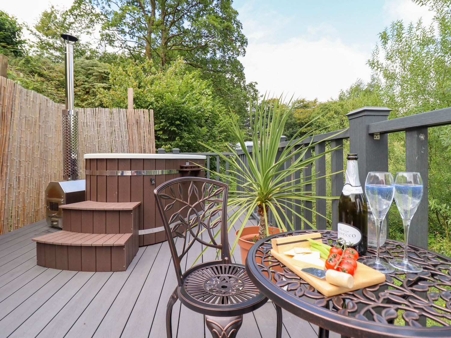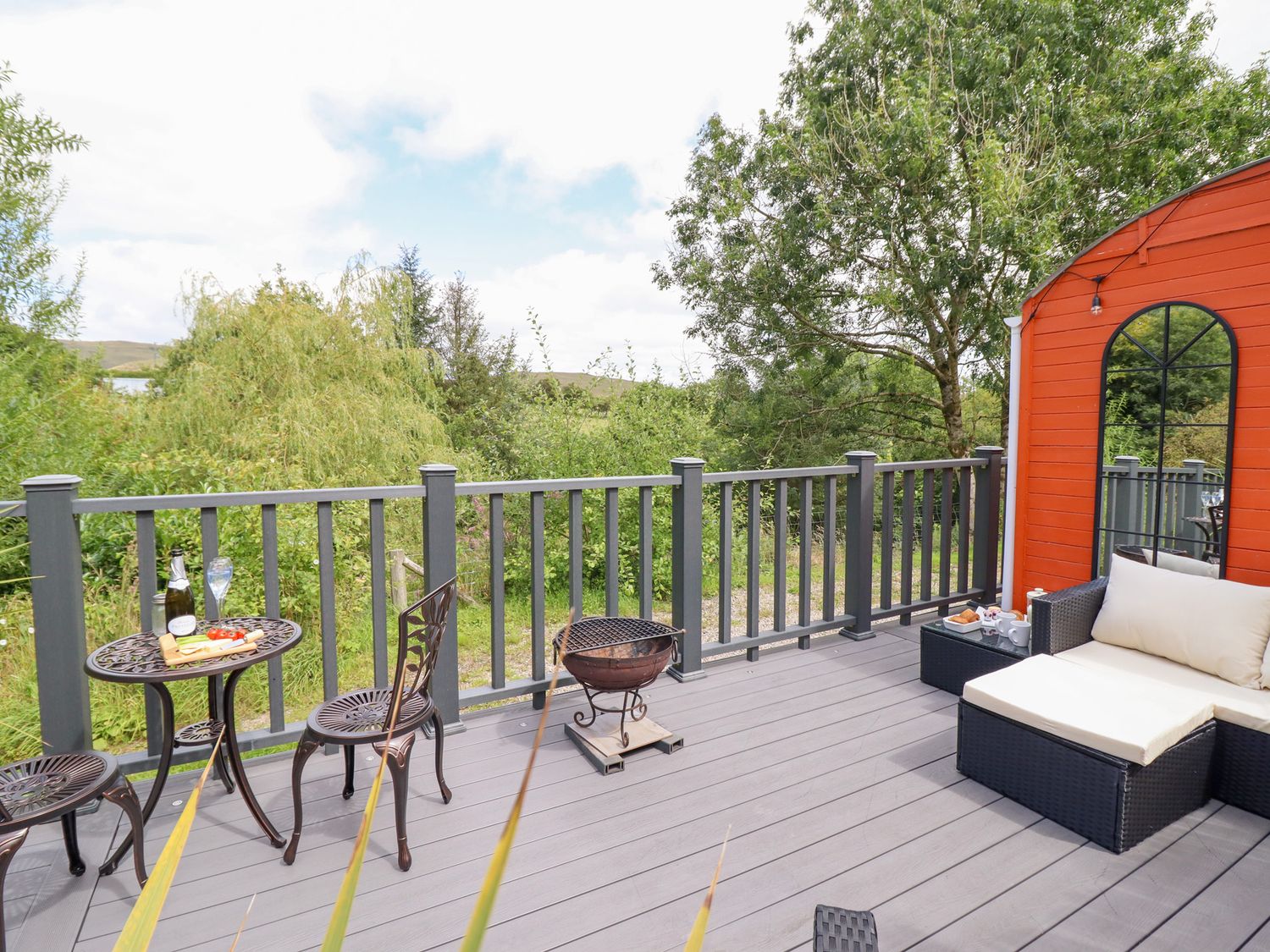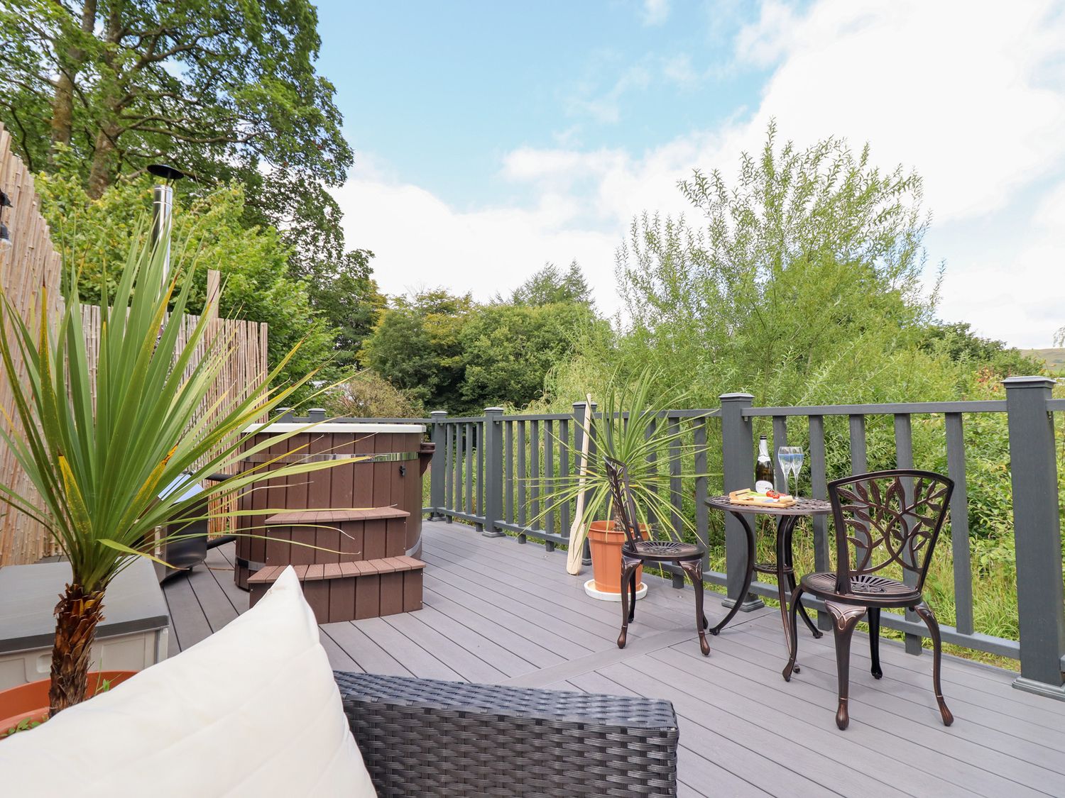 "Studio-style layout with double bed, kitchen and dining area with woodburning stove. Enclosed veranda with furniture, fire pit and wood fired hot tub. Shower room with walk-in shower, basin and WC"