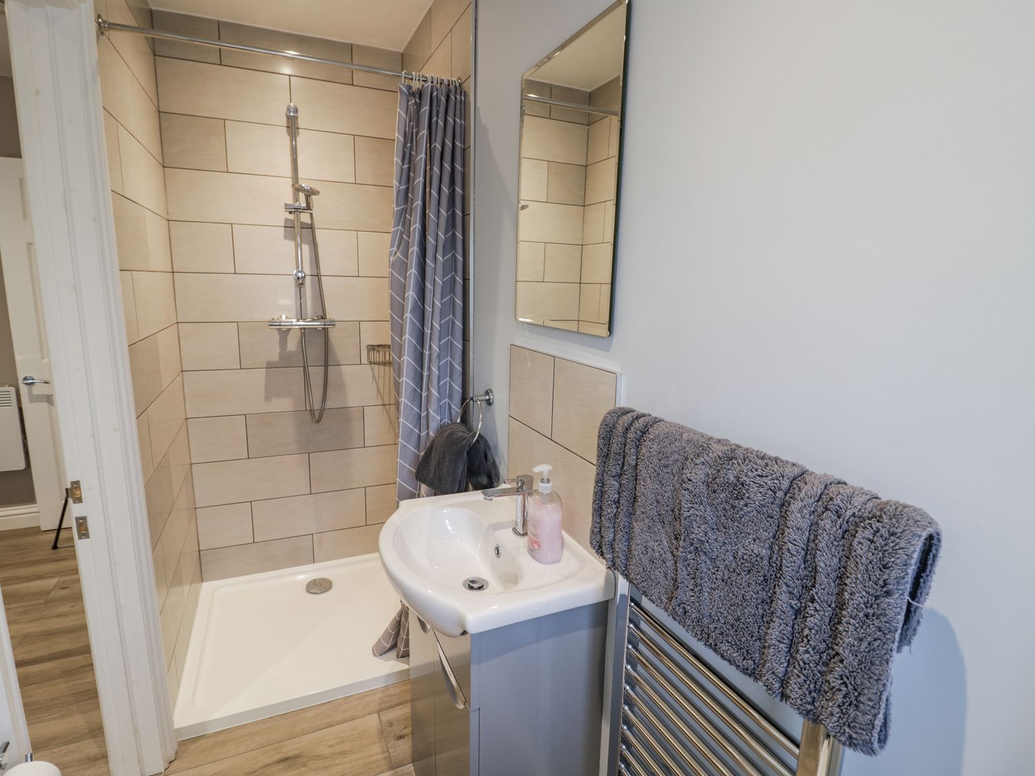 "Single-storey. Two bedrooms: 1 x king-size (zip/link can be twin on request) with en-suite walk-in shower, basin, heated towel rail and WC, 1 x double with en-suite walk-in shower, basin, heated towel rail and WC. Open-plan living space with kitchen, dining area, and sitting area with woodburning stove. External shared utility