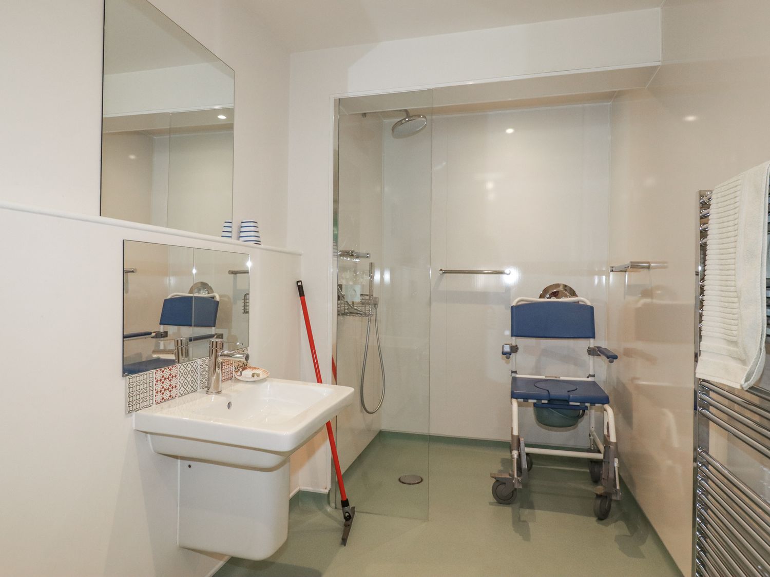 "Hilbre consists of an open-plan living space with kitchen featuring oven and hob, microwave, fridge, freezer, dishwasher, kettle and toaster, a utility cupboard with washing machine and tumble dryer, a dining area and sitting area with TV. The bedrooms include a single and a twin, both with en-suite shower rooms, with a z-bed available on request for the single room, serviced by a cloakroom with basin and WC. Outside, there is off-road parking for two cars, a rear patio with furniture, and an outdoor shower to the front. A highchair is available on request. Sorry, no pets and no smoking. WiFi, bed linen, towels, fuel and power are included in the rent. Hilbre is a spacious, disability-friendly base for exploring Trevone and the surrounding Cornish coast. Note: This property ideally suits 3 people if full disabled facilities are required or otherwise can accommodate 4 but please enquire first. Note: Loo roll, washing up liquid, dishwasher tablets, laundry liquid, bin liners, tea towels and dishwashing equipment are provided. Note: Additional beach towels and a spare beach robe are available to use."