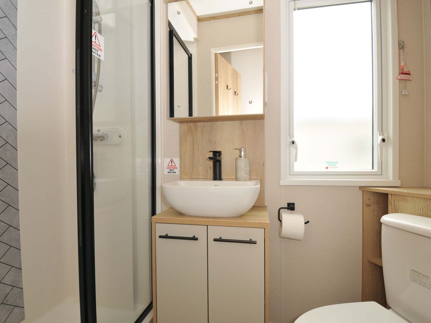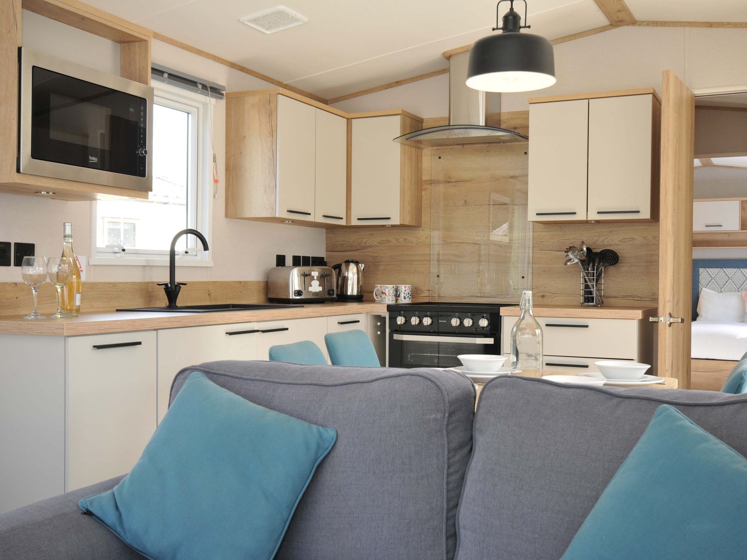 "Eden Way 47 consists of an open-plan living space with kitchen, dining and sitting area with sofa bed and electric fire, a shower room with walk-in shower, basin and WC, and two bedrooms: a twin and a king-size with en-suite bath, shower over, basin and WC. Gas central heating. Oven, hob, microwave, fridge/freezer, washing machine, kettle, toaster. Smart TV, WiFi. Fuel, power, bed linen and towels are all included in the price. Off-road parking available. Enclosed decking with furniture. Two well-behaved pets welcome. Sorry, no smoking. Shop 1 mile, pub 0.5 miles. Note: There is a good housekeeping bond of 500 GBP"
