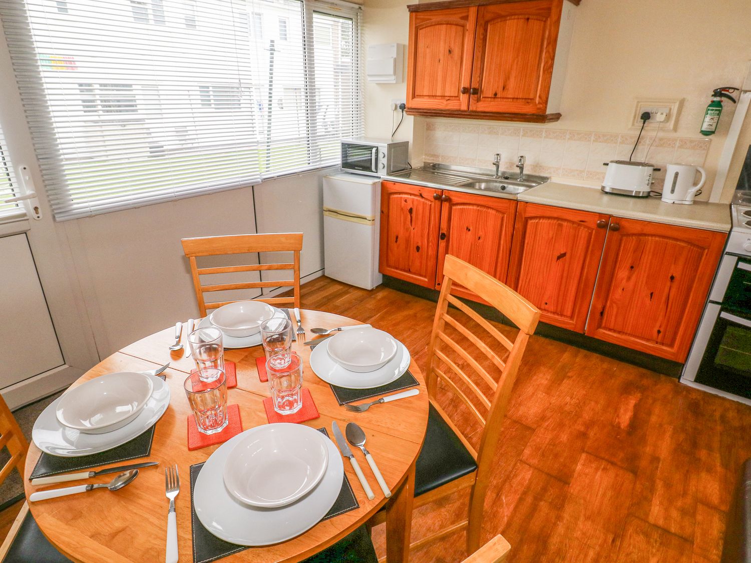 "Two bedrooms: 1 x double, 1 x child's bunk bed. Bathroom with bath, shower over, basin, WC. Open-plan living space with kitchen, dining area and sitting area with electric fire"