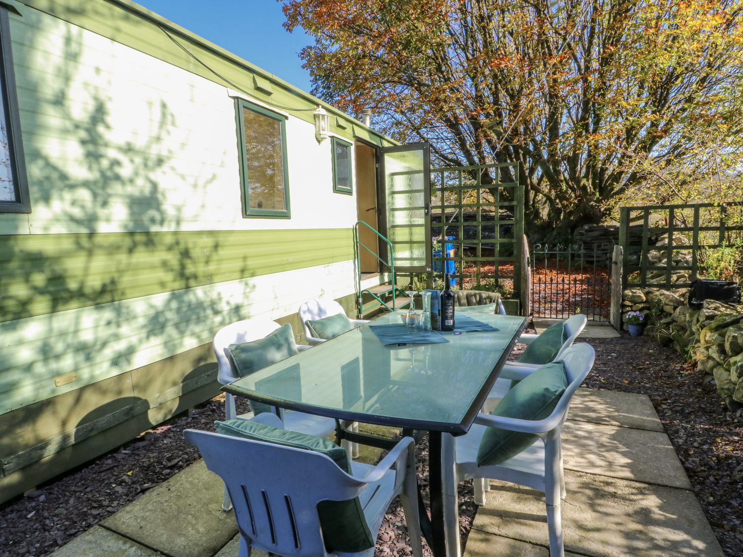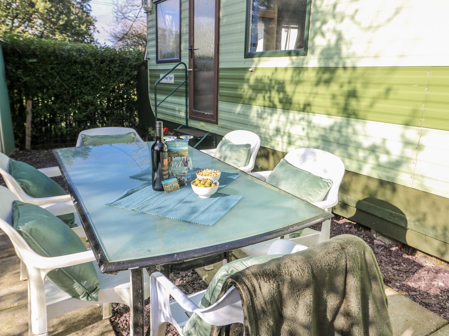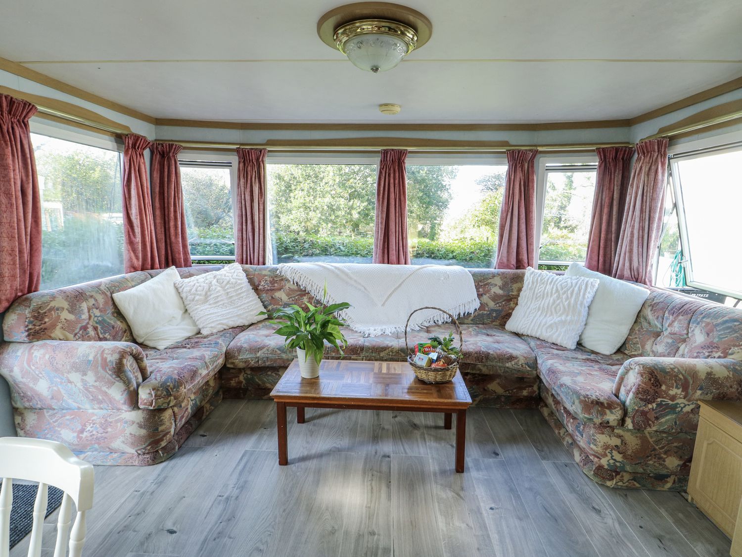"Meadow Island Caravan, a single-storey caravan, consists of a kitchen with oven, fridge, microwave, kettle, and toaster, a dining area with seating for five guests, a sitting room with Smart TV and electric fire. The bedrooms consist of two doubles and a twin, serviced by a bathroom with a small bath, shower over, basin, and heated towel rail and a cloakroom with basin and WC. WiFi, fuel, power, bed linen, and towels are included in the rent. Outside, there is an enclosed garden with a patio, a designated parking place for 1 car and additional off-road parking. Two well-behaved pets are allowed; no smoking. here is a stream either side of the caravan, accessed by a wooden bridge, please do take care with children. Note: There are steps up to the caravan.
