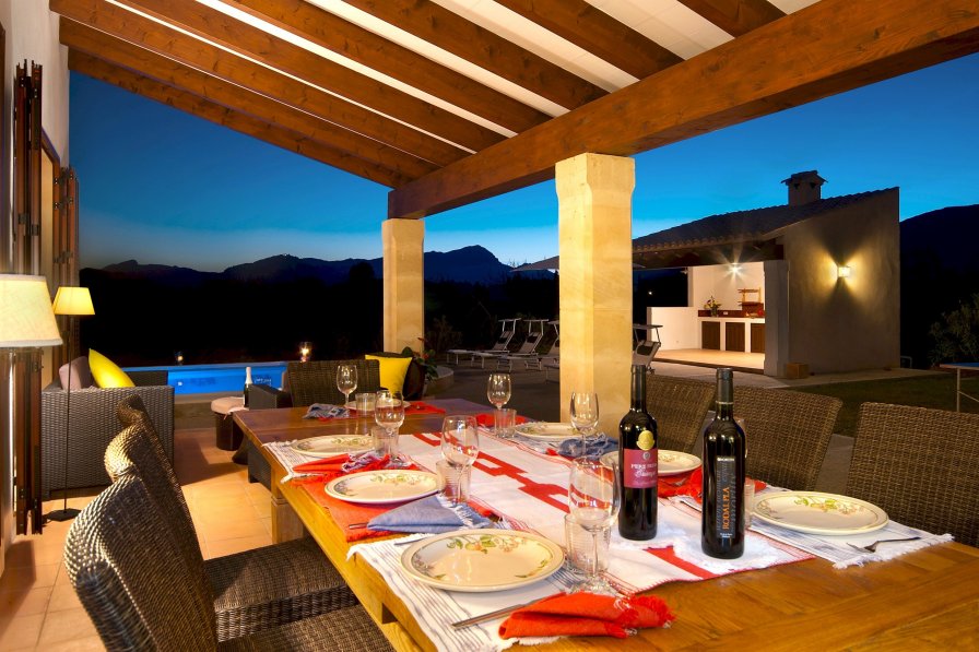 Fantastic Villa in almost walking distance from Puerto Pollensa. Aproximately 1 Km after Puerto Pollensa, a sign “La Vinya” leads to a small way away from the main road. At the end of this path we find the lovely house “La Vinya”. Surrounded by nature and some olive trees, the house is in a quiet place away from the louder roads. A wide parking area invites to park the car (or bicycles) and enter the main entrance of the house. The hall is spacious and very high. In front of us there is a staircase that leads to the dormitories in the first floor. Here we find three bedrooms and two bathrooms, one in suite and the other one with bath. Back to the entrance we look at the left side and find ground floor bedroom and a bathroom (shower). Straight on there is the sitting-dining room, passing the kitchen at the right side. Next to the kitchen we find the laundry and the second ground floor bedroom. The spacious sitting room offers views to the country side and to the pool. Two slide doors give access to the nice, great terrace. Here it is an ideal place for having meals or just relax in the sofas. The swimming pool (9×4.5×1.5) and the large barbacue are next to the terrace and complete a round holiday: Enjoy this family villa with great facilities near to the Puerto Pollensa center and the beach! Composition: 5x bedroom, 3x bathroom Amenities: bed linen & towels, terrace, air conditioning, heating, swimming pool, wheelchair access possible, free cot on request, outdoor parking