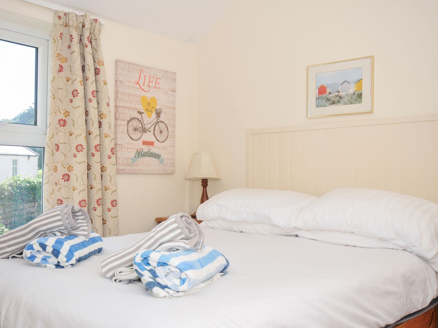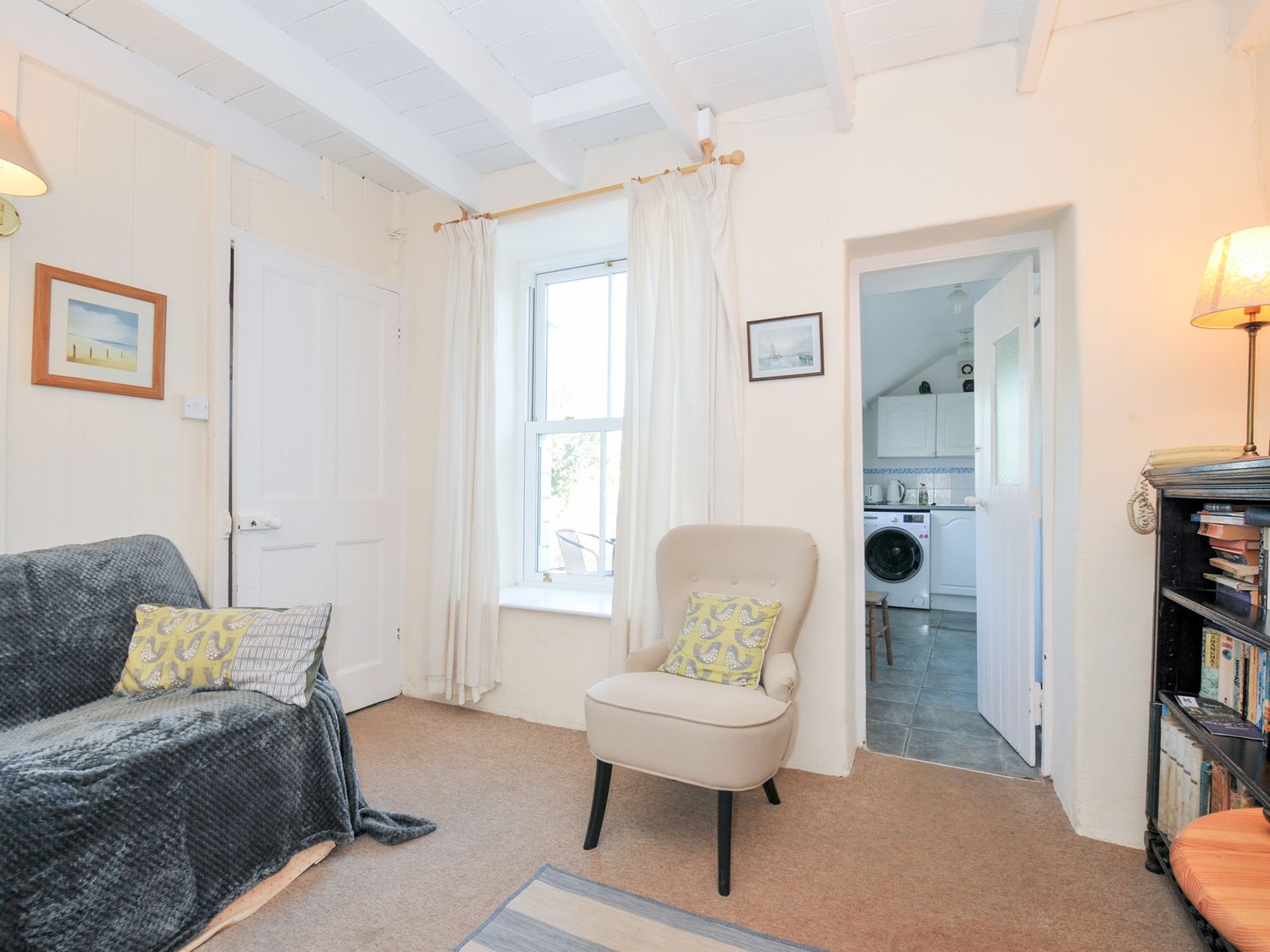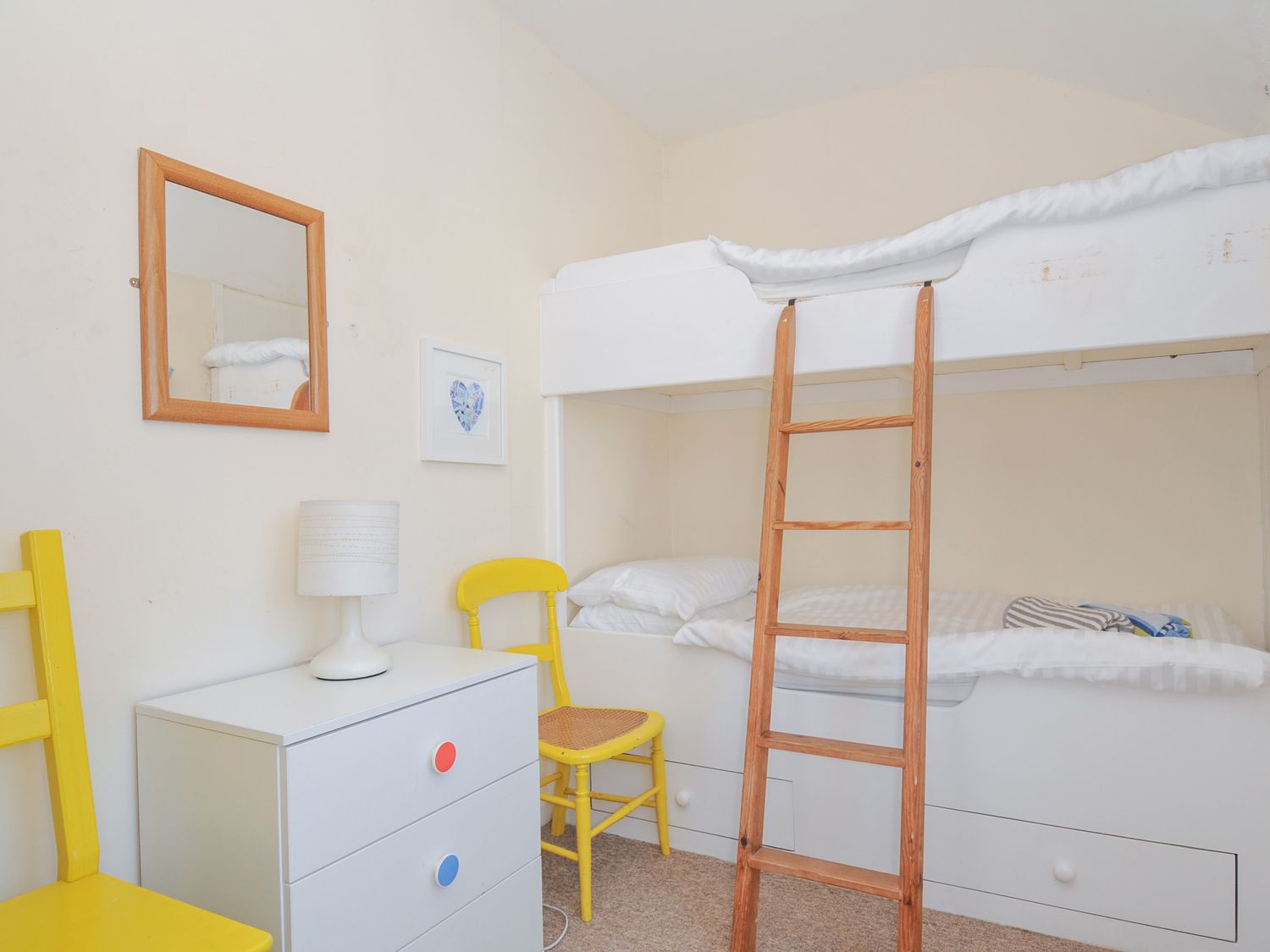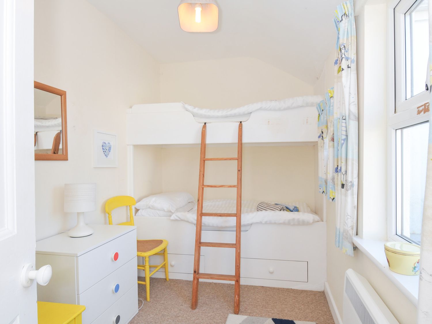 "Two bedrooms: 1 double, 1 bunk beds (children). Separate bathroom with shower over the bath, basin and WC. Ground floor has kitchen, sitting with dining area and an outside courtyard."