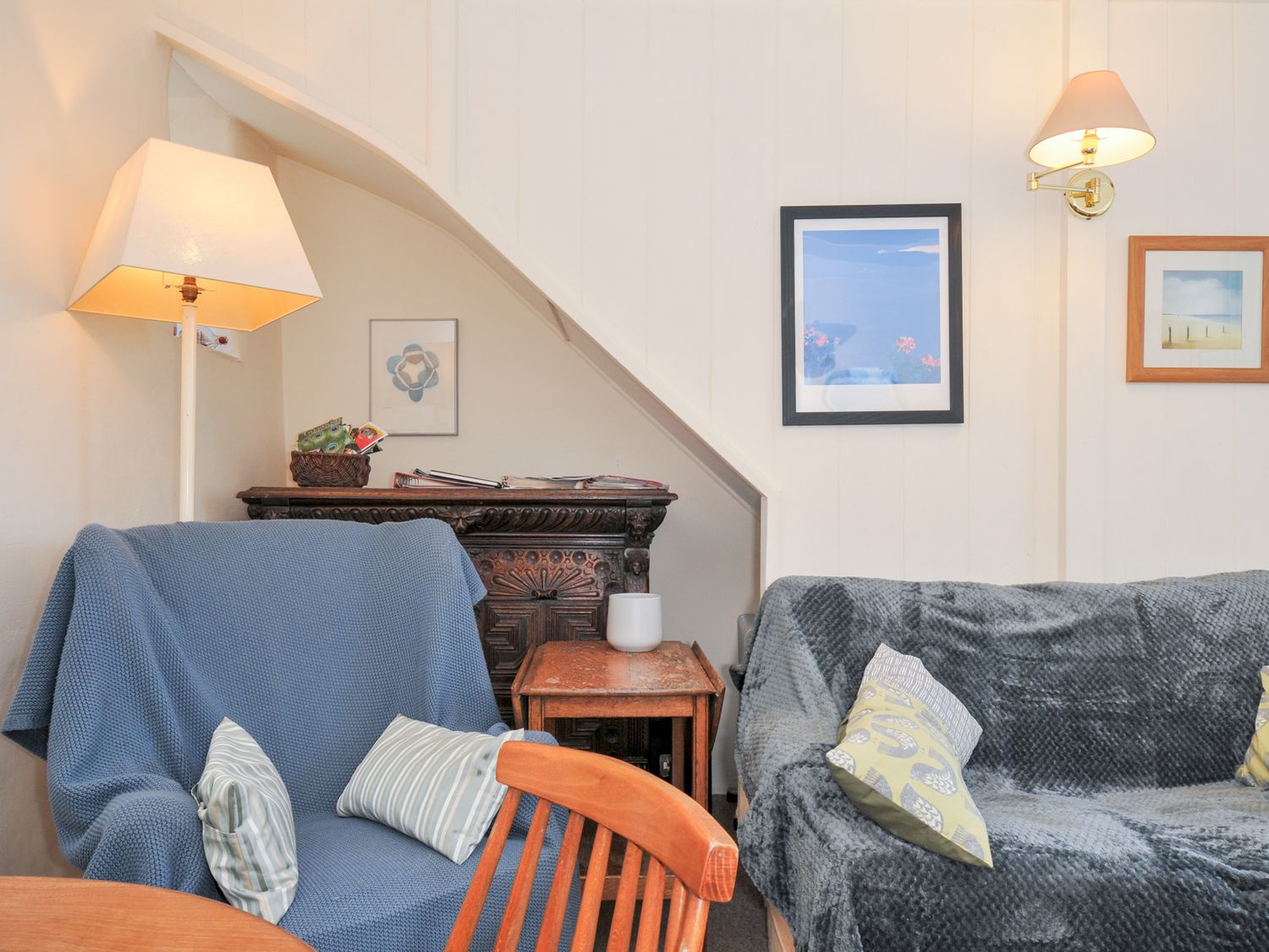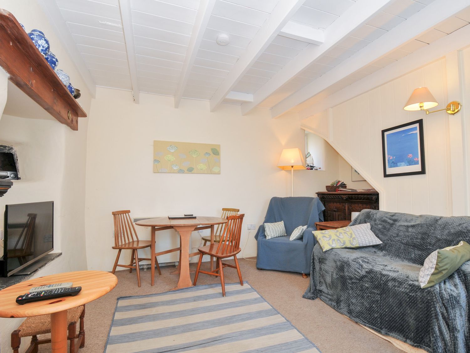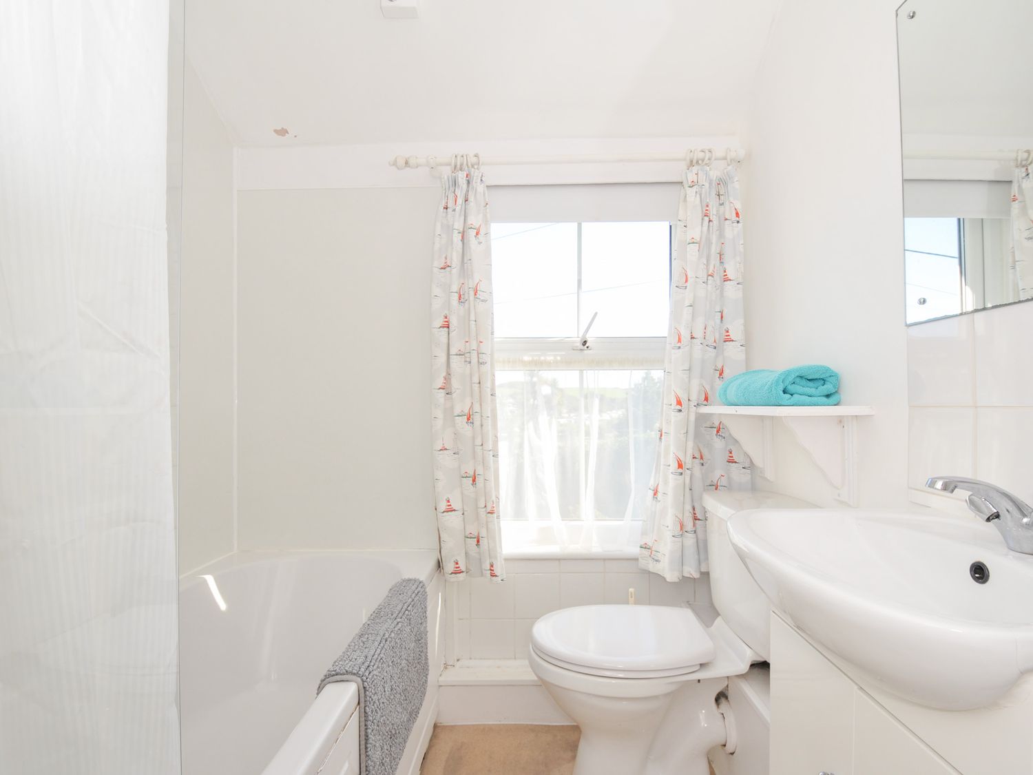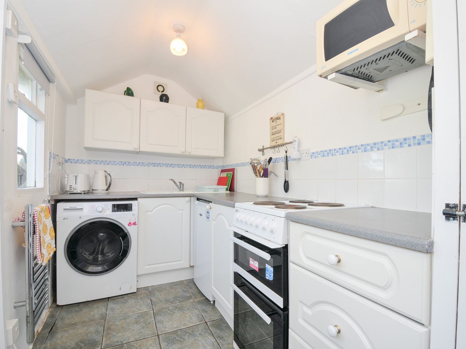 "Two bedrooms: 1 double, 1 bunk beds (children). Separate bathroom with shower over the bath, basin and WC. Ground floor has kitchen, sitting with dining area and an outside courtyard."