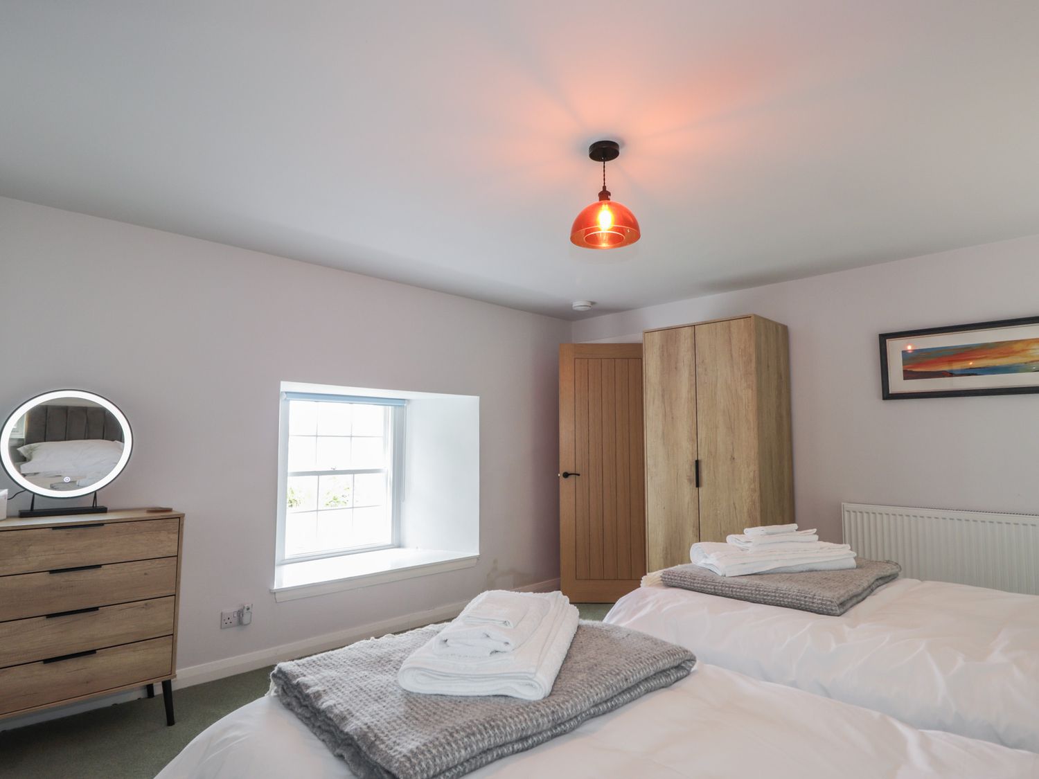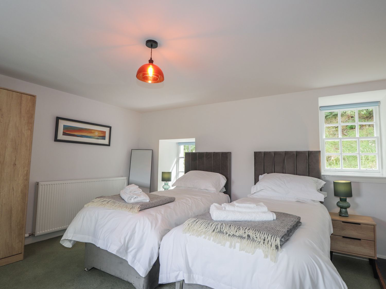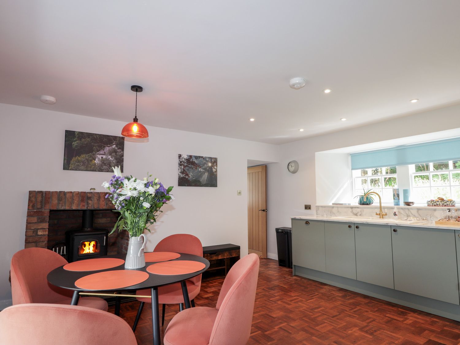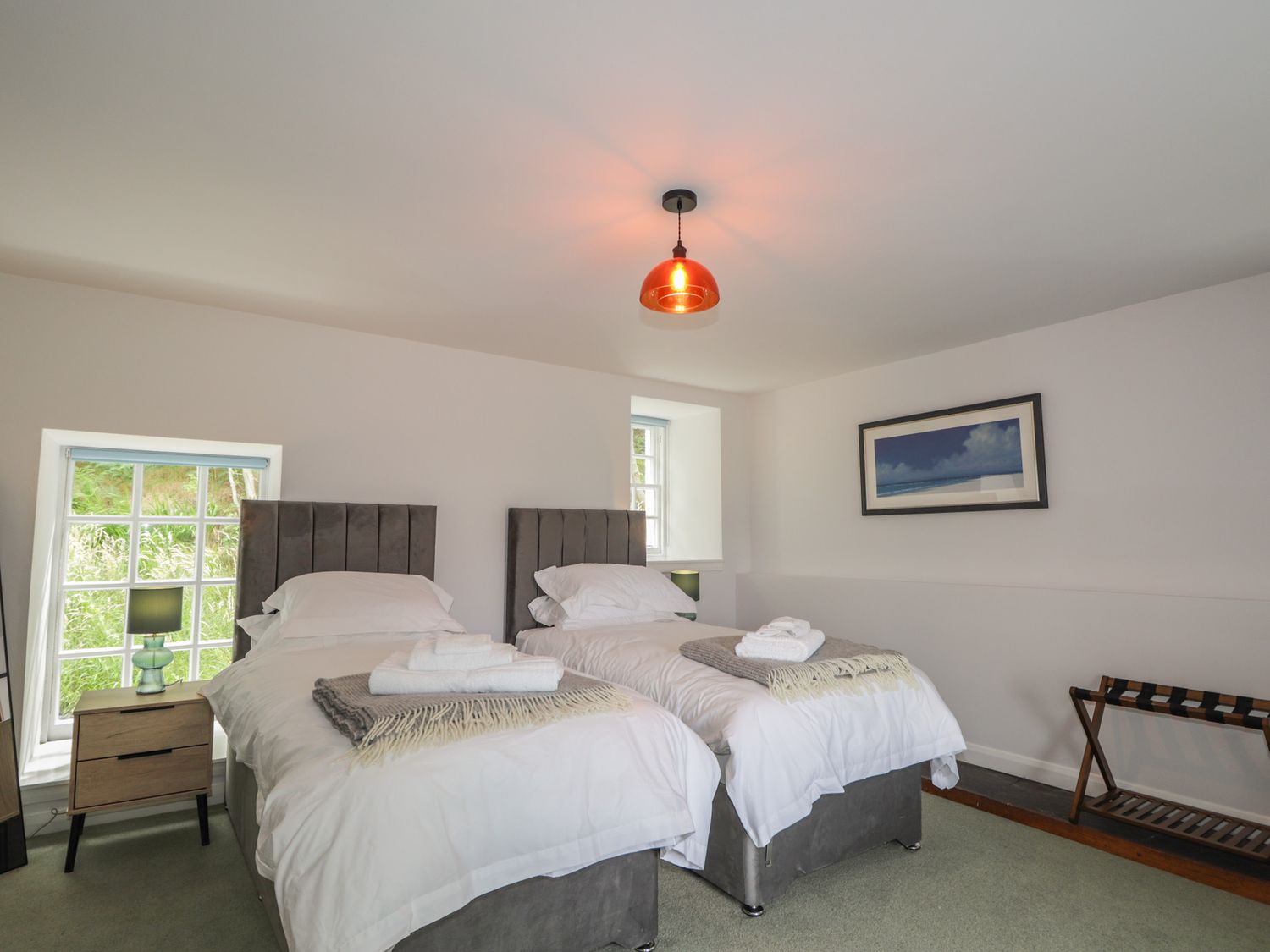 "Two bedrooms: 1 x super-king (zip/link), 1 x ground-floor twin. Ground-floor shower room with walk-in shower, basin, heated towel rail and WC. Bathroom with freestanding bath, walk-in shower, basin, and WC. Kitchen/diner with woodburning stove. Utility. First-floor sitting room with electric fire"