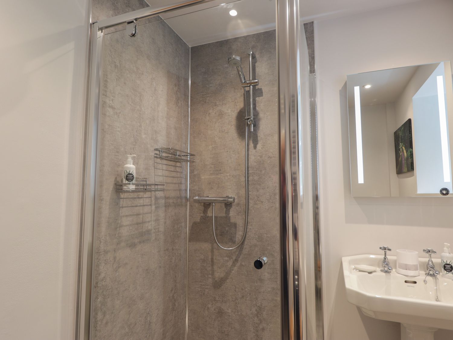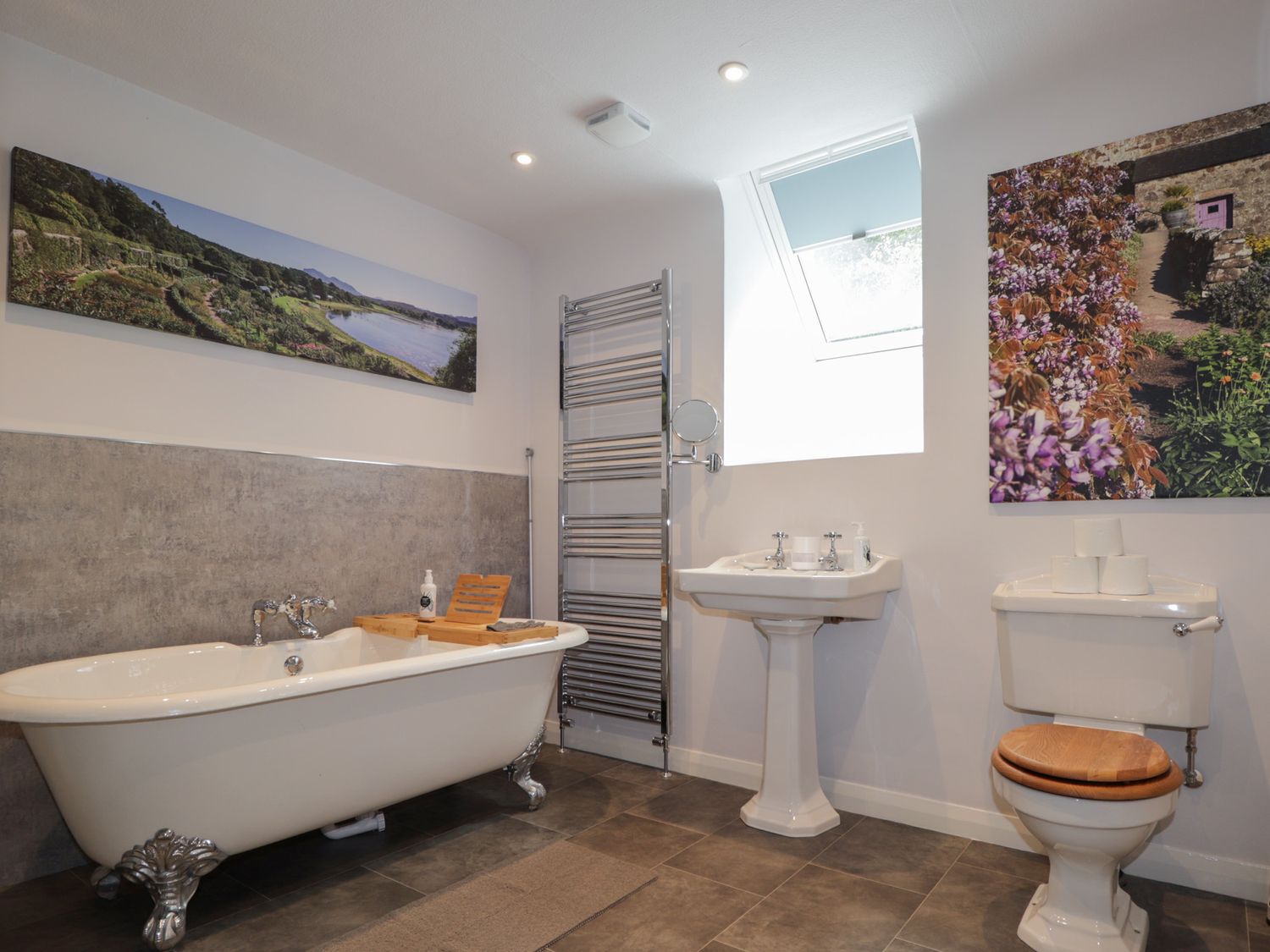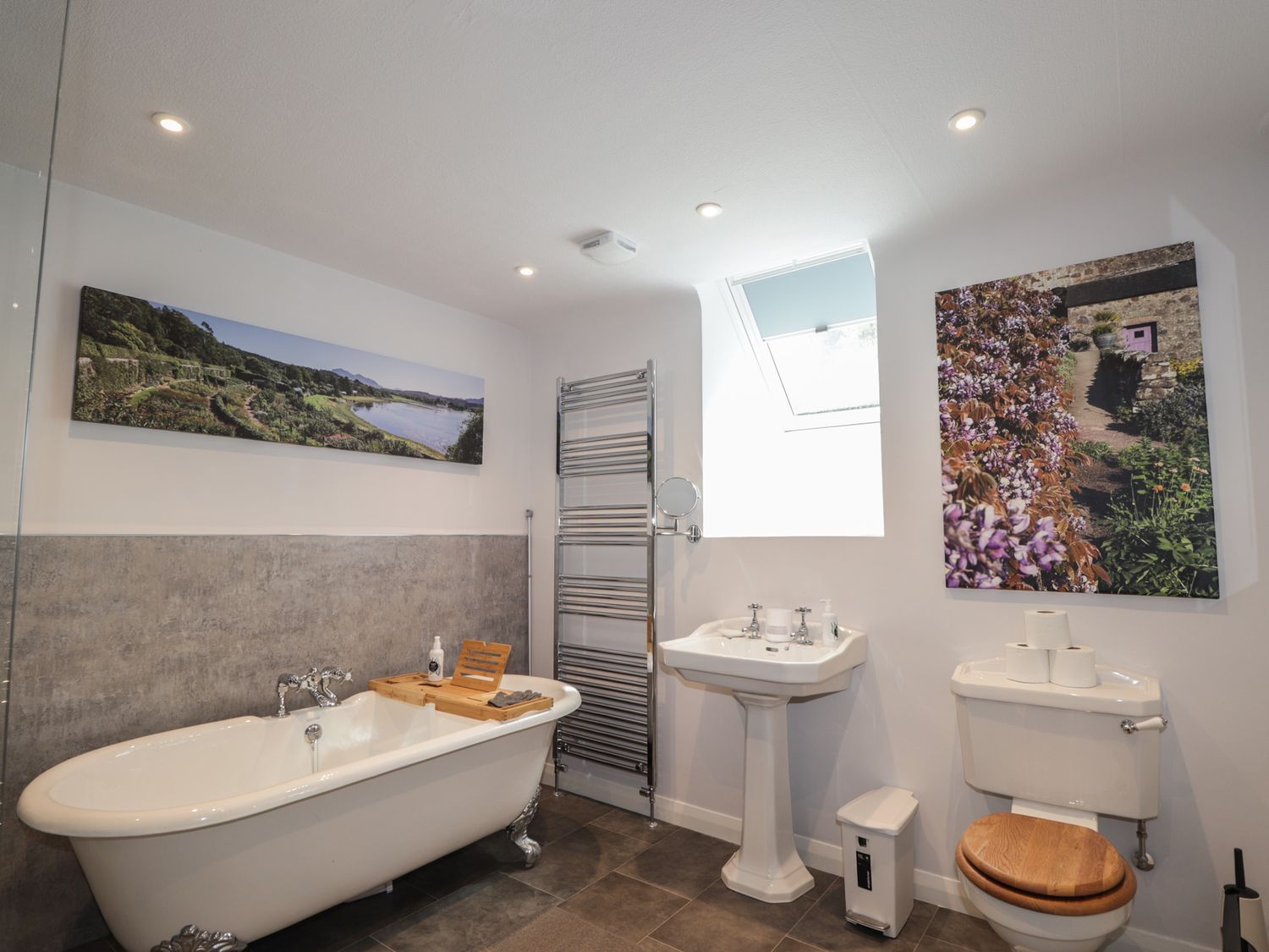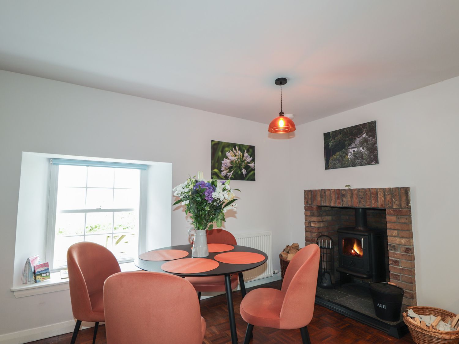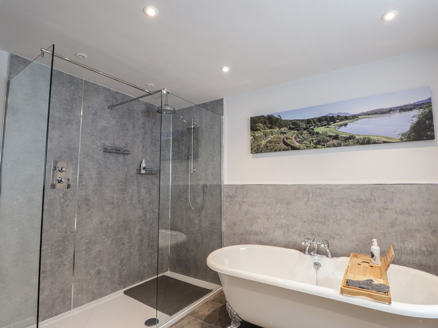 "Two bedrooms: 1 x super-king (zip/link), 1 x ground-floor twin. Ground-floor shower room with walk-in shower, basin, heated towel rail and WC. Bathroom with freestanding bath, walk-in shower, basin, and WC. Kitchen/diner with woodburning stove. Utility. First-floor sitting room with electric fire"