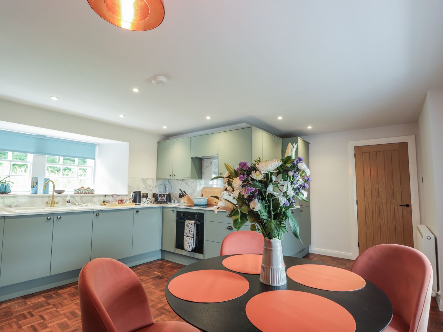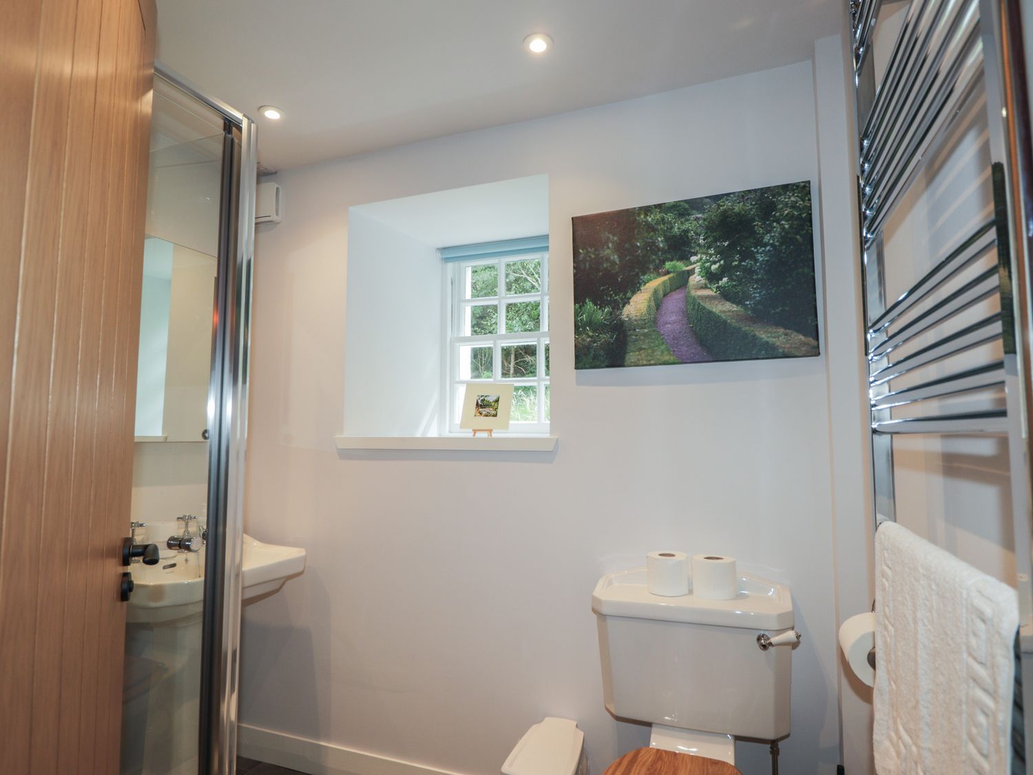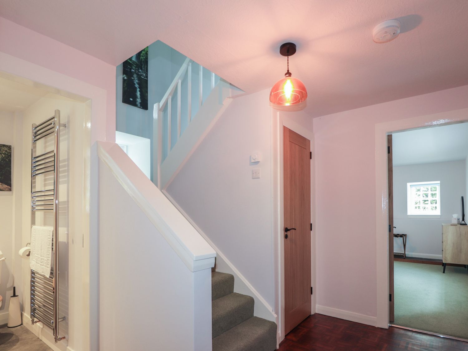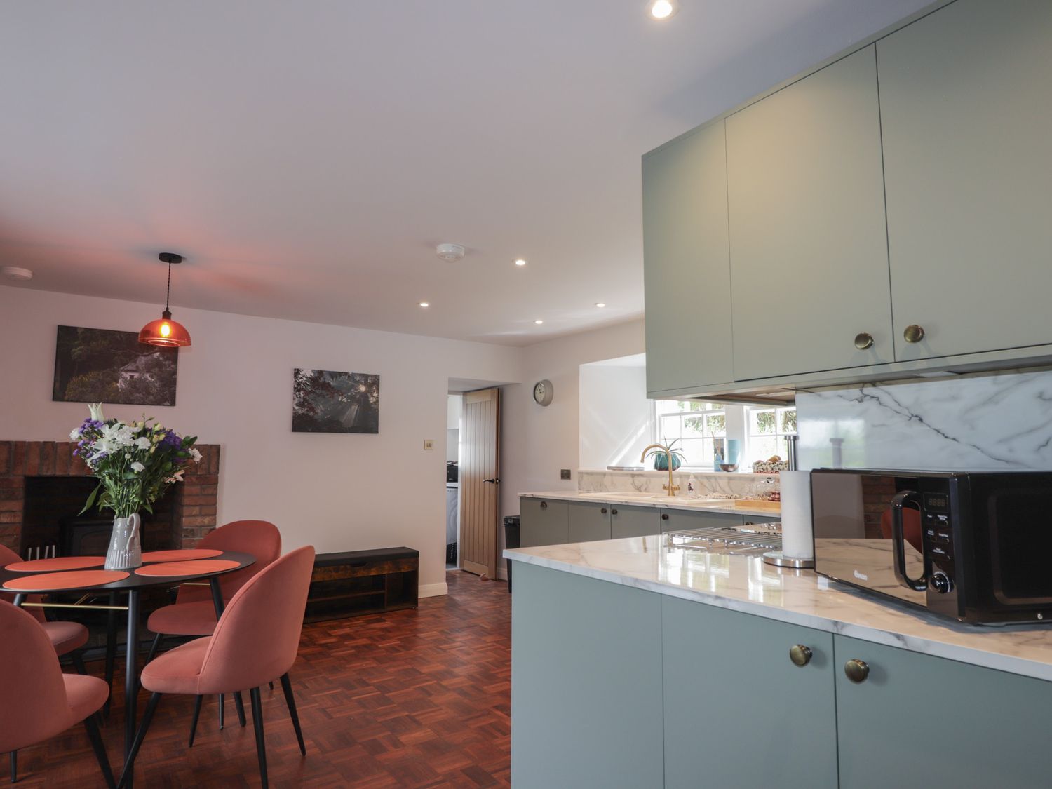 "Two bedrooms: 1 x super-king (zip/link), 1 x ground-floor twin. Ground-floor shower room with walk-in shower, basin, heated towel rail and WC. Bathroom with freestanding bath, walk-in shower, basin, and WC. Kitchen/diner with woodburning stove. Utility. First-floor sitting room with electric fire"
