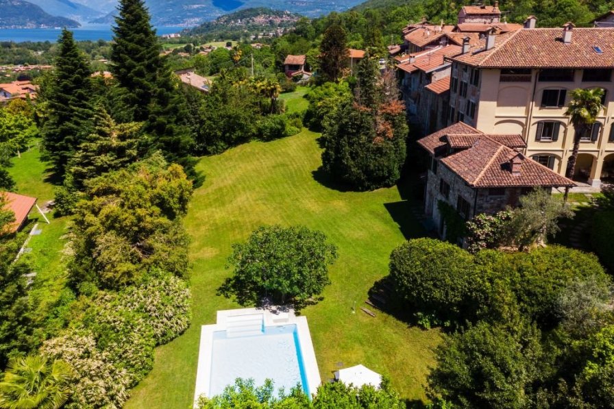 9-room villa 500 m2 on 5 levels. **Inside** * Comfortable and stylish furnishings: entrance hall * Dining room * Large kitchen (7 hot plates, oven, dishwasher, freezer, electric coffee machine) * separate WC * Upper floor: 1 room with sloping ceilings with 1 sofabed and 1 double bed * Shower/bidet/WC * 2nd upper floor: 2 double bedrooms * 1 room with 1 bed and 1 double bed * Bath/bidet/WC, shower/bidet/WC * 3nd upper floor: open large living room * 1 room with 2 beds (length 190 cm) * Lounge with TV * Bath/bidet/WC * Top floor: open lounge * Shower/bidet/WC * Oil heating (extra) * Heating available only from 15/10-15/04 * Patio roofed * Terrace furniture * Panoramic view of the lake and the mountains * Facilities: washing machine * Internet (WiFi, free) * Two bedrooms share one bathroom with direct access to it * The lounge at the top floor faces the living area at the floor below * CIR: 012114-CNI-00007 **Outside** * Old, large villa "Torre", from the 19th century * 2 km from the centre of Porto Valtravaglia, in a quiet, elevated position, area with little traffic, 2.2 km from the lake * Private: garden 2'500 m2 (fenced) with lawn and trees, swimming pool (12 x 6 m, depth 80 - 200 cm, 15/05-15/09) * Shower/WC in the pool area, table tennis, patio, barbecue * In the house: lift * Parking (for 3 cars) on the premises, public parking 50 m * Supermarket 2 km, restaurant, bar 500 m, railway station "Porto Valtravaglia" 2 km * Nearby attractions: Luino 8 km, Laveno 10 km * Please note: car recommended * Part of the house is closed and unoccupied