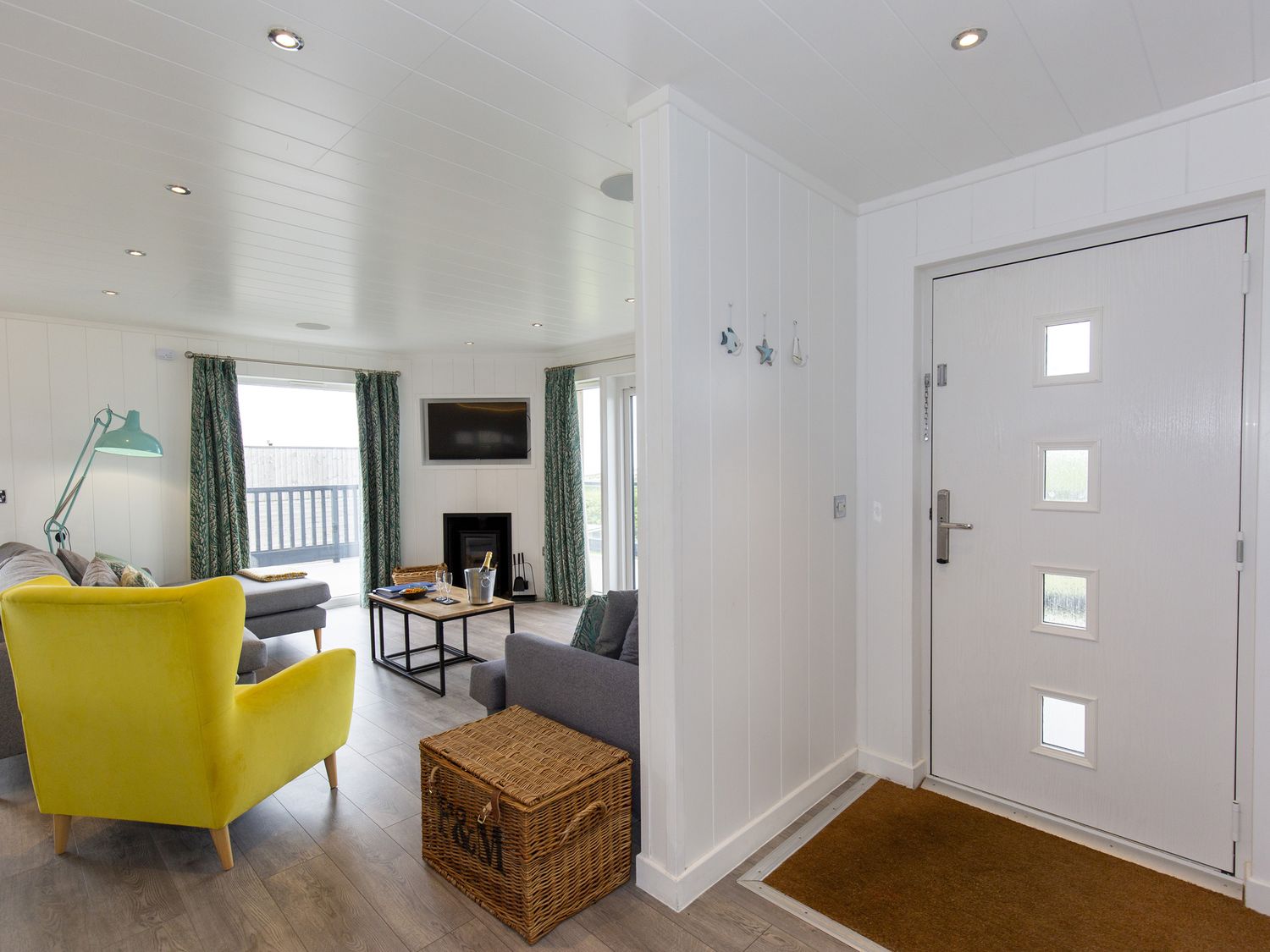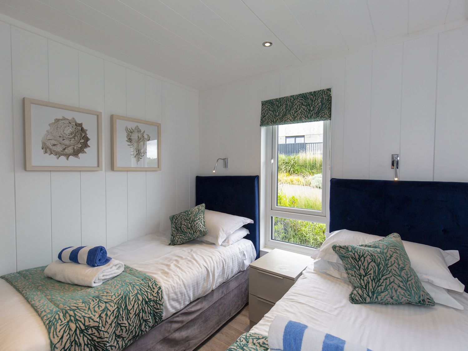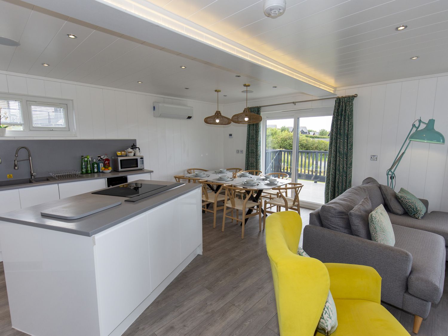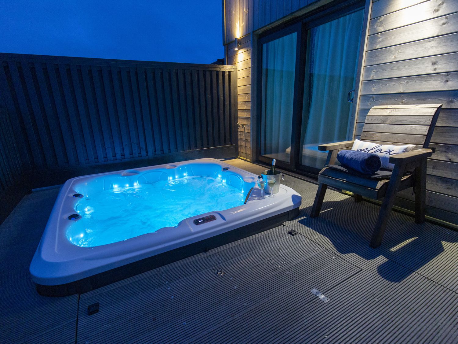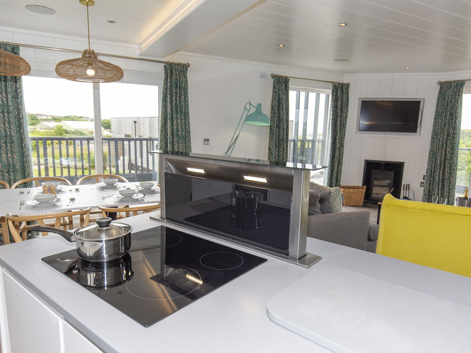 "Dahlia, consists of an open-plan living area with a double electric oven, induction hob, microwave, fridge/freezer, washer/dryer, dishwasher, woodburning stove.The bedrooms consist of a king-size with en-suite, double with en-suite, and two twins. There is a bathroom with a built-in TV. WiFi, fuel, power, bed linen, and towels are included in the rent. Outside, there is an enclosed garden decking with furniture and hot tub, and off-road parking for two cars. Sorry, no pets and no smoking. Whatever the weather, a wonderful stay awaits at Dahlia. Note: Guests can enjoy onsite facilities: swimming pool, golf, restaurant, and more. Note: The property is not suitable for anyone who may be in a wheelchair. There are four steps to access the lodge plus the decked area. Note: The hot tub is fully drained, cleaned, and refilled on every changeover prior to your arrival. As a result, it may take some time to reach its optimal temperature and not be ready for immediate use on your arrival day."