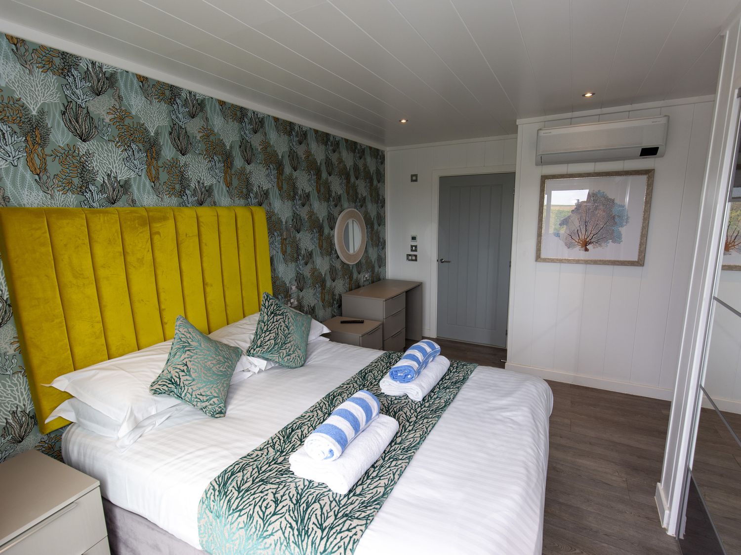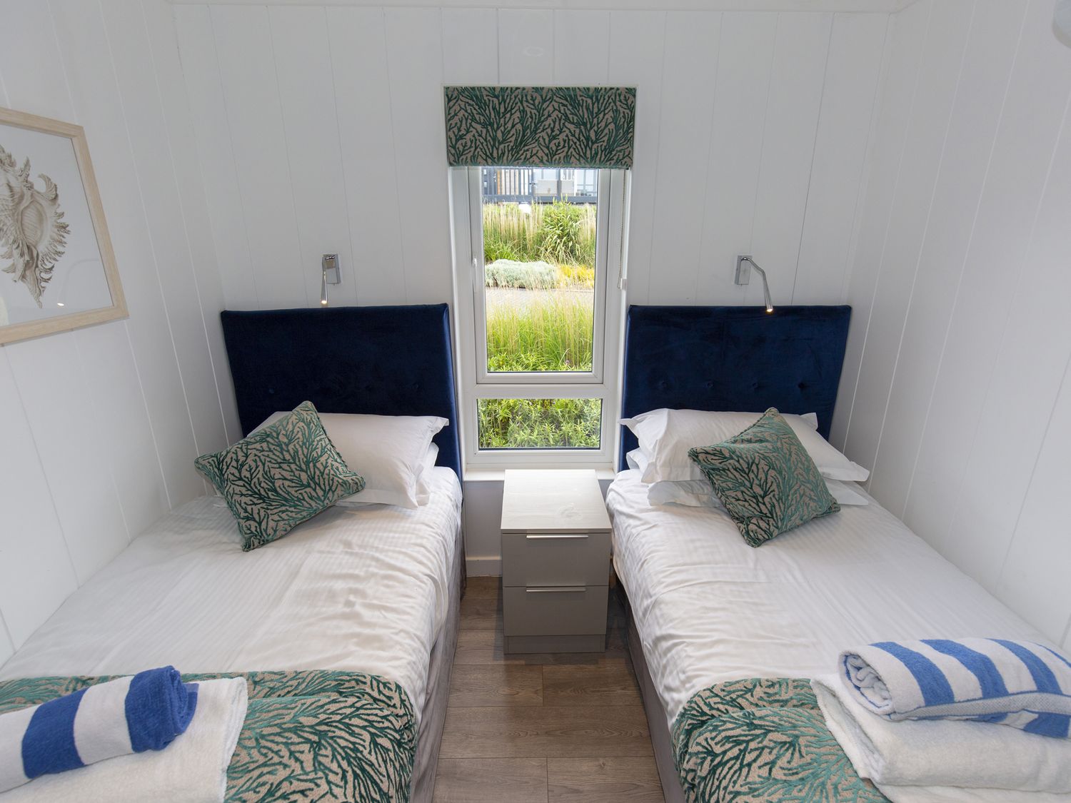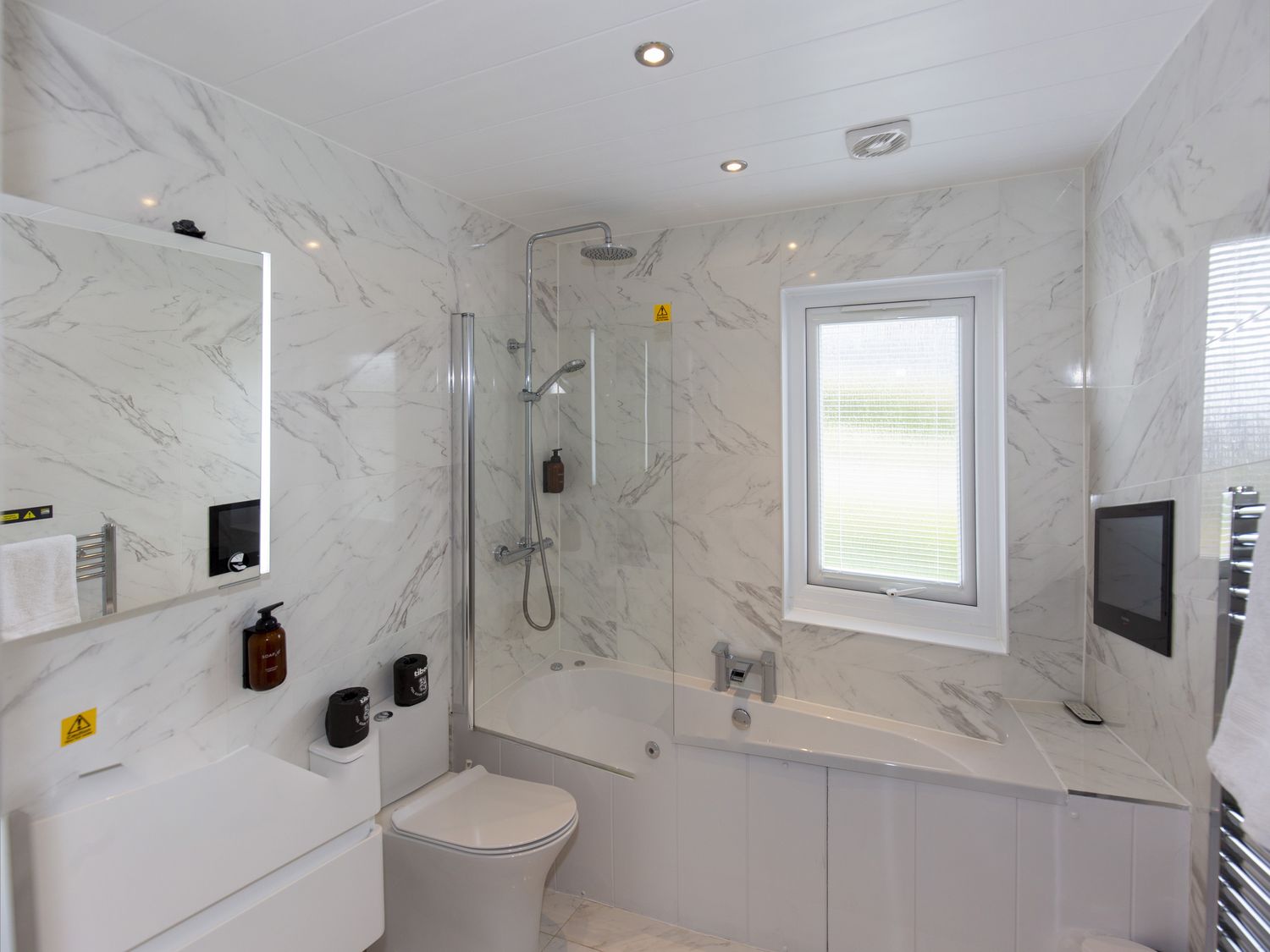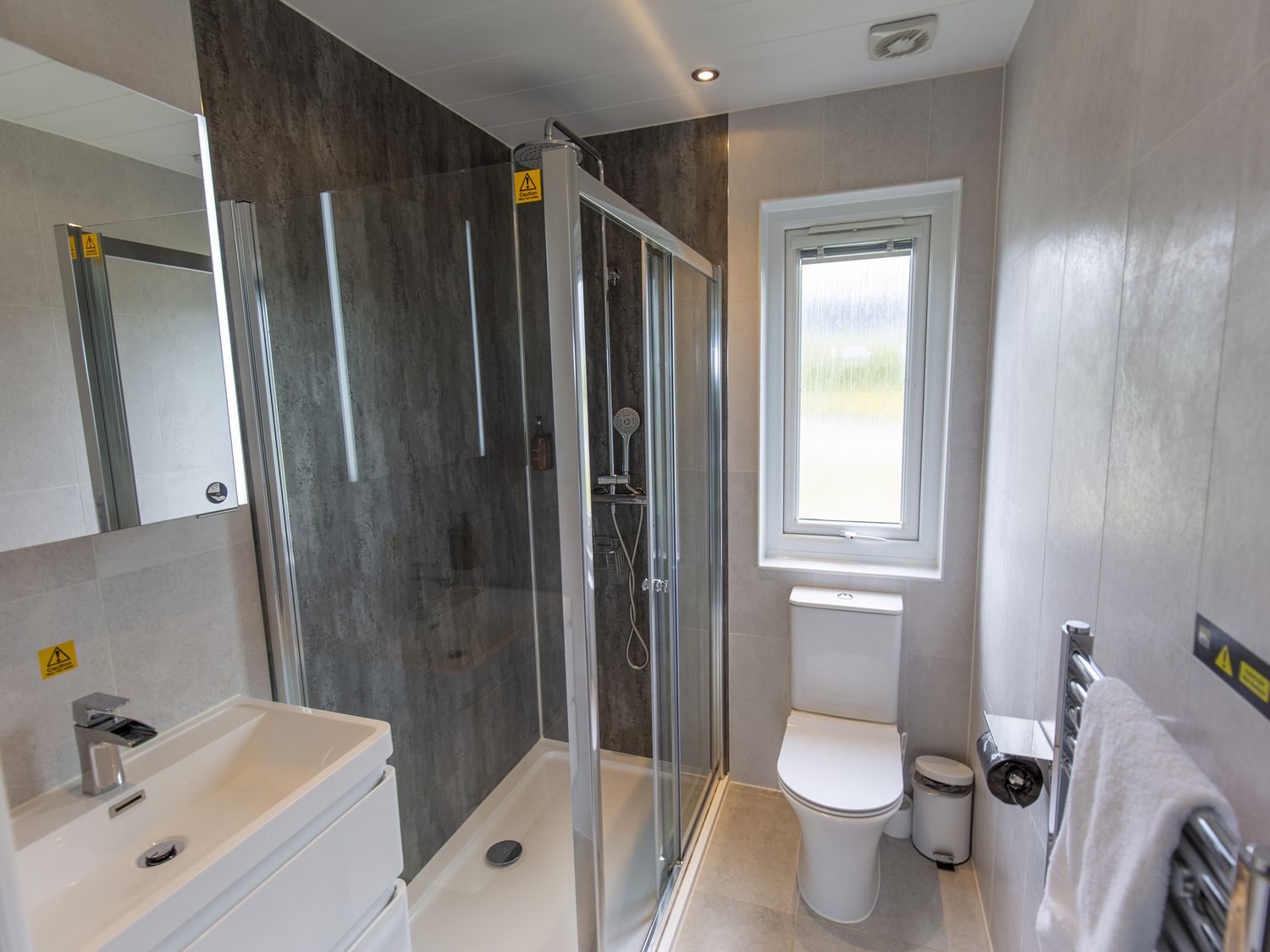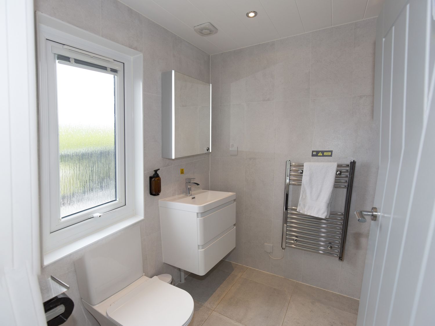 "Single-storey. Four bedrooms: 1 x king-size with TV and en-suite with walk-in shower, basin, and heated towel rail and WC, 1 x double with en-suite with walk-in shower, basin, and heated towel rail and WC, 1 x twin (zip/link, can be super-king-size on request), 1 x twin. Bathroom with bath, shower over, basin, heated towel rail, WC and built-in TV. Open-plan living space with kitchen, dining area, and sitting area with woodburning stove"