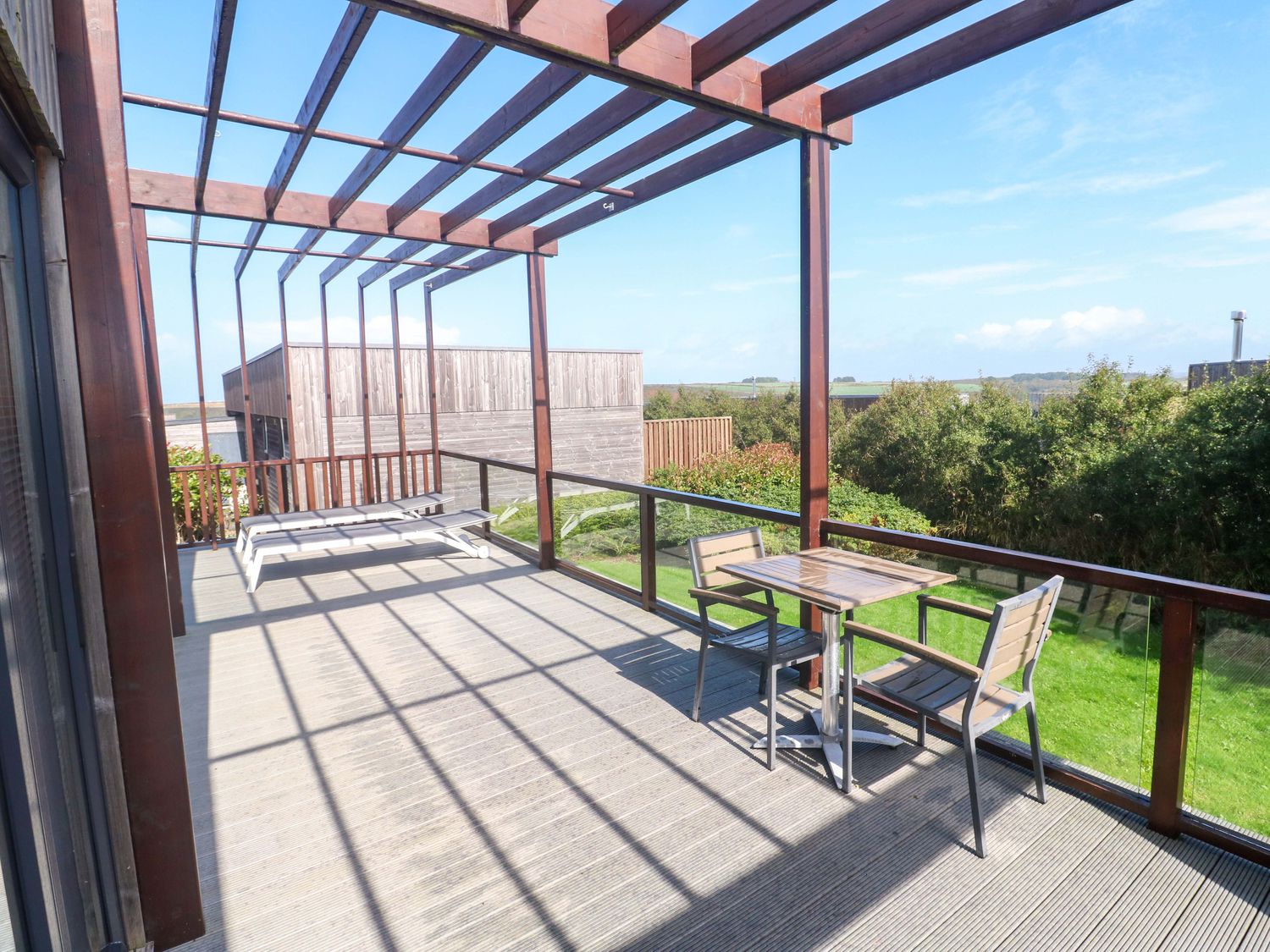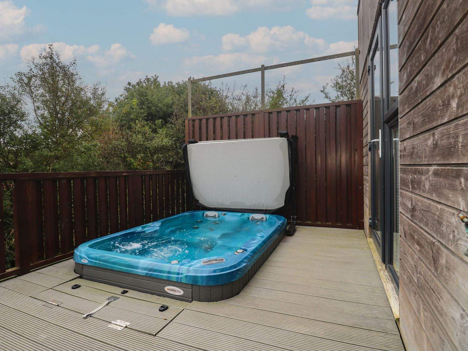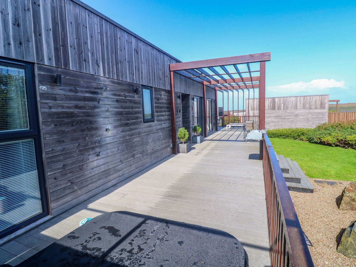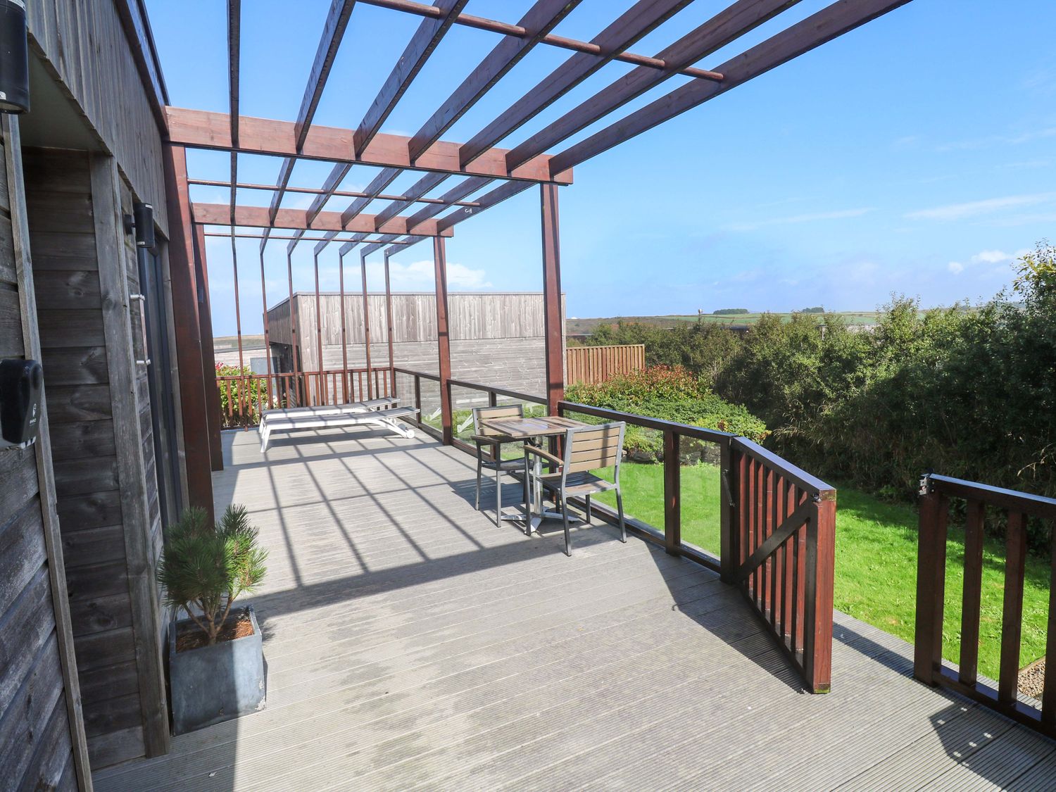 "Lodge 83, Gwel an Mor, a single-storey charming holiday lodge consists of a kitchen with microwave, electric oven and hob, dishwasher, fridge/freezer, and washing machine, a dining room with dining seating, and a sitting room with Smart TV and woodburning stove. The bedrooms consist of a super-king-size, super-king-size with en-suite, and twin. There is a bathroom with bath, shower over, basin, heated towel rail, and WC and integrated TV. WiFi, fuel, power, bed linen, and towels included in the rent. Outside, there is a lawn area with sun loungers. Enclosed decking with furniture and hot tub and designated parking for two cars. Sorry, no pets and no smoking. Whatever the weather, a wonderful stay awaits at Lodge 83, Gwel an Mor. Note: On-site facilities available. Note: This property has a Good Housekeeping Bond of 350GBP"