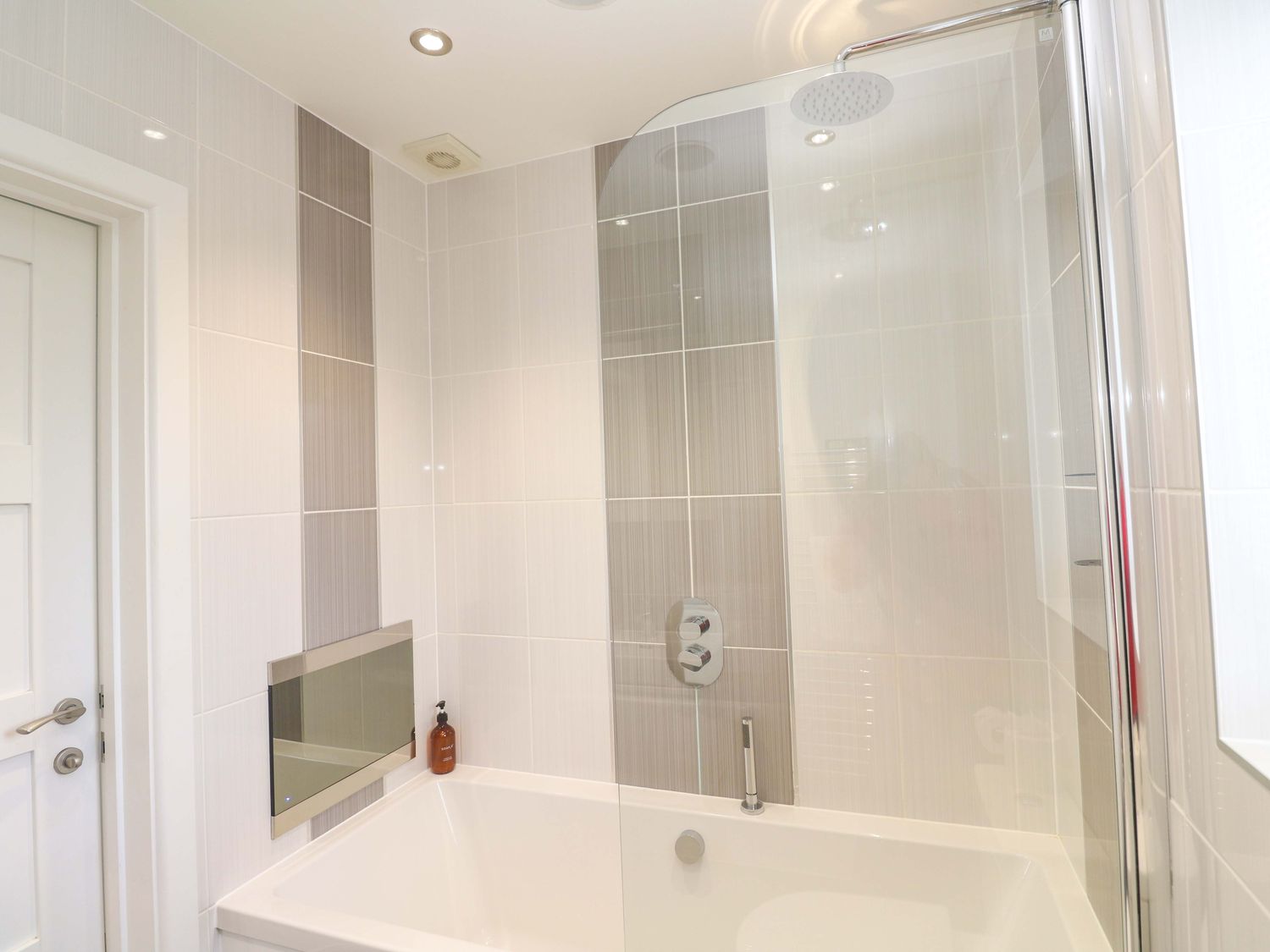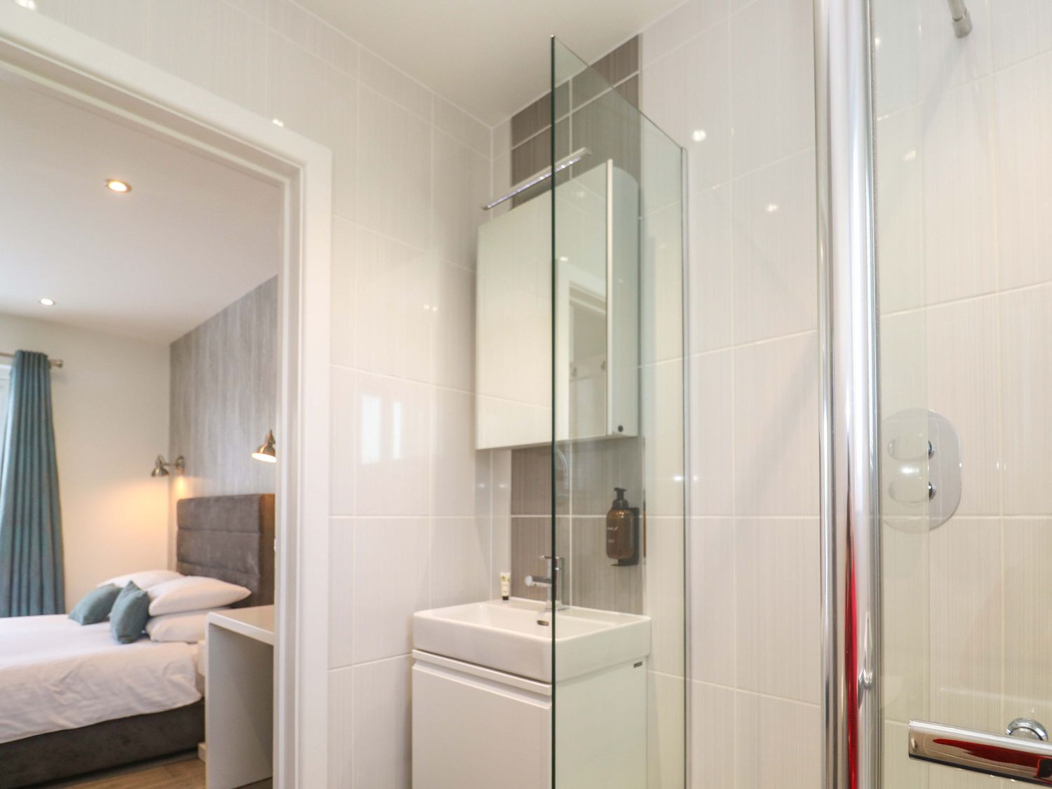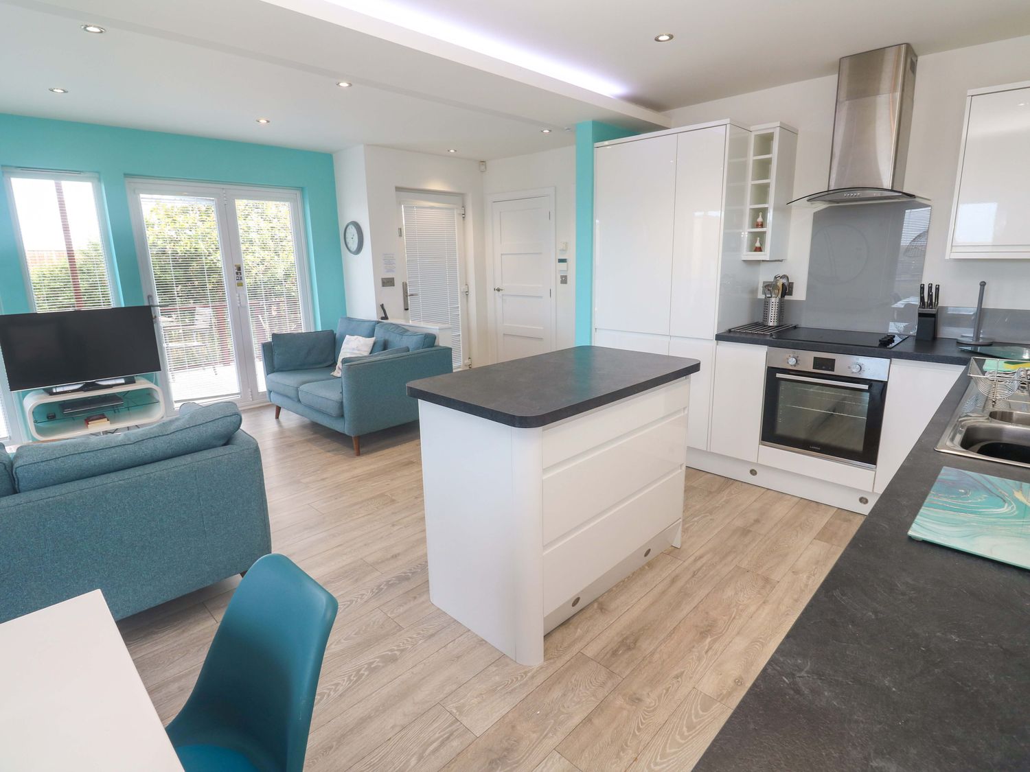 "Single-storey. Three bedrooms: 1 x king with TV, en-suite with walk in shower, basin, WC and heated towel rail-á, 1 x twin (zip and link to super king on request), 1 x twin. Bathroom with integrated TV, bath, shower over, basin, heated towel rail, and WC. Open-plan living space with kitchen, dining area and sitting area with woodburning stove and air conditioning"