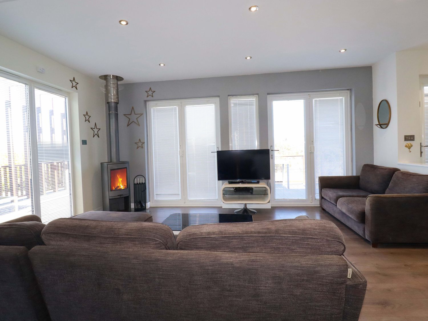 "Single storey. Three bedrooms: 1 x super king-size (zip/link, can be twin on request), 1 x double with TV and en-suite, 1 x twin. Bathroom with bath, shower over, basin and WC. Shower room with walk-in shower, basin and WC. Open-plan living space with kitchen, dining area and sitting area with woodburning stove"