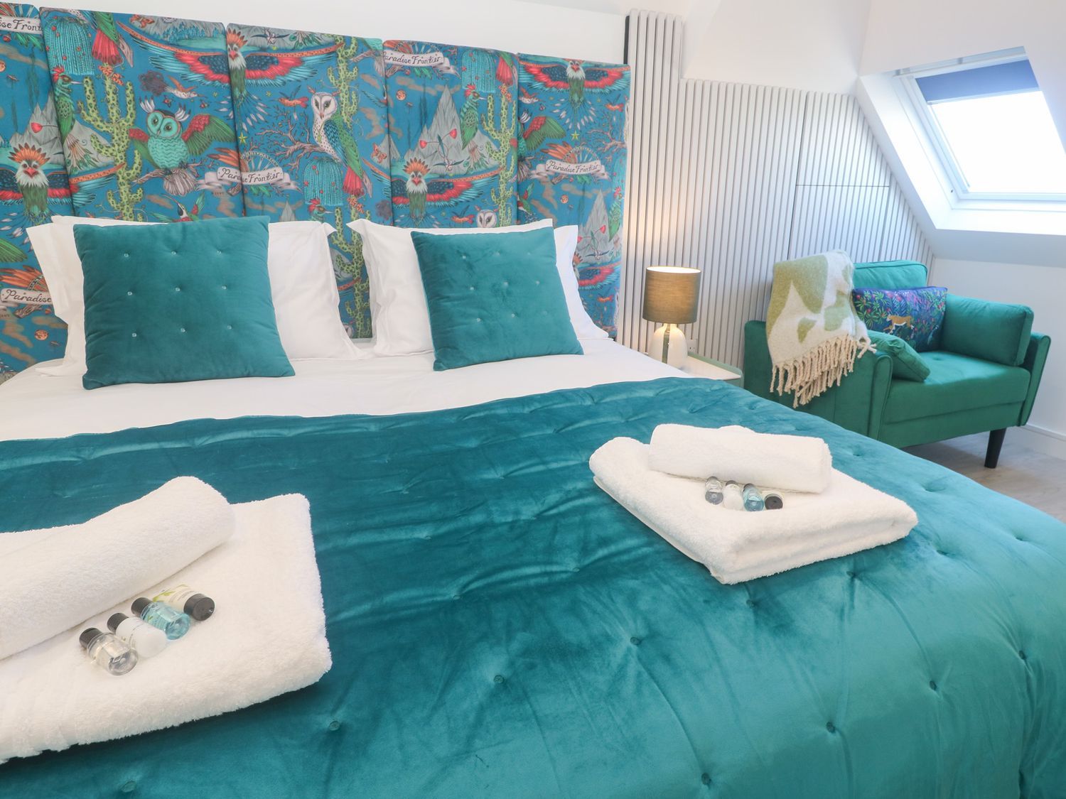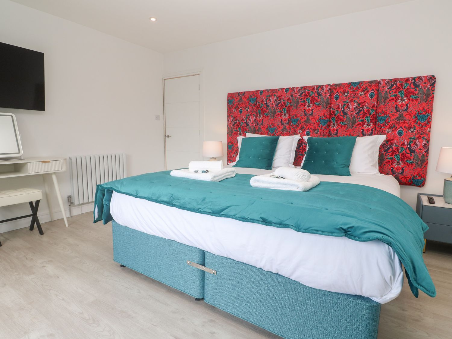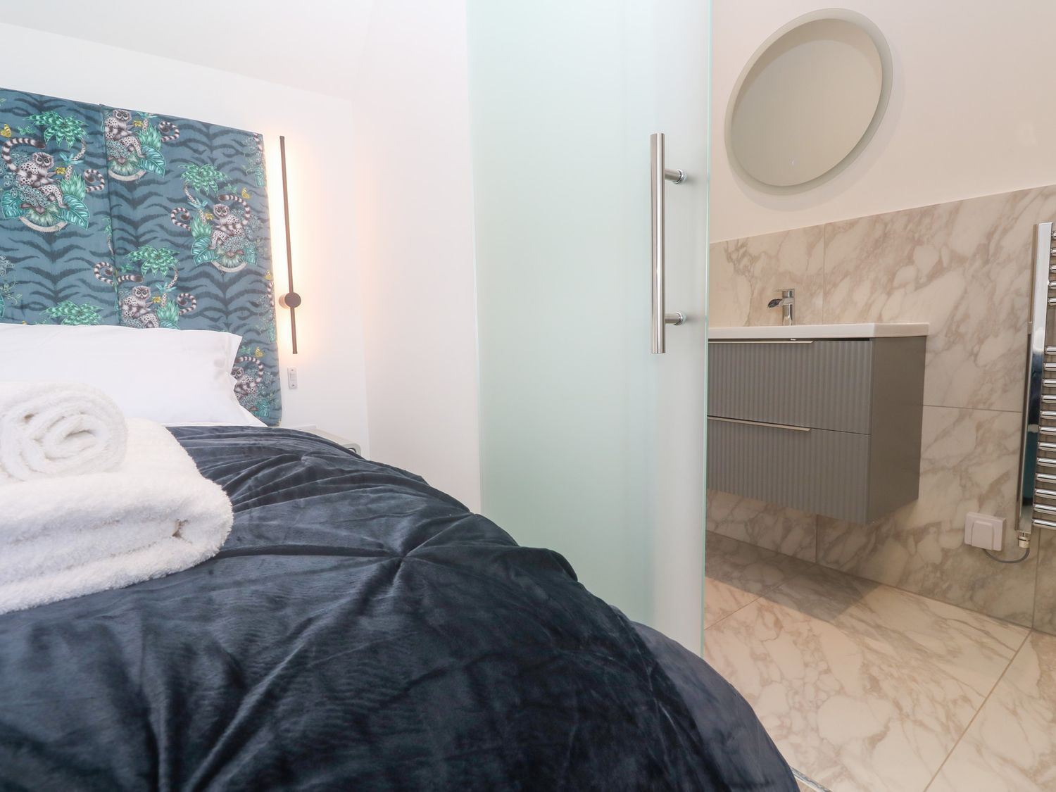 "Four bedrooms: 1 x ground-floor super-king (zip/ link, can be twin on request), 1 x ground-floor king-size, 1 x upstairs super-king with TV, 1 x upstairs king-size with TV and en-suite walk-in shower, basin, heated towel rail and WC. Ground-floor shower room with walk-in shower, basin, heated towel rail, and WC. Kitchen/diner. Sitting room with woodburning stove"