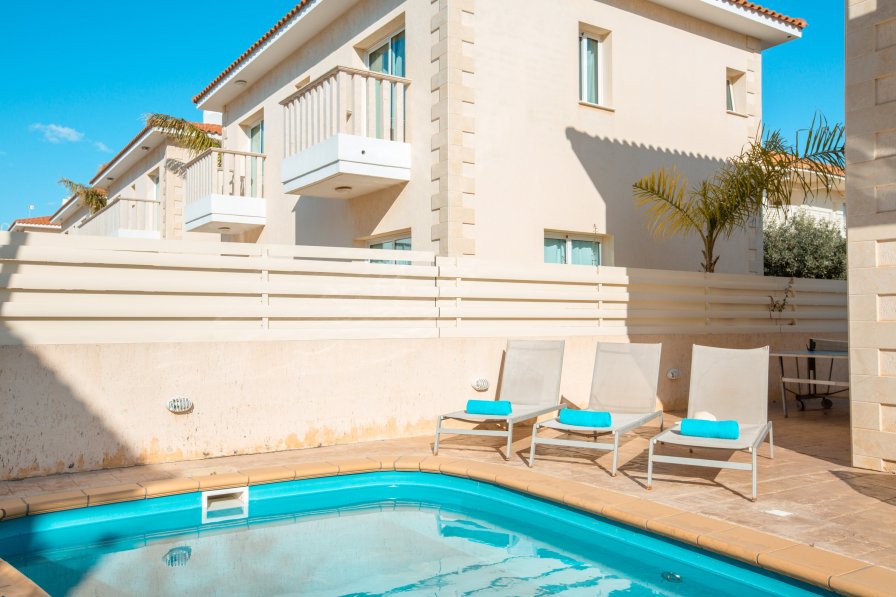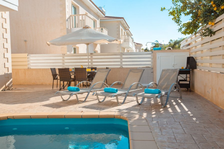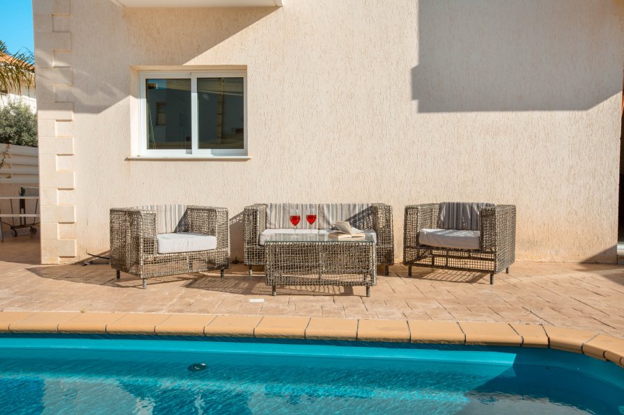 Villa 035 is located in a prime position in Pernera. Situated in a quiet cul-de-sac, it is within easy walking distance to all amenities that the area has to offer. The owners have paid great attention in both looks and comfort to create a fantastic holiday home. The interior offers top quality furnishings with carefully chosen colorful decorations to give a sense of warmth upon entering. For the adults, the outdoor cosy lounge is the perfect place to relax and unwind with your morning coffee or evening cocktails whilst taking in the glorious Cypriot sunshine. This private property is completely gated, making it safe for children, and has off road parking to the side. The stunning pool with Roman steps takes centre stage at the rear of this glorious property. The main entrance, at the front of the property, opens into a bright and modern living/dining area which has patio doors leading to the pool and outdoor seating area. Relax in the cool air conditioning on the large L shaped, brown leather sofa and rest your drink on the marble coffee table. and access the WiFi. The added touches of decorative light fittings and canvas give an added touch of class throughout. There is also a convenient ground floor w/c. Enjoy preparing your breakfast, lunch or dinner in the fully equipped kitchen complete with electric oven and hob, fridge freezer, dishwasher and microwave. A large window over the sink lets in the glorious sunshine and gives you views of the pool area. Enjoy your meals indoors at the wooden table with 6 leather/suede chairs or you can dine al fresco at the large rattan/glass table with 6 chairs. Should you require shade, a parasol and base are available. Relax on the wicker lounge style furniture whilst the children entertain themselves splashing around in the sparking pool or enjoying a game of table tennis. A gas BBQ, 6 sun loungers and an outdoor shower complete your outdoor facilities. Stairs complete with handrails and 2 windows lead to the first floor of the property where there are 3 good size bedrooms, 2 doubles and 1 twin, all of which have fitted wardrobes, bedside cabinets with lamps, chrome bedsteads, air conditioning and matching furniture throughout. There is also a large family bathroom with shower over bath, mirror over the sink and a handy shaving socket. The master double bedroom has a patio door leading onto the balcony and a window to the front of the property with blinds and curtains. There is also an ensuite shower room with hand basin and w/c. The 2nd double bedroom is furnished in the same manner as the master bedroom, but it also has a wooden dresser with a long mirror and plug sockets. Patio doors with curtains open onto the balcony which overlooks the pool area. Finally the 3rd twin bedroom, again with matching furniture and a chest of drawers, also has a balcony which overlooks the sparkling pool and garden area. Please note: - This property doesn't accept groups under the age of 25 years or same gender group. - Do not leave your children unattended at any time. - We have no responsibility for any accidents or injuries cause by the misuse of malfunction of the equipment. - All Special Requests are subject to availability and additional charges may apply. - A refundable DAMAGE DEPOSIT of 300 € is required before the arrival ( by card) About Pernera Pernera is a small yet pretty harbour town on the eastern coast of Cyprus. It radiates a relaxed and easy-going atmosphere, so typical of the Mediterranean. The new floodlit boardwalk and coastal path means Protaras is now less than a 20-minute ocean-side stroll away from Pernera, day or night. The local water park in Pernera is ideal for families with its water rides, eateries and relaxing areas.