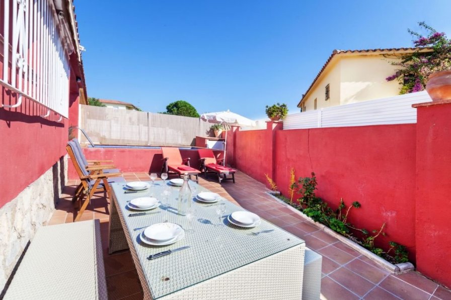 "Marisol", 5-room house on the ground floor. Practical furnishings: * Living room, on 2 levels with open-hearth fireplace and satellite TV * Exit to the terrace * Dining room * Exit to the terrace * 1 room with 1 french bed (150 cm, length 190 cm), TV * 1 room with 1 french bed (135 cm, length 190 cm) * 1 room with 2 beds (90 cm, length 190 cm), TV * Kitchen (oven, dishwasher, 3 ceramic glass hob hotplates, freezer, electric coffee machine) * 2 baths/WC * Heating * Terrace * Terrace furniture, barbecue, deck chairs (4) * Washing machine, dryer, children's high chair, baby cot * Internet (WiFi, free) * HUTG022584. Puig Ses Forques 1 km from Sant Antoni de Calonge: * Comfortable house detached * In the resort 1 km from the centre of Sant Antoni de Calonge, 1 km from the sea, located by a road * Property (fenced), swimming pool angular (4 x 2 m, 01/05-30/05) * Outdoor shower, parking on the premises * Supermarket 1 km, restaurant 1 km, sandy beach "Sant Antoni de Calonge" 1 km * Sports harbour 4 km, golf course 6 km, riding stable 12 km * Parque Aquatico 4 km..