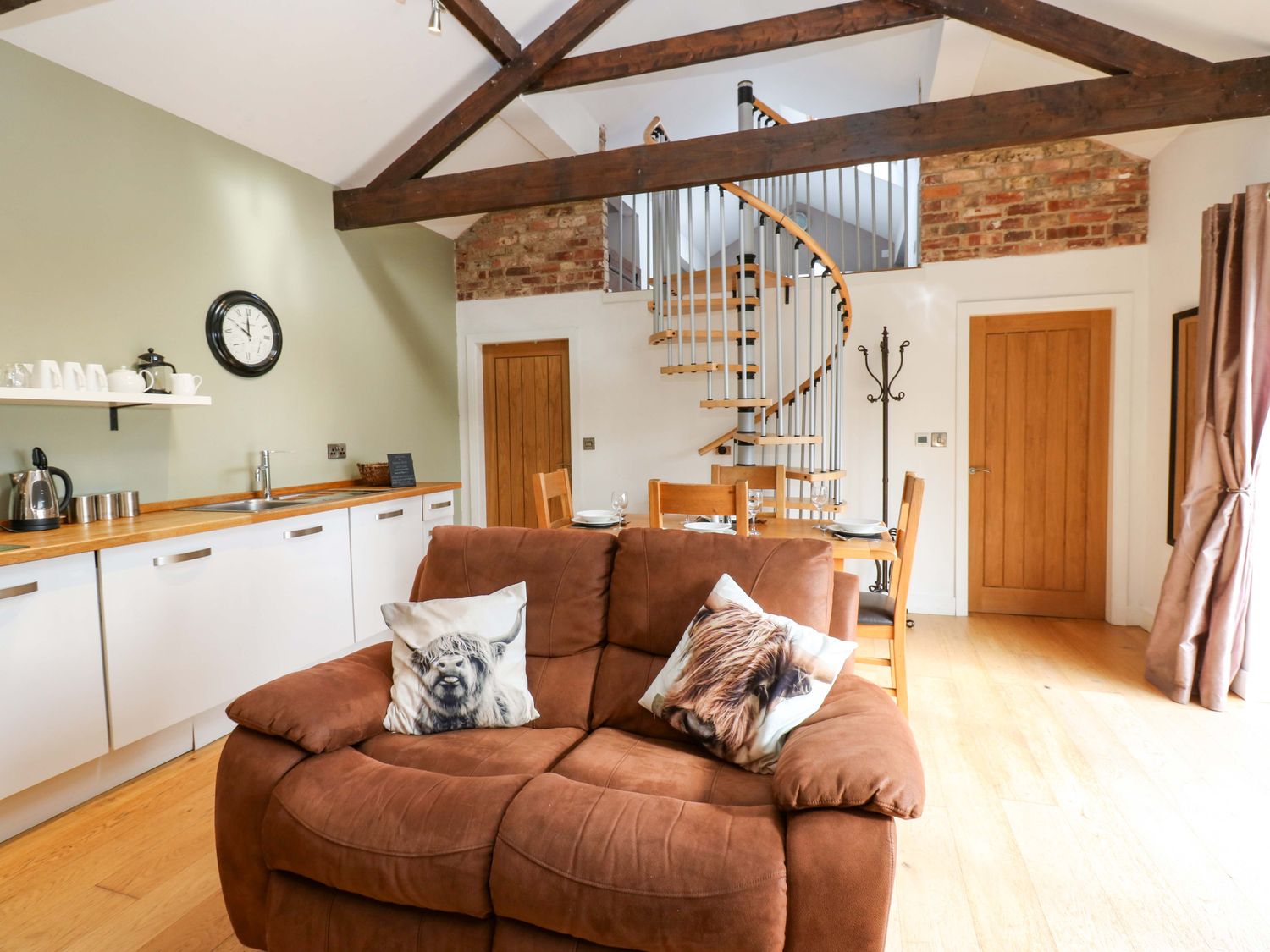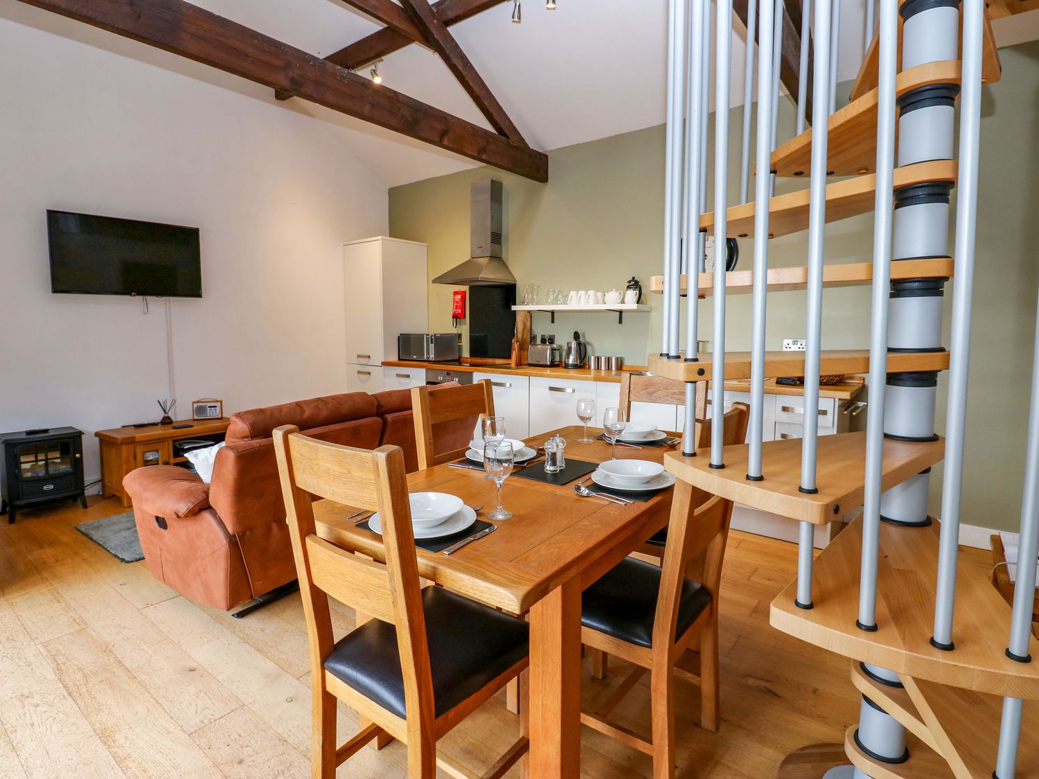 "The Warren Barn, a two-storey cottage, consists of a kitchen with oven, hob, fridge, microwave, dishwasher, and toaster, a dining room with seating for four guests, and a sitting area with TV. The bedrooms consist of a ground-floor double and a mezzanine-level double accessed via a spiral staircase, serviced by a shower room with walk-in shower, basin, heated towel rail, and WC. WiFi, fuel, power, bed linen, and towels are included in the rent. Outside, there is a front patio with furniture and off-road parking for one car. One well-behaved dog welcome. Sorry, no smoking. Within 3.1 miles you will find a shop and a pub. Bring your special someone to The Warren Barn for a private retreat. Note: One bedroom is not suitable for the less mobile as steep spiral staircase. Note: There is a ramp to enter the property"
