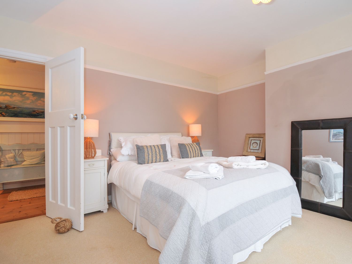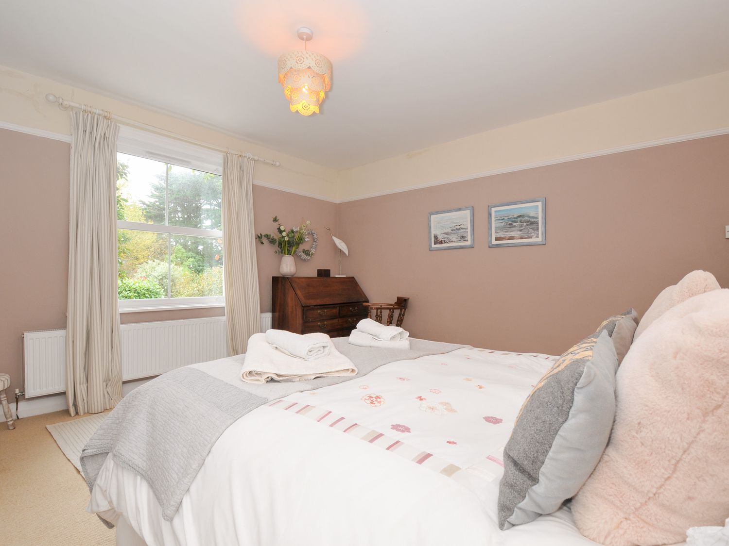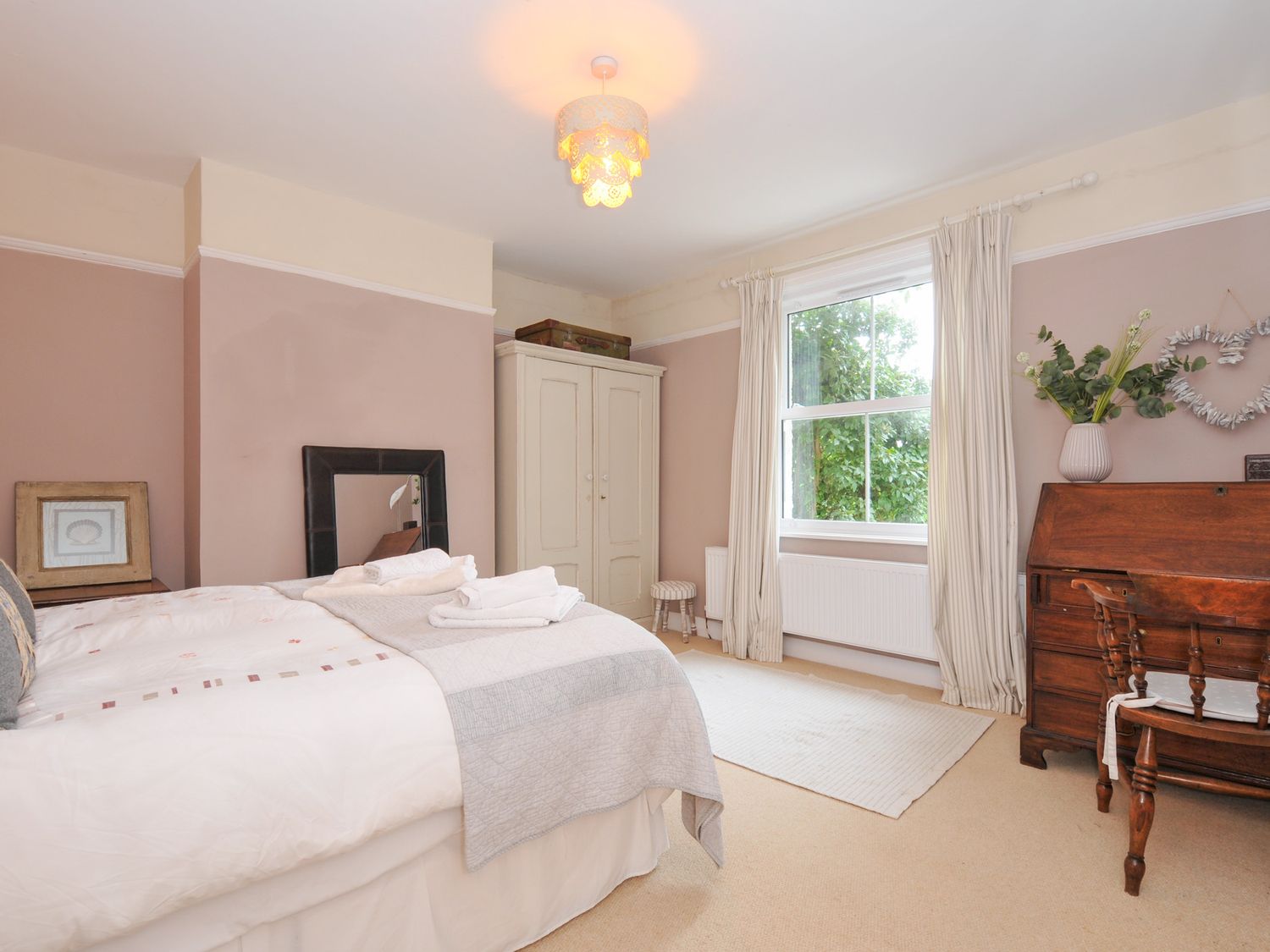 "Five bedrooms (inc. one in separate first floor annex): 1 x ground floor king-size double, 1 x ground floor small double (4ÔÇÖ6 ft), 2 x first floor king-size double, 1 x separate first floor annexe en-suite double with Juliet balcony, bath, basin and WC. First floor family bathroom with bath, shower, basin and WC. Ground floor family bathroom with bath, shower (over), basin and WC. Open-plan living area with kitchen, dining and sitting room. Utility room. Separate sitting room with football table and wood burning stove."