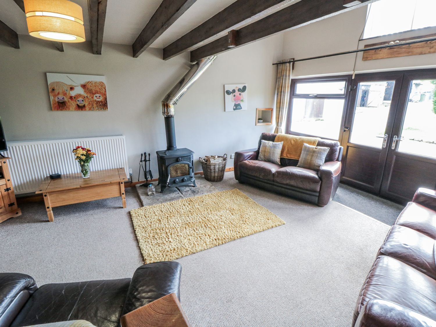 "Three bedrooms: 1 x mezzanine double, 1 x double, 1 x twin. Ground floor bathroom with bath, shower, basin and WC. Kitchen/diner. Fridge/freezer. Sitting room with woodburner."