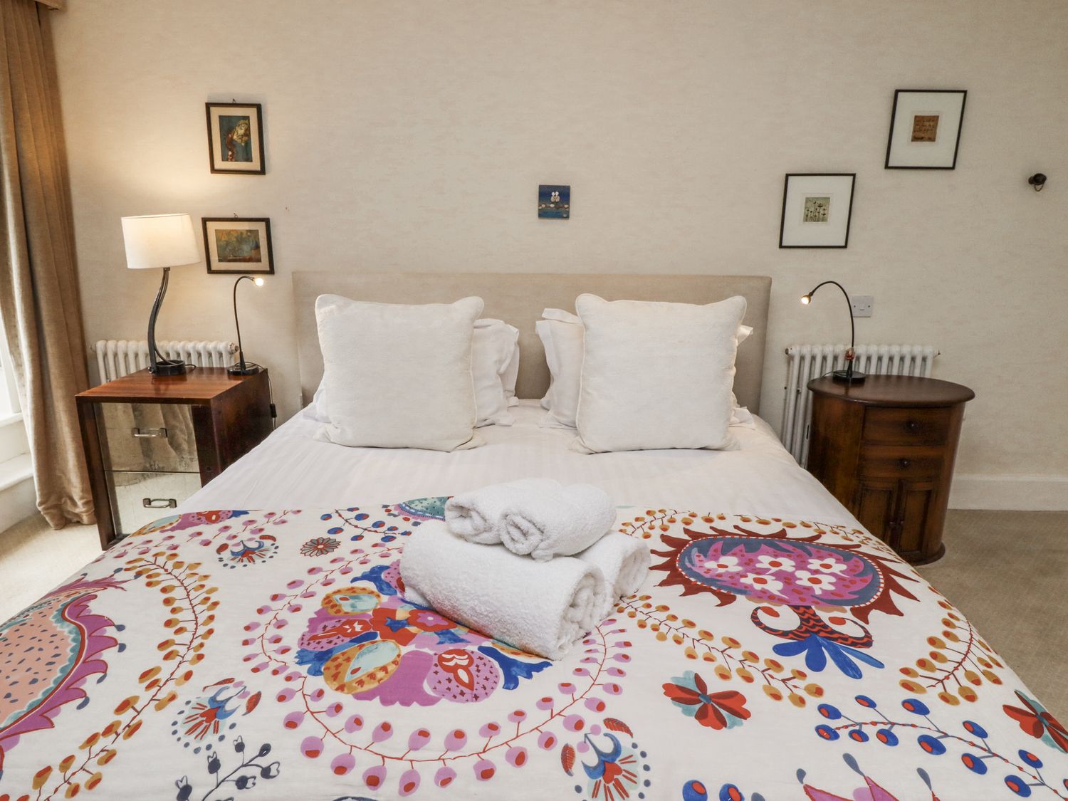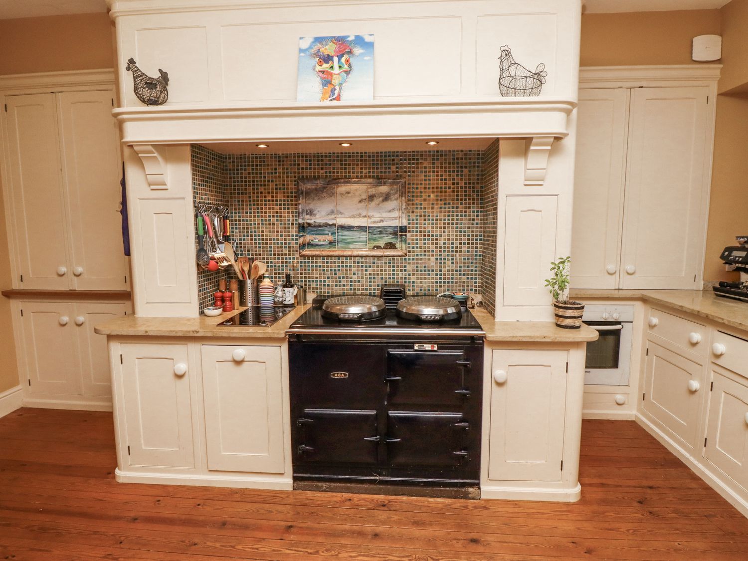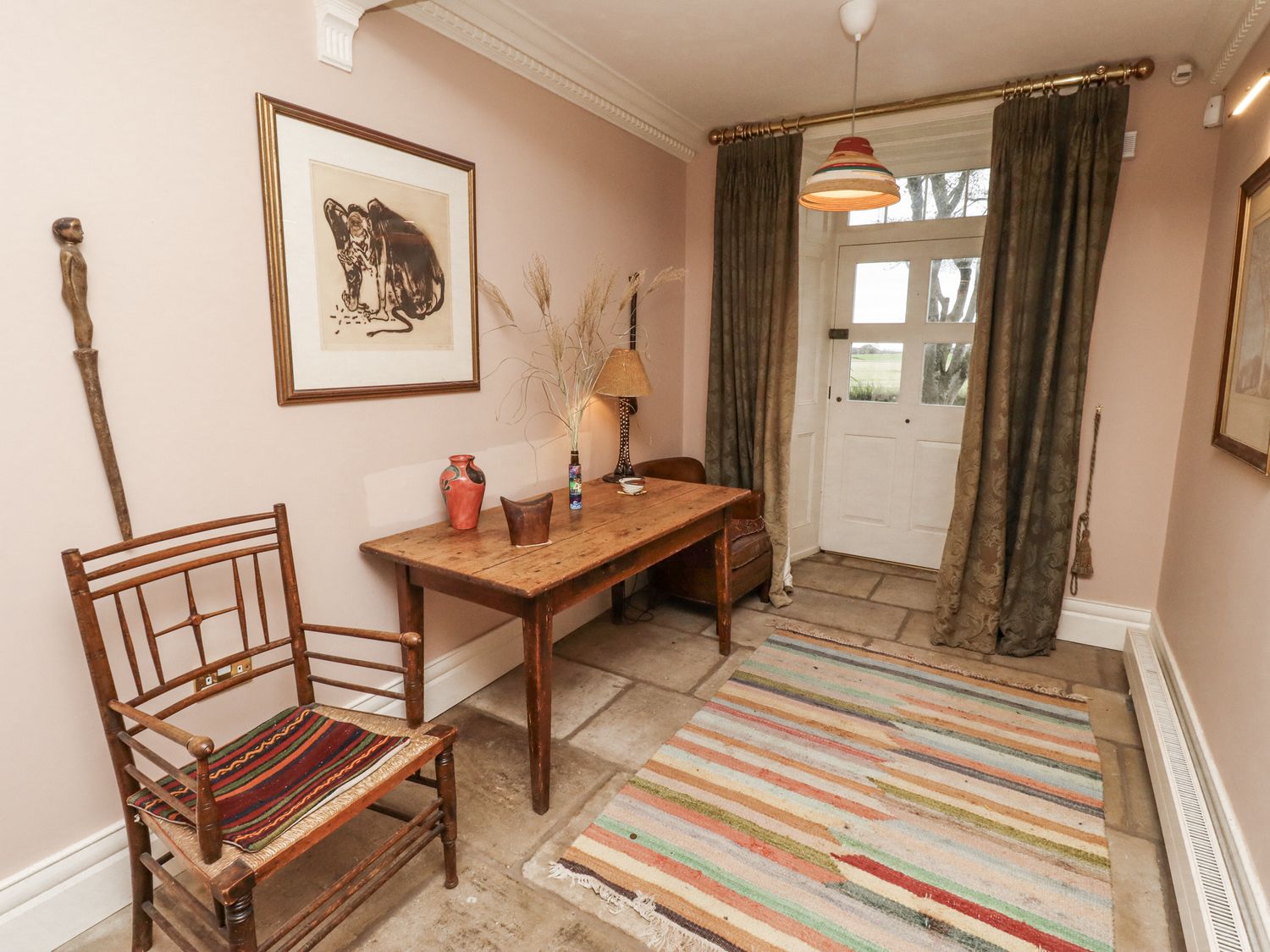 "Elford Farmhouse in Elford near Seahouses, Northumberland, sleeps ten guests in five bedrooms. The property consists of a kitchen/diner with an AGA, fridge/freezer, kettle, toaster, a utility with washing machine and tumble dryer, a dining room, library, sitting room with open fire, snug, sunroom, and a lower-ground-floor games room. The bedrooms include a super-king-size with balcony and en-suite freestanding bath and walk-in shower, a king-size with en-suite bath and shower over, a double with en-suite walk-in shower, a further king-size and double, serviced by a bathroom and cloakroom. Outside, there is an enclosed rear garden with patio, lawn, furniture, hot tub, and off-road parking for five cars. Two well-behaved pets welcome. Sorry, no smoking. Shop 2.3 miles, pub 2.5 miles. WiFi, fuel, power, bed linen and towels are all included in the price. Elford Farmhouse is a spacious base for exploring Northumberland. Note: Stone steps down to the games room. Note: Pets must be kept downstairs and off the furniture. Note: This property has a Good Housekeeping Bond of 600 GBP."