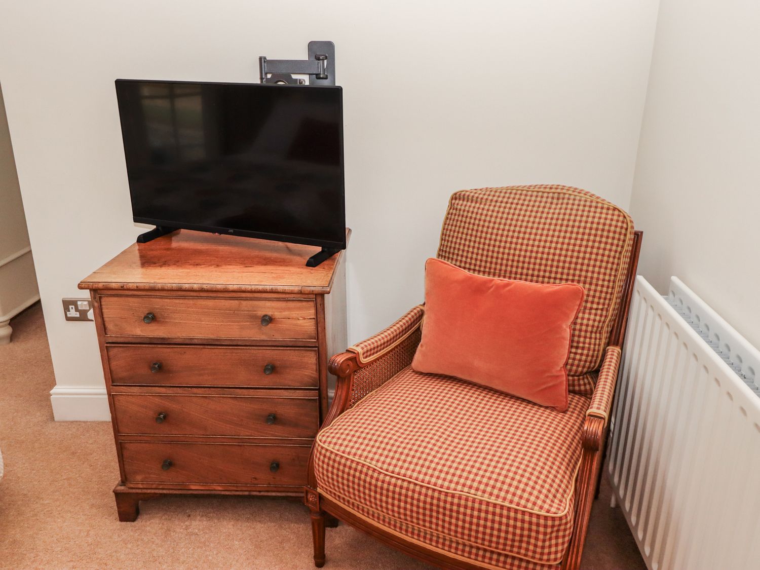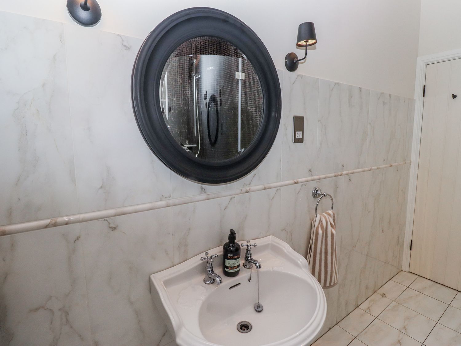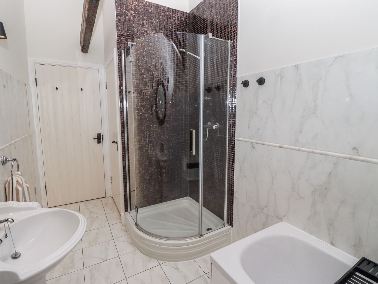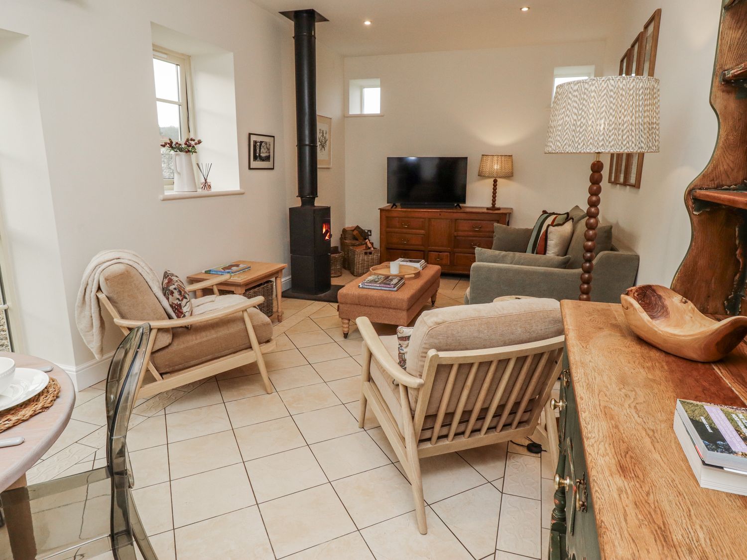 "Two bedrooms: 1 x super king size, 1 x king size. Bathroom with bath, walk-in shower, basin and WC. Downstairs cloakroom with basin and WC. Kitchen. Lounge/diner with woodburning stove."