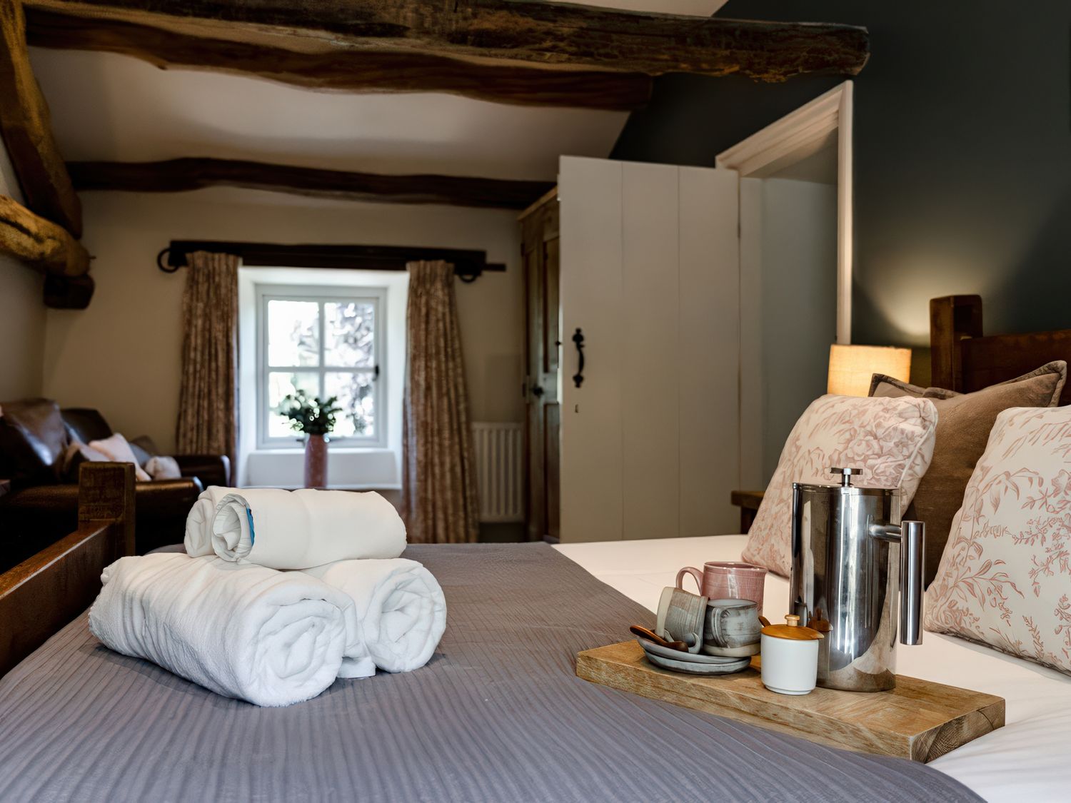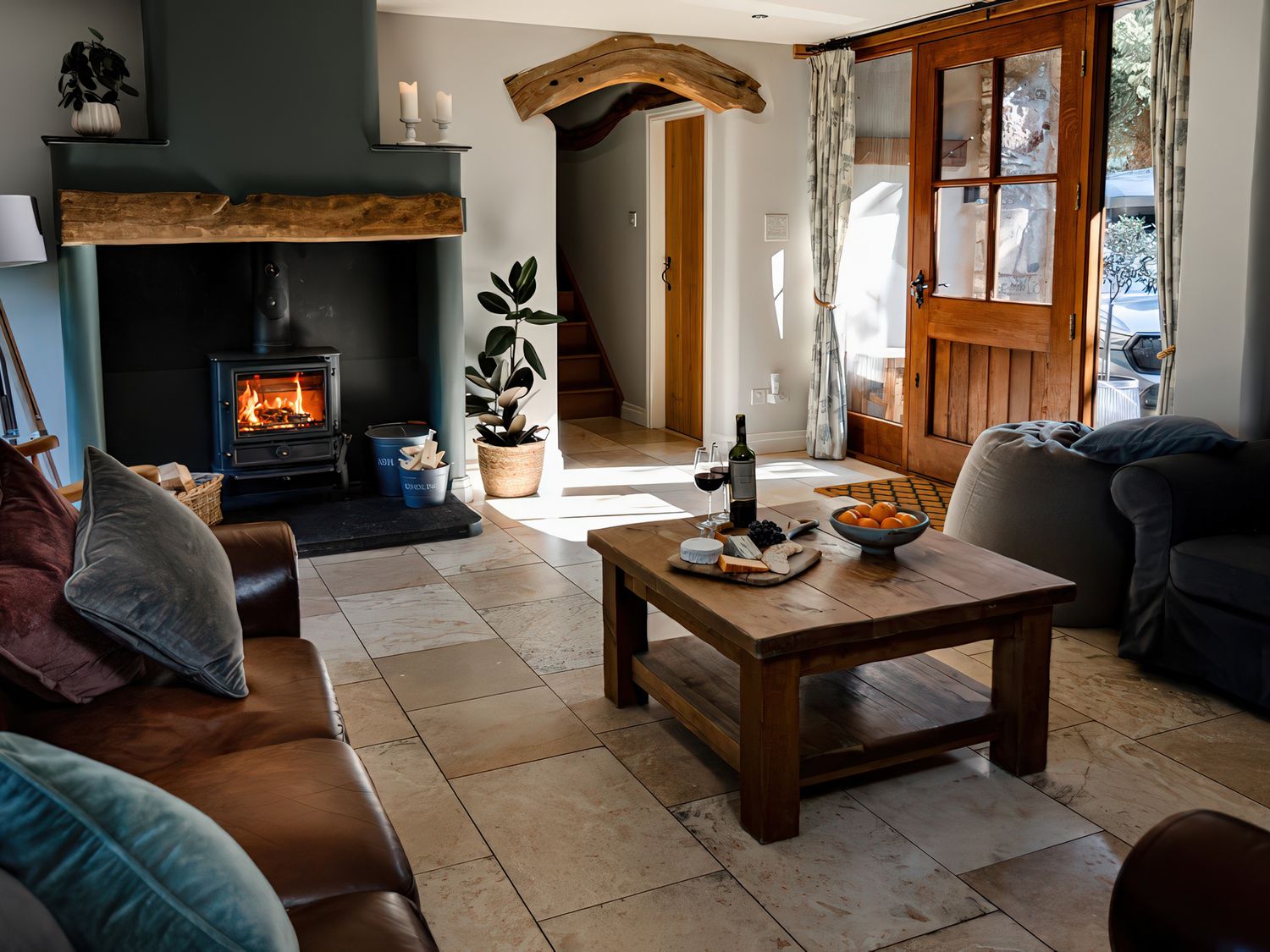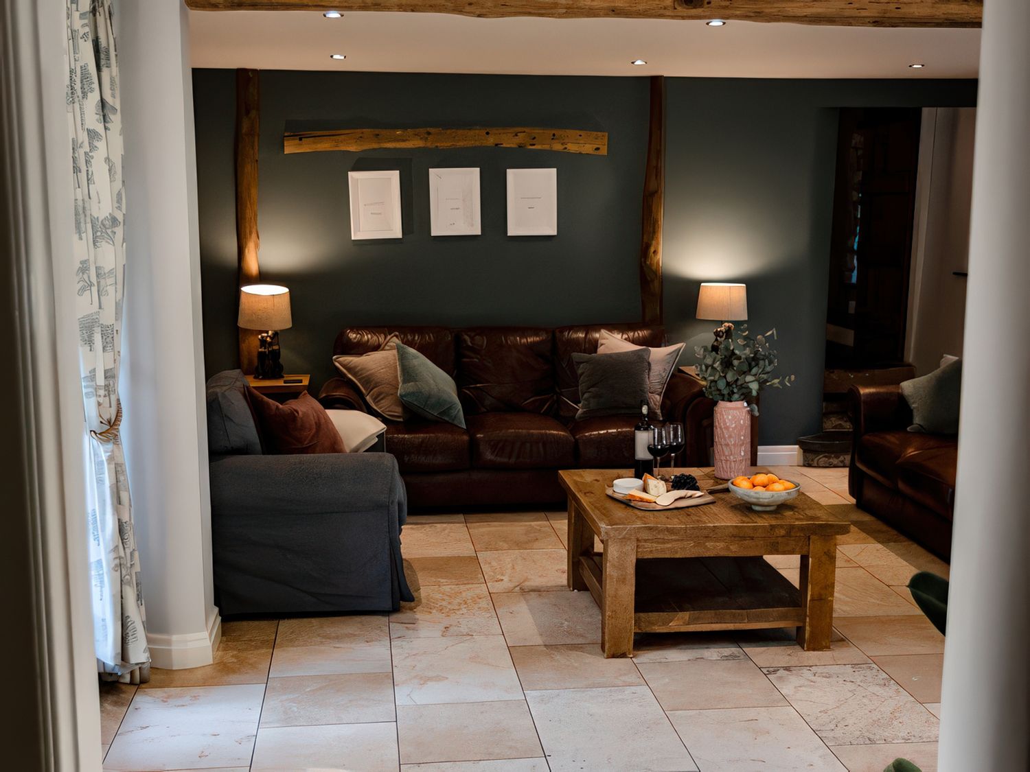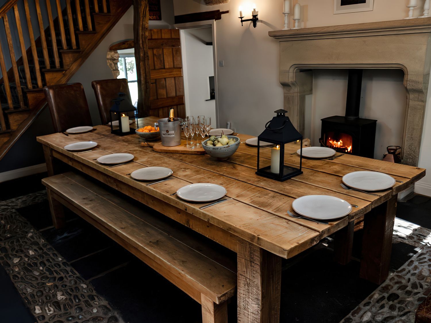 "Over two floors. Six bedrooms; 1 x king-size, 1 x king size, 1 x four poster king-size bed, 1 x ground-floor king-size with en-suite bathroom with waterfall shower, 1 x double with ensuite, 1 x twin. Bathroom with bath, separate walk-in shower, basin and WC. Ground-floor bathroom, with bath and shower over, basin and WC. Kitchen. Sitting room with woodburner. Dining room with woodburner. Snug. Utility. "