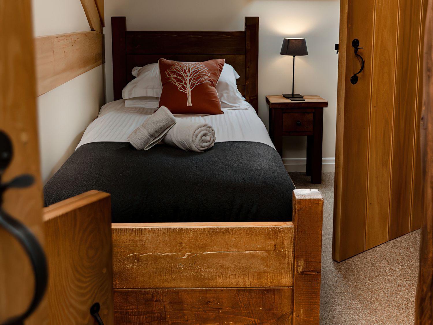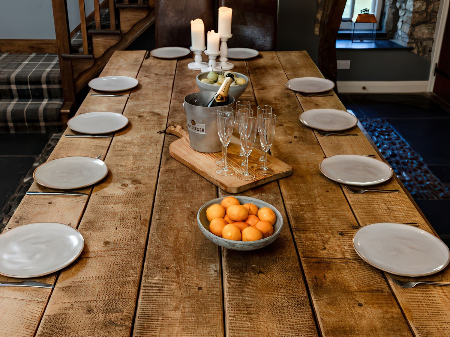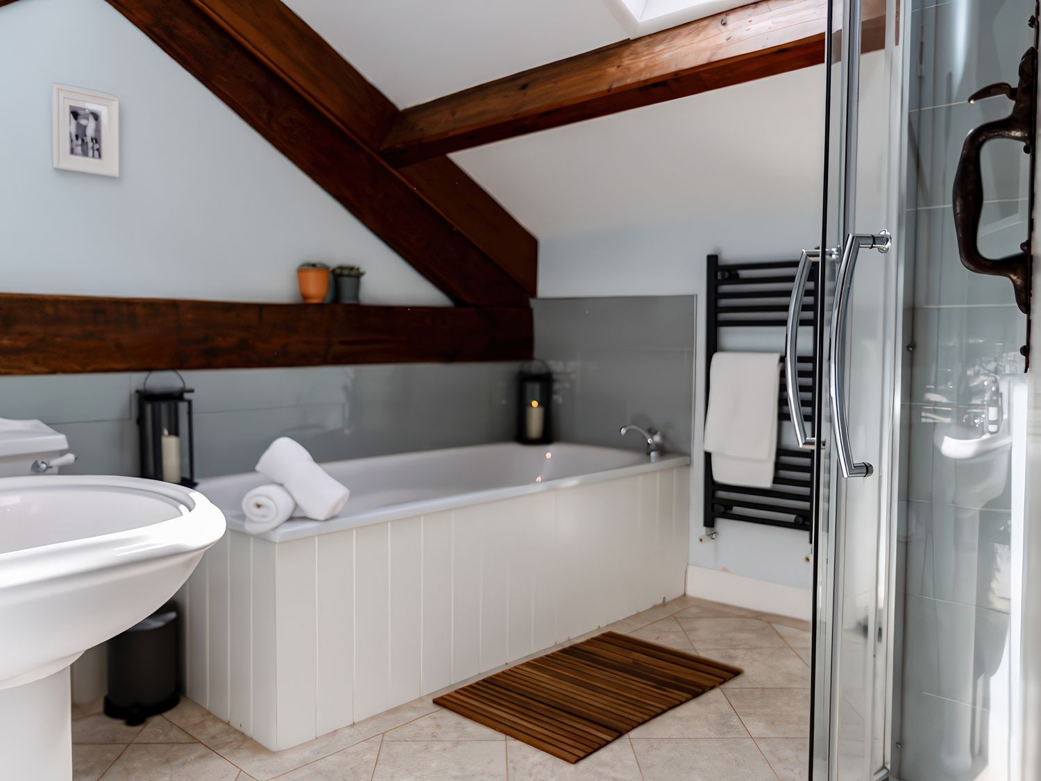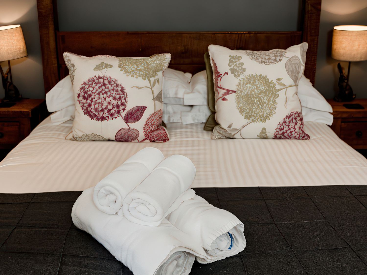 "Over two floors. Six bedrooms; 1 x king-size, 1 x king size, 1 x four poster king-size bed, 1 x ground-floor king-size with en-suite bathroom with waterfall shower, 1 x double with ensuite, 1 x twin. Bathroom with bath, separate walk-in shower, basin and WC. Ground-floor bathroom, with bath and shower over, basin and WC. Kitchen. Sitting room with woodburner. Dining room with woodburner. Snug. Utility. "