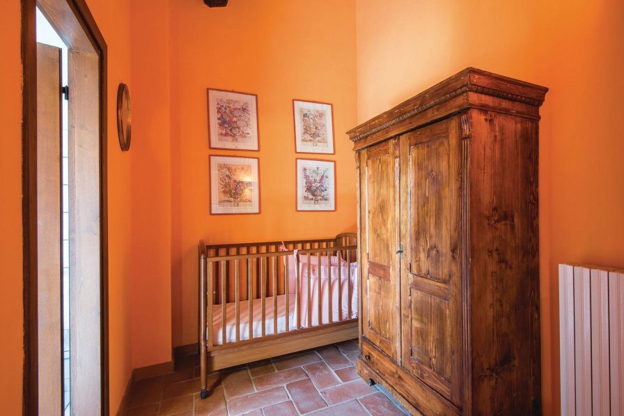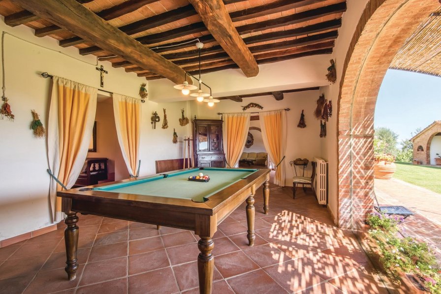 Take the opportunity to spend your holiday in this traditional Italian country house. The beautiful farmhouse expects you amid the green hills overlooking the Chiana-Valley. It has been tastefully renovated while taking account of the original style and converted into a comfortable country residence. The equipment and furnishings are characteristic and elegant and give the house the typical flavor of Tuscan country houses. Here you can take the everyday meals in a very chic atmosphere sitting around the large table, whilst admiring the beautiful arches in the adjacent dining room. In the bedrooms you can relax in an ambiance of burnt colors. The kitchen is a dream of exclusive amenities and comfort. The many Italian details will make every cooks' heart beat faster. The house faces a green valley and is surrounded by a property of 35 hectares with large grassy areas, woods, olive tree groves and vineyards. A natural meadow frames the swimming pool. The house's position allows you to easily and quickly reach the main tourist destinations of southern Tuscany. Services included in the price: domestic help for 12 hours a week. Please note: The caretaker lives in the nearby hayloft and uses the entrance gate and the path that leads to the house. Some distances and suggestions for daily trips: 3.5 km from Sinalunga (all kinds of shops), 18 km Montepulciano, 30 km Cortona, 49 km Arezzo, 50 km Siena, 110 km Florence.