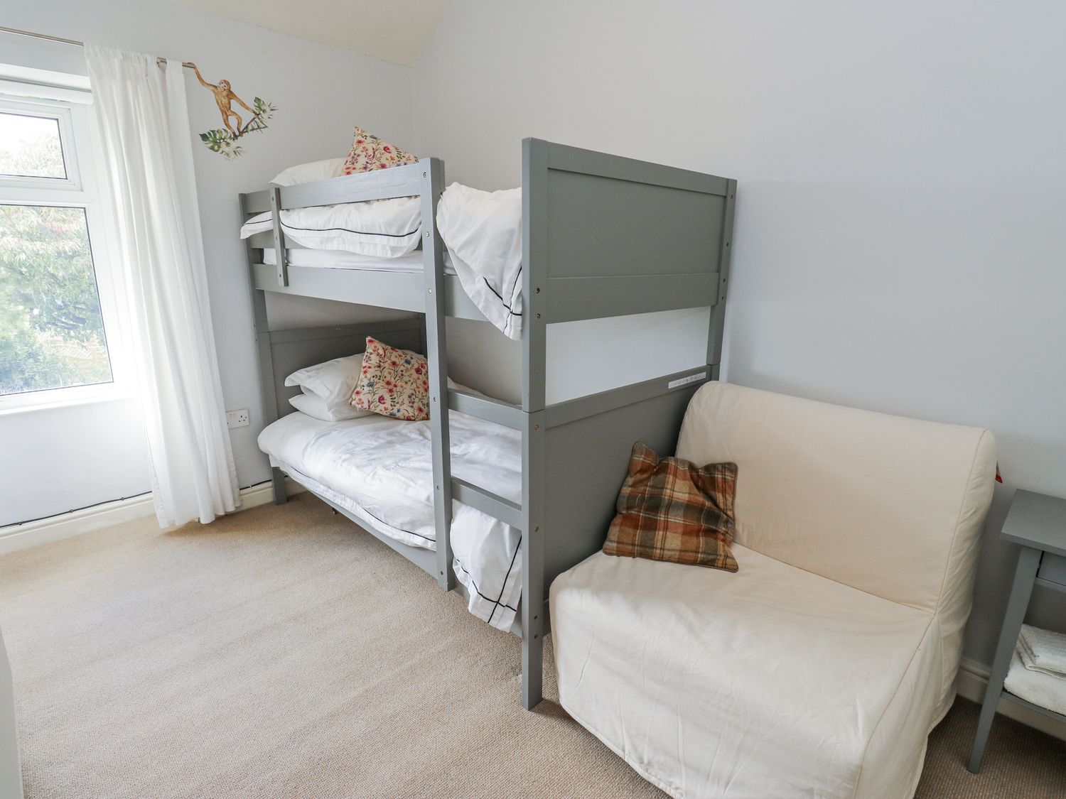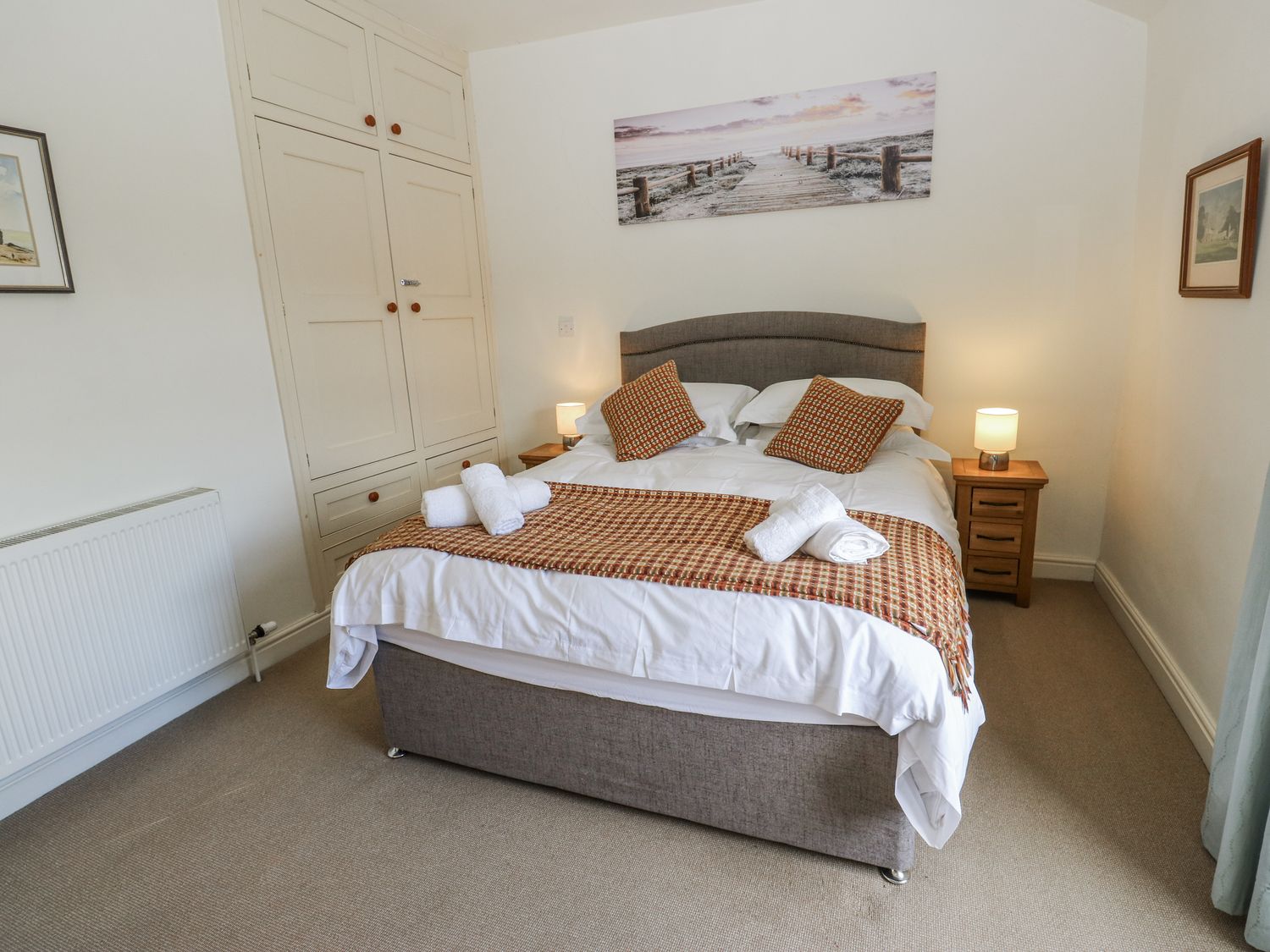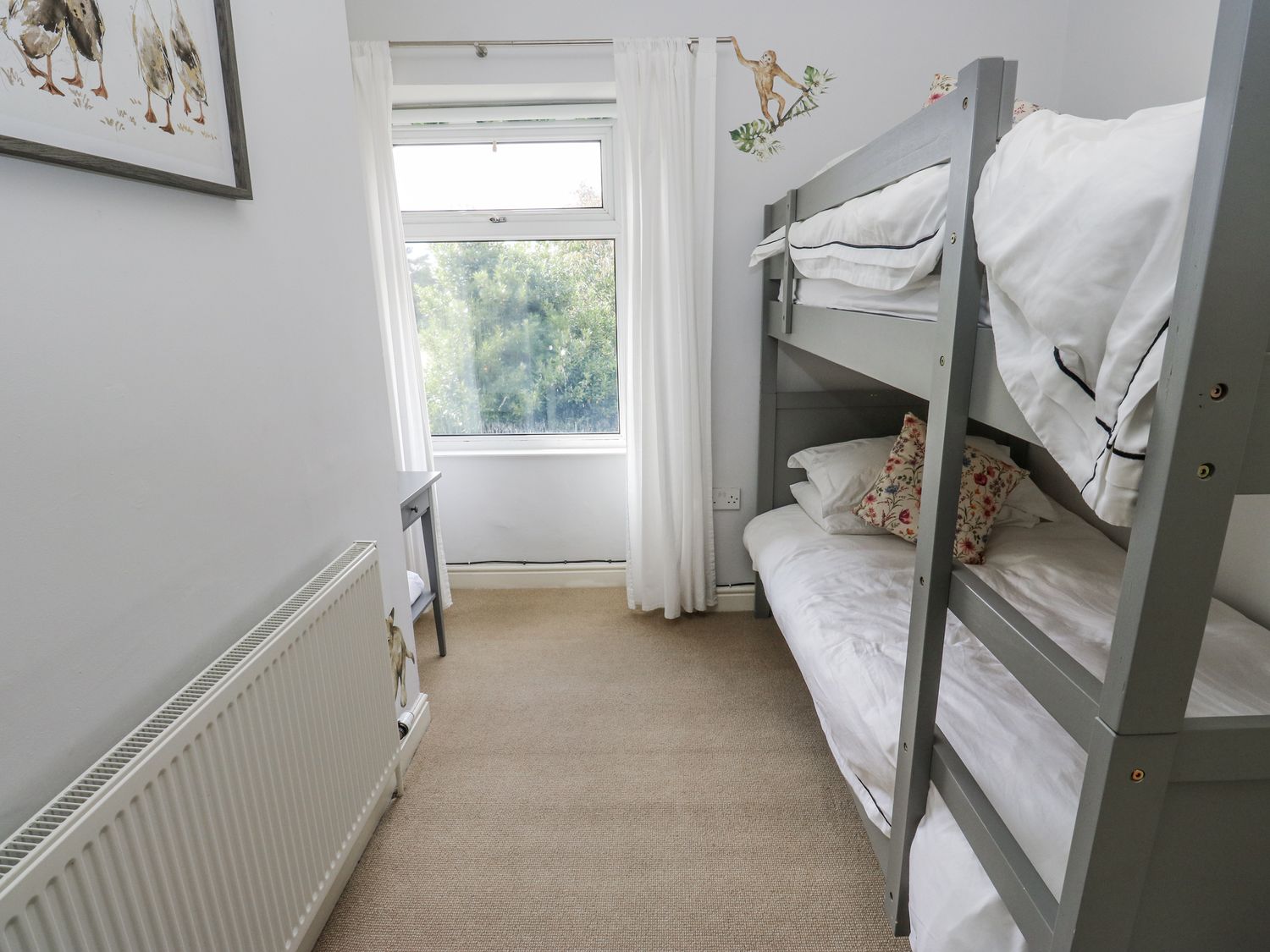 "Two bedrooms: 1 x king-size, 1 x child's bunk bed. Shower room with walk-in shower, basin, heated towel rail and WC. Kitchen/diner. Sitting room with gas fire"
