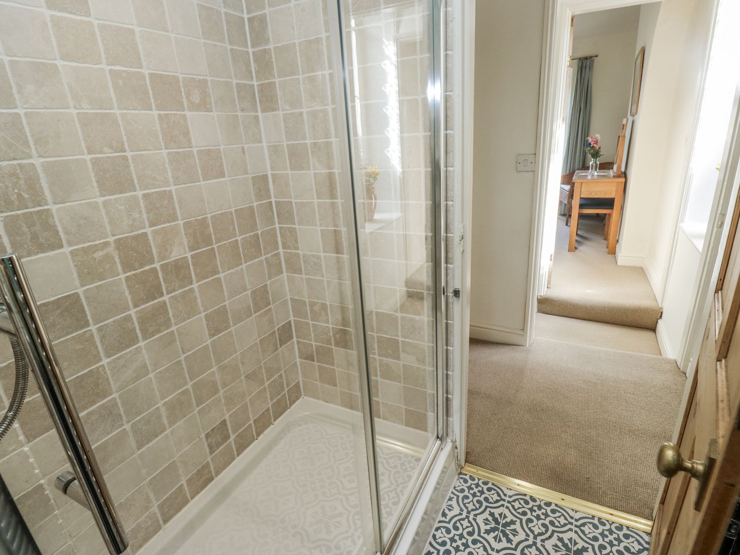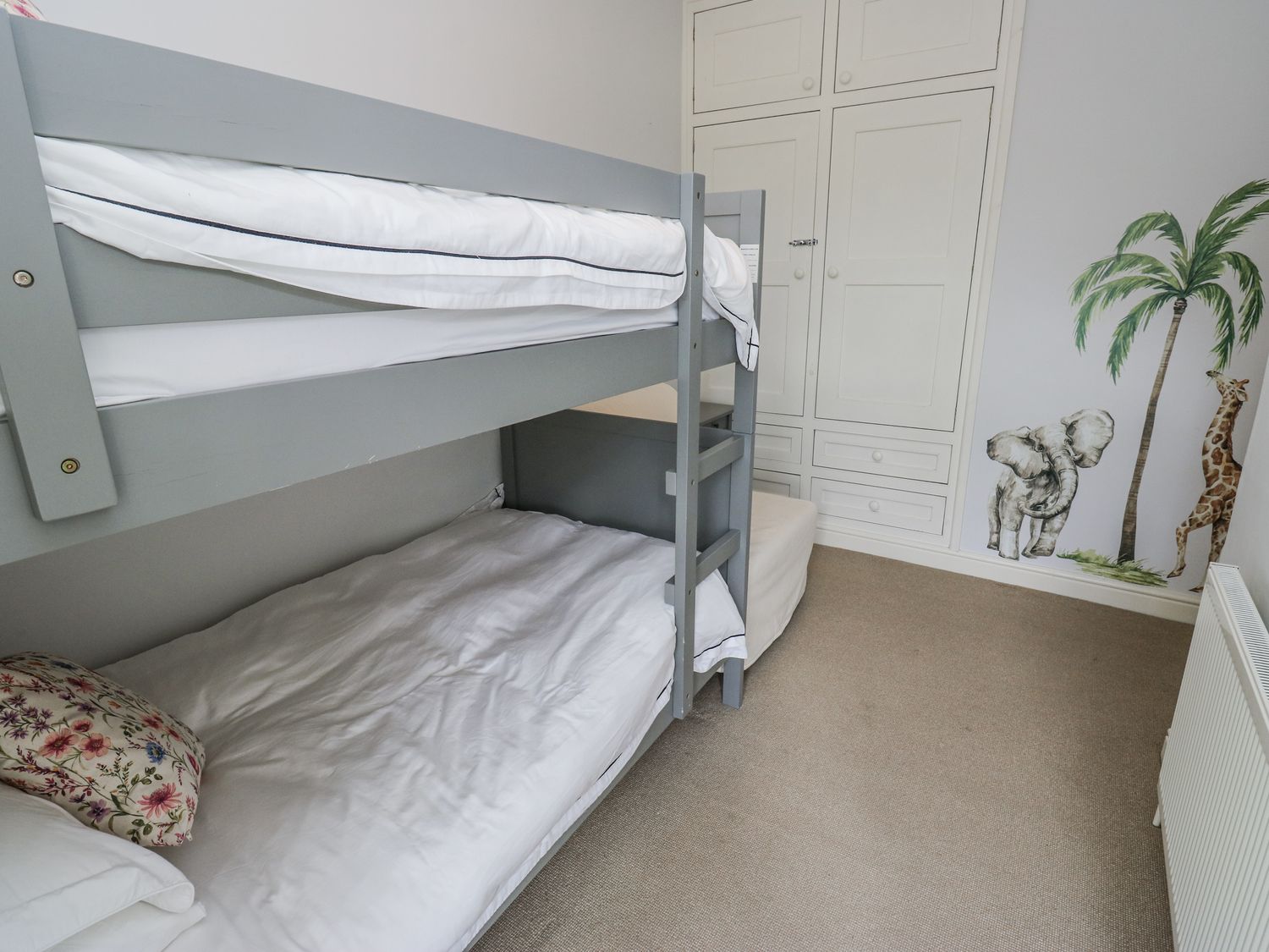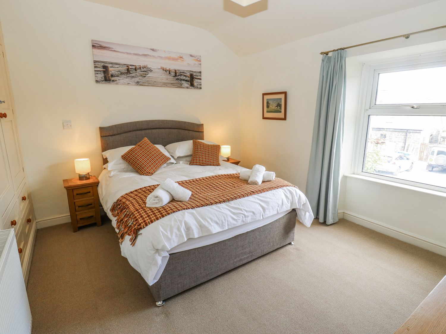 "Two bedrooms: 1 x king-size, 1 x child's bunk bed. Shower room with walk-in shower, basin, heated towel rail and WC. Kitchen/diner. Sitting room with gas fire"