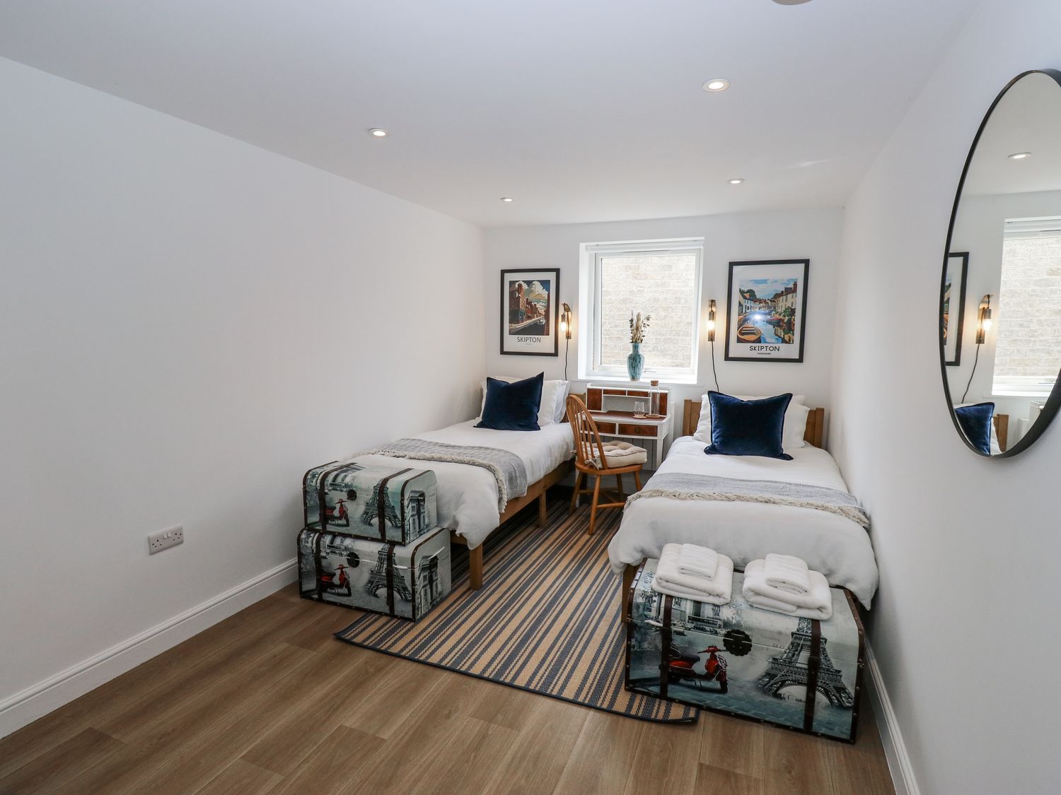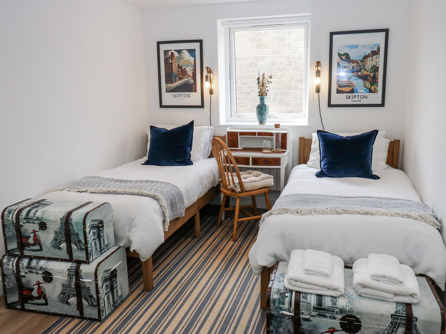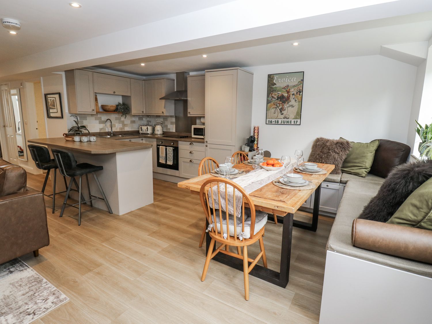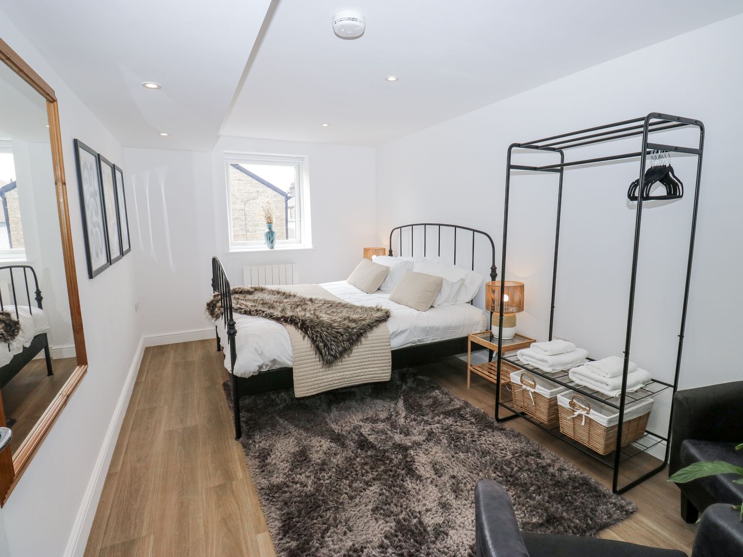 "Apartment 5, a ground-floor apartment, consists of a kitchen/diner with electric oven, electric hob, microwave, fridge/freezer, washer/dryer, dishwasher, kettle, toaster, dining table seating for four, and breakfast bar seating for two, and a sitting room with Smart TV and corner sofa. The bedrooms consist of a king-size and twin. There is a bathroom with bath, shower over, basin, and WC. WiFi, fuel, power, bed linen, and towels are included in the rent. Outside, there is an enclosed rear garden with patio and seating, and underground allocated parking for one car, plus visitor parking. Sorry, no pets and no smoking. Uncover the best of North Yorkshire and its surrounding areas with a holiday at Apartment 5.