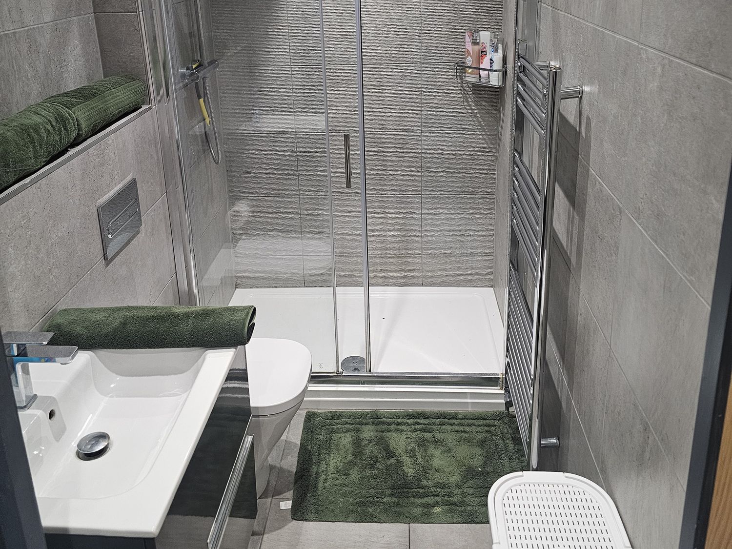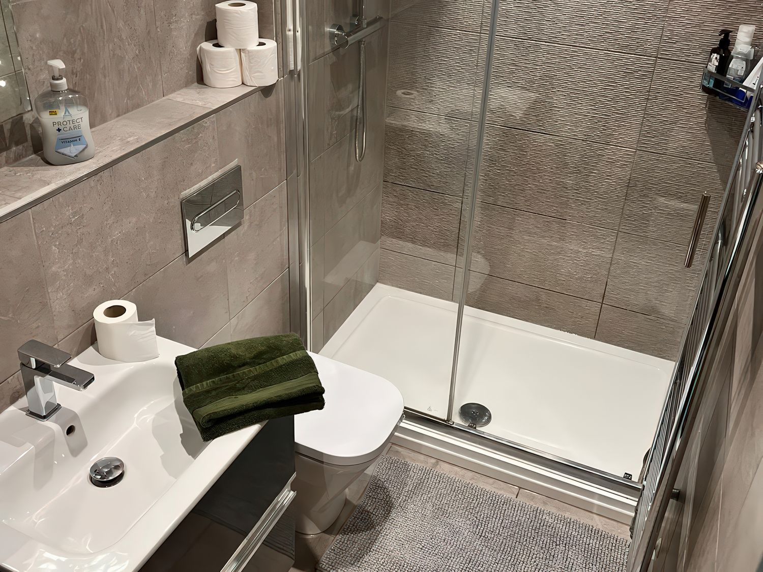 "Second-floor apartment. Two bedrooms: 1 x double, 1 x sofa bed in sitting area. Shower room with walk-in shower, basin, heated towel rail and WC. Open-plan living space with kitchen, dining area and sitting area"