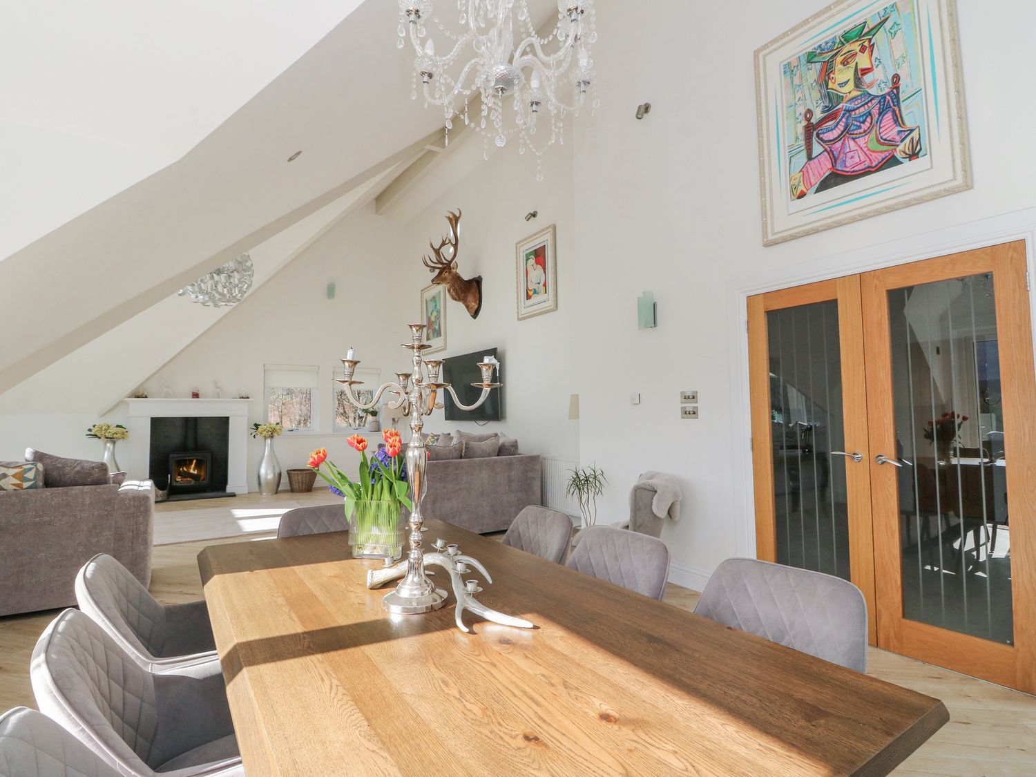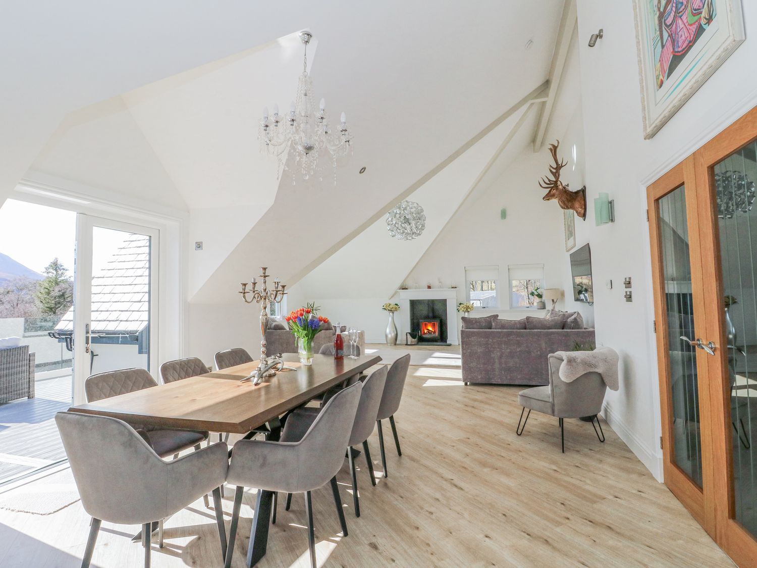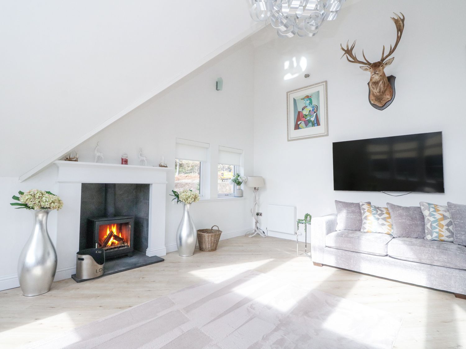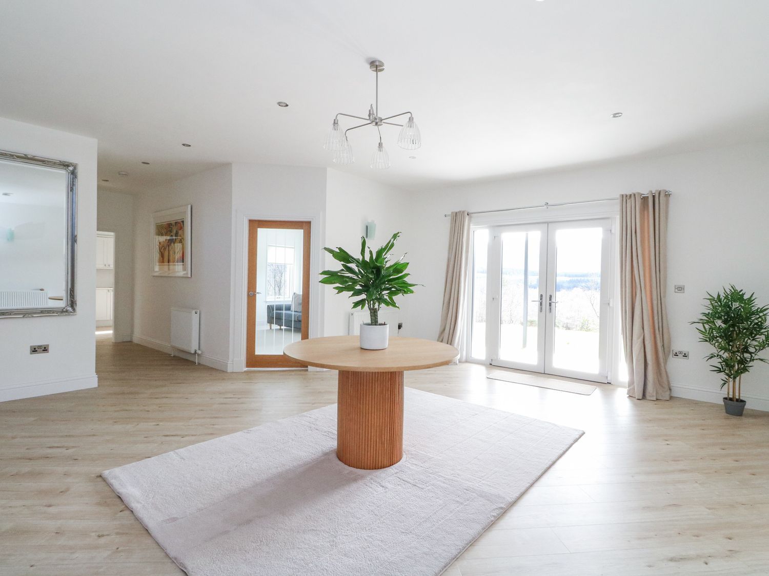 "Macgregor Ranch features a spacious open-plan living area with kitchen (electric oven/hob, microwave, fridge/freezer, dishwasher, wine chiller), dining for 10, sitting area with Smart TV, woodburning stove, and balcony. There's also a separate kitchen/diner, utility (washer/dryer), and sitting room with Smart TV. Bedrooms include: ground floor ÔÇô 2 super-king with en-suites, 1 king with en-suite; first floor ÔÇô 1 super-king with en-suite, 1 king with TV and en-suite. WiFi, fuel, power, bed linen, and towels included. Outside: lawn, patio with furniture, hot tub, and parking for 8 cars. No pets/smoking. Shop 2.2 miles, pub 2.3 miles. Note: No access to games room. Max stay 4 nights. Holiday use only ÔÇô no worker/contractor, stag, hen, or similar bookings. Note: This property has a Good Housekeeping bond of -ú600."