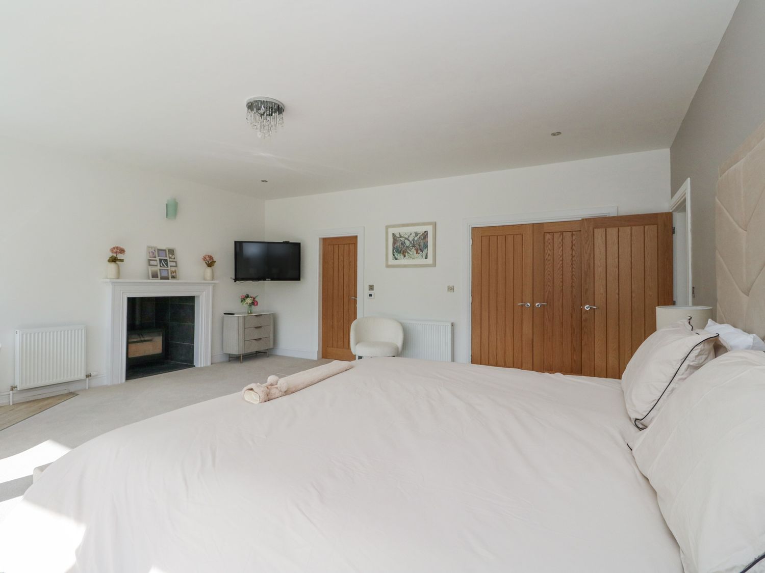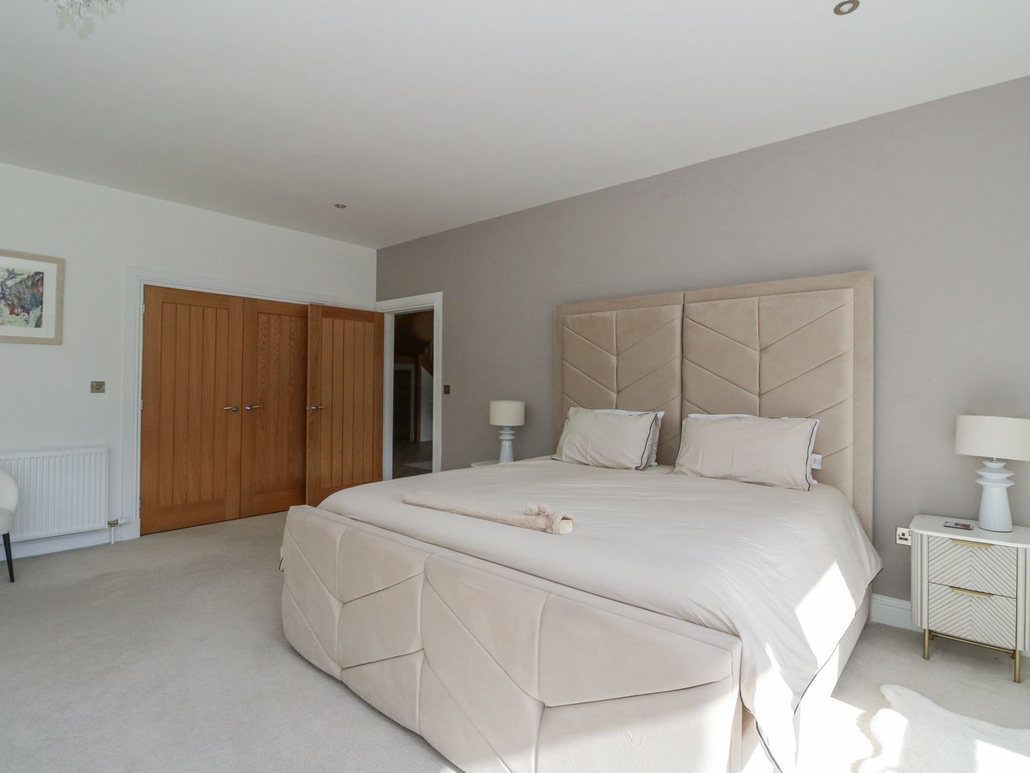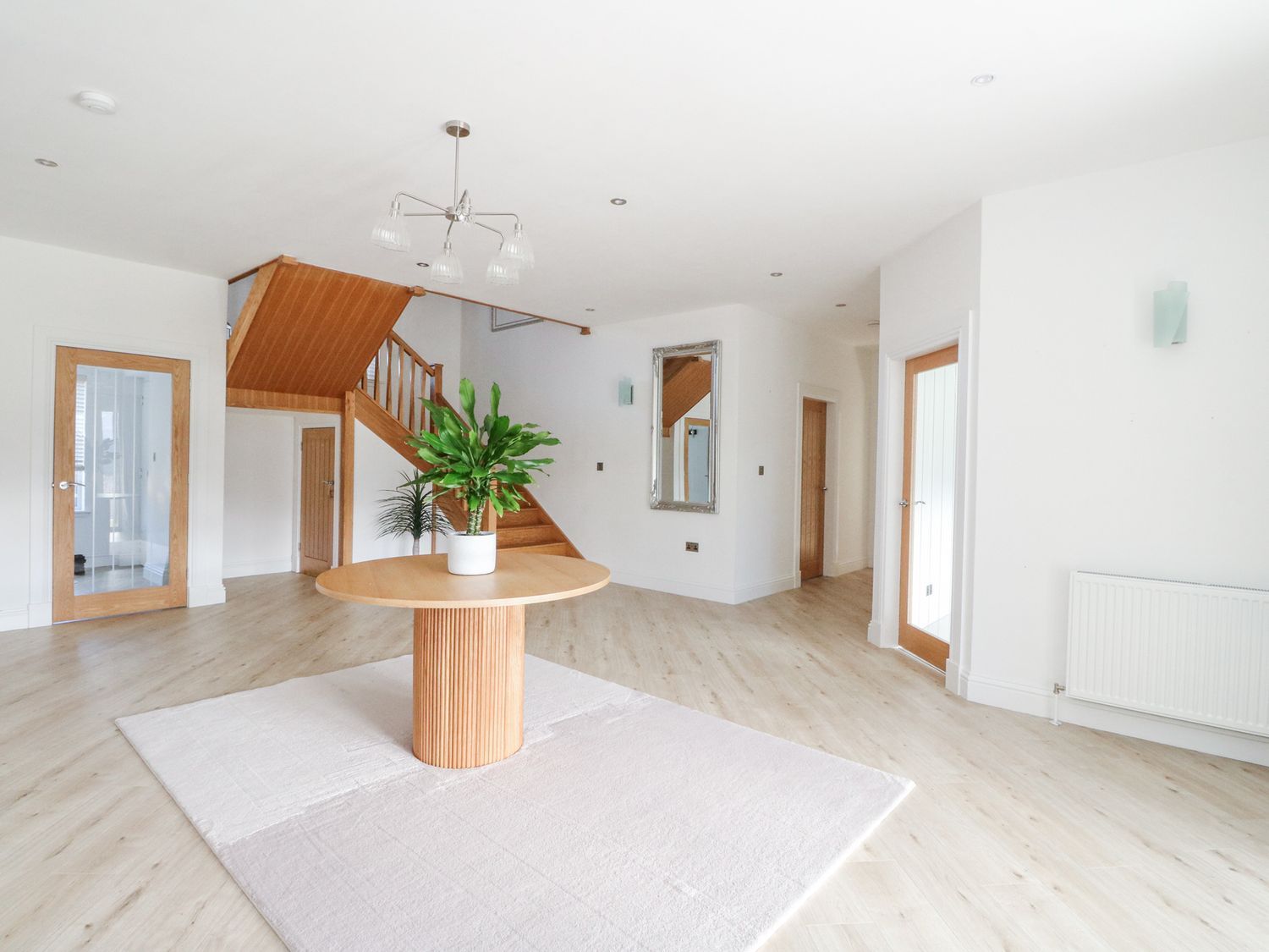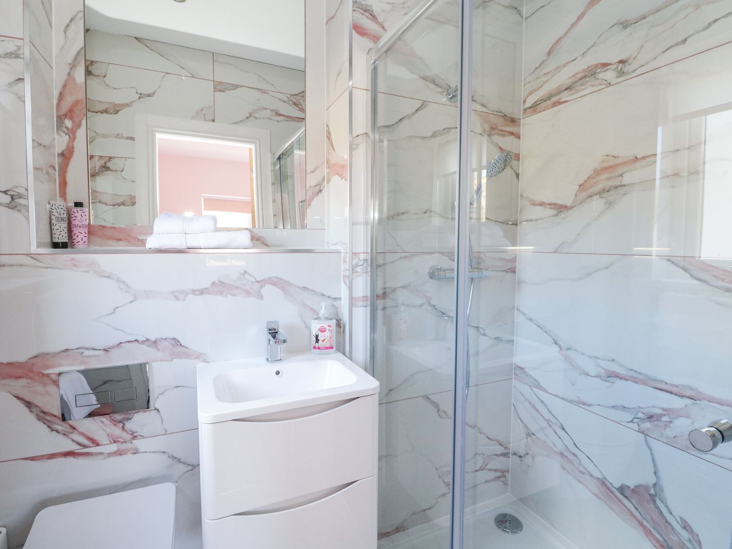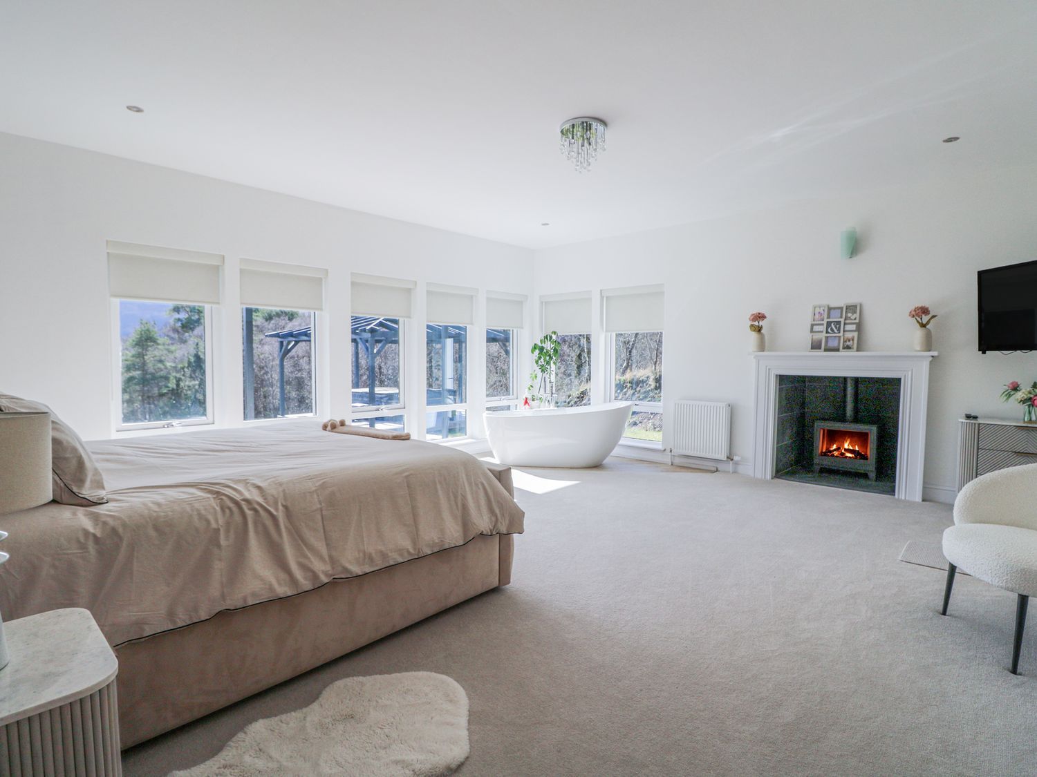 "Reverse-level. Five bedrooms. 1 x ground-floor super-king-size with Smart TV, woodburning stove, free-standing bath, and en-suite walk-in shower, basin, heated towel rail, and WC, 1 x ground-floor super-king-size with en-suite walk-in shower, basin, heated towel rail, and WC., 1 x ground-floor king-size with en-suite walk-in shower, heated towel rail, basin, and WC, 1 x super-king-size with en-suite walk-in shower, heated towel rail, basin, and WC, 1 x king-size with TV and en-suite with bath, shower over, basin, and WC. Cloakroom with basin and WC. 2 x first-floor cloakroom with basin and WC. Kitchen/diner. Utility. Sitting room. First-floor open-plan living space with kitchen, dining area, and sitting area with woodburning stove and access to balcony with furniture. Please note this property only accepts booking checking in on a Saturday for bookings of a week long. "
