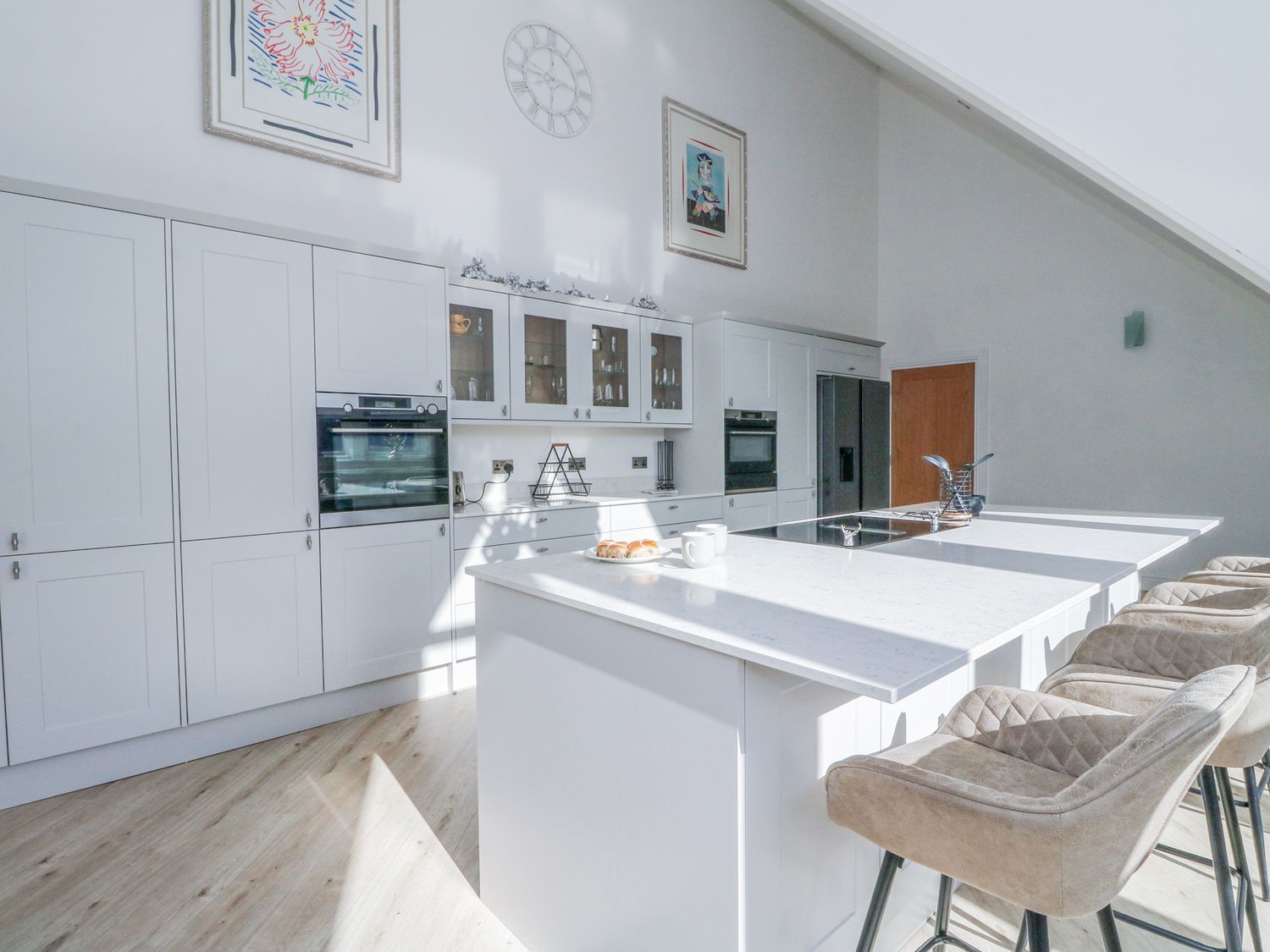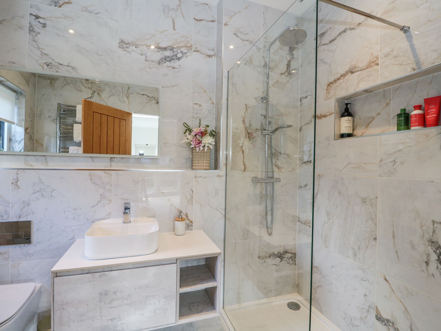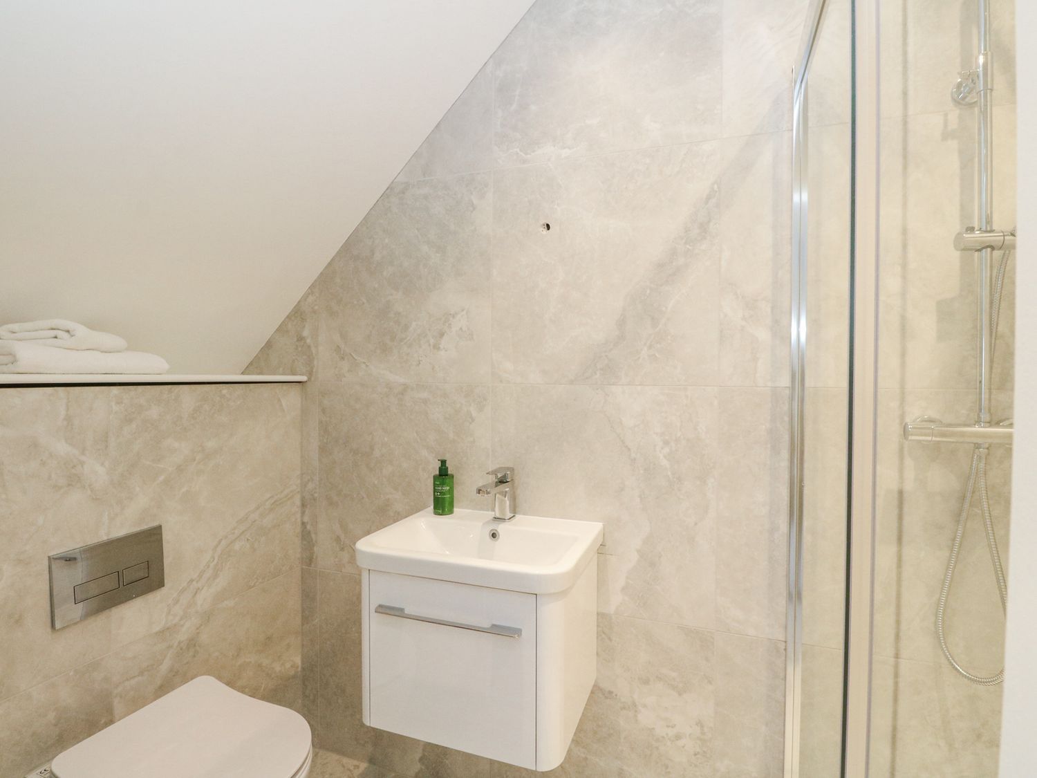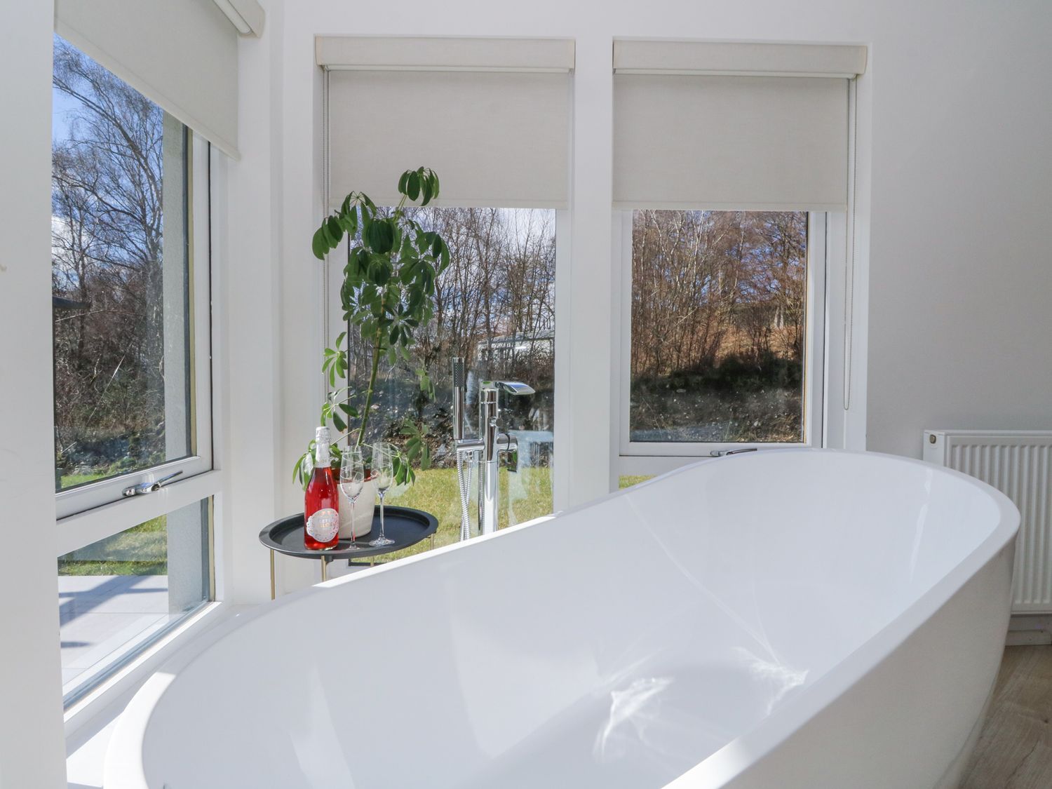 "Reverse-level. Five bedrooms. 1 x ground-floor super-king-size with Smart TV, woodburning stove, free-standing bath, and en-suite walk-in shower, basin, heated towel rail, and WC, 1 x ground-floor super-king-size with en-suite walk-in shower, basin, heated towel rail, and WC., 1 x ground-floor king-size with en-suite walk-in shower, heated towel rail, basin, and WC, 1 x super-king-size with en-suite walk-in shower, heated towel rail, basin, and WC, 1 x king-size with TV and en-suite with bath, shower over, basin, and WC. Cloakroom with basin and WC. 2 x first-floor cloakroom with basin and WC. Kitchen/diner. Utility. Sitting room. First-floor open-plan living space with kitchen, dining area, and sitting area with woodburning stove and access to balcony with furniture. Please note this property only accepts booking checking in on a Saturday for bookings of a week long. "